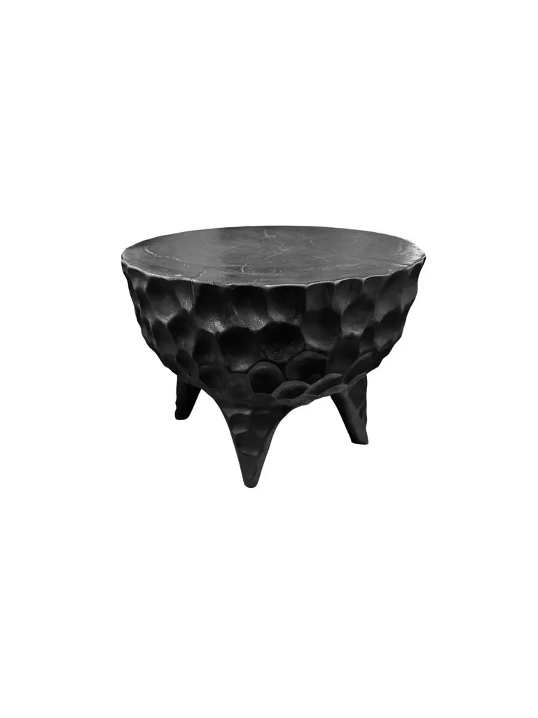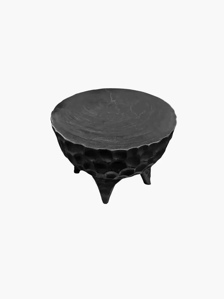 An elegantly rounded, sculptural side table crafted from a single block of mango wood. Unique to this table is the hand-hewn detailing on all sides. The table top was sanded down providing a smooth finish and contrast in texture. To achieve its black pigment the wood was burnt multiple times and finished with a clear coat.