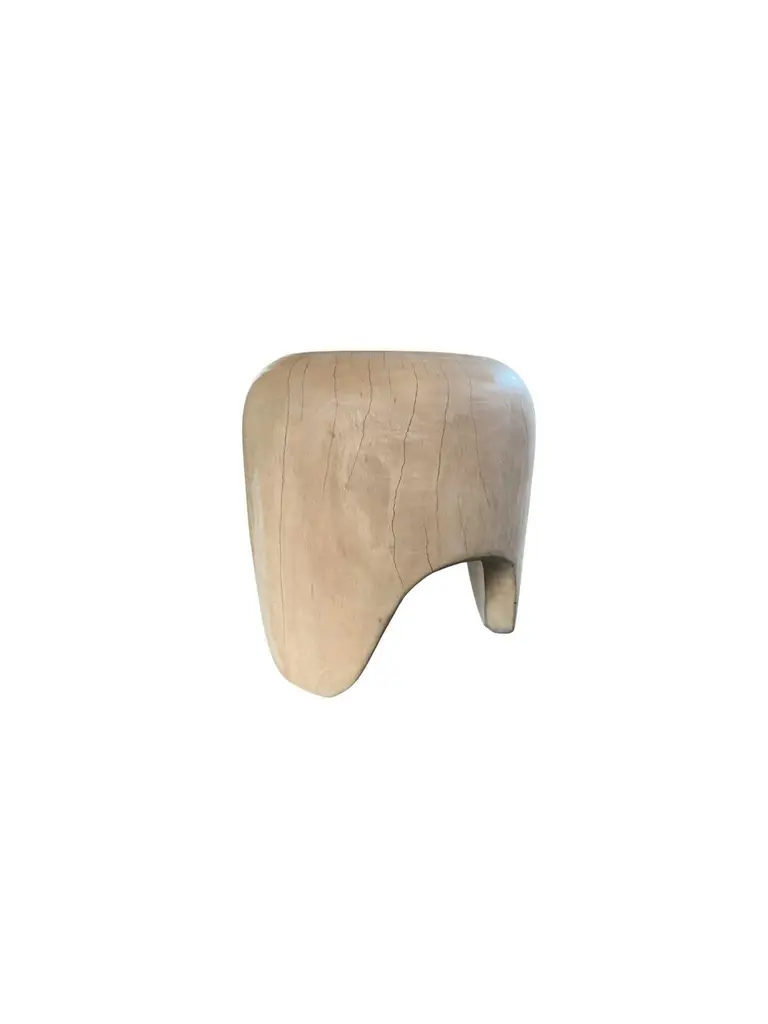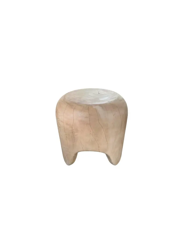 A wonderfully sculptural round side table. Its pigment and texture was achieved through meticulously sanding down the table and then finishing it with a clear coat. A uniquely sculptural and versatile piece. This table features 3 arched legs. It was crafted from a solid block of mango wood.