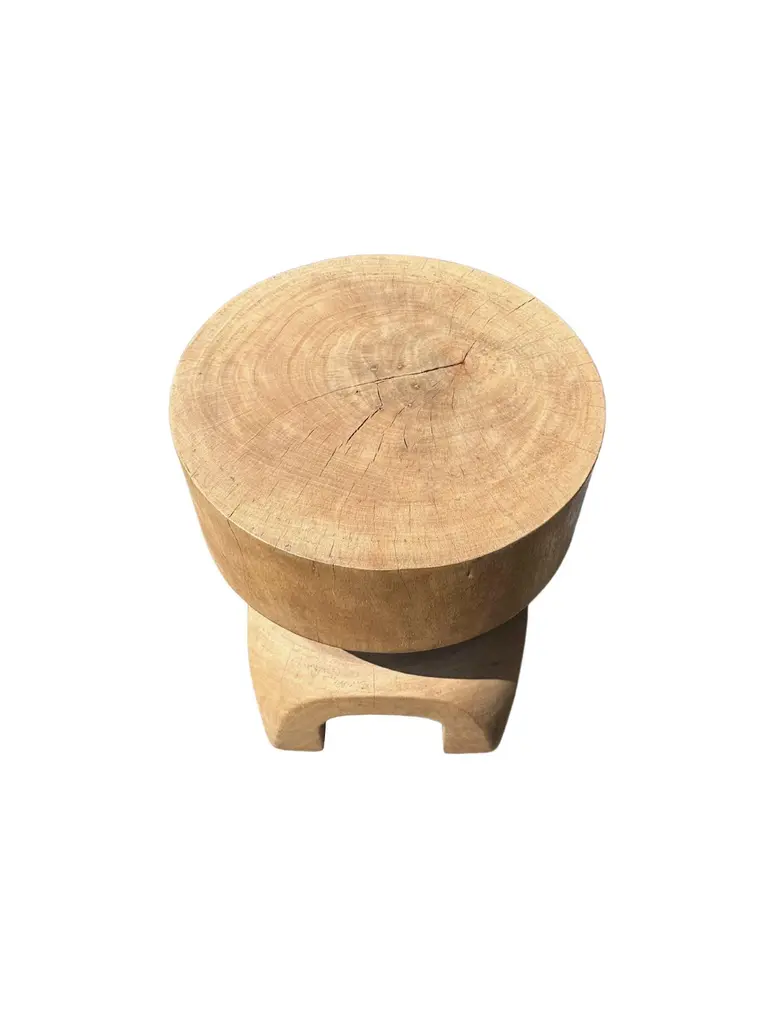 A wonderfully sculptural round side table. Its neutral pigment and subtle wood texture makes it perfect for any space. This table was crafted from mango wood, sanded and smoothed. It features 4 arched legs.