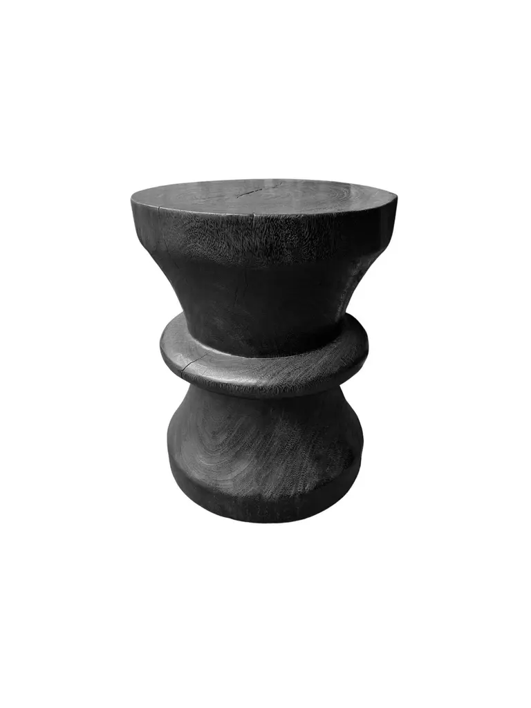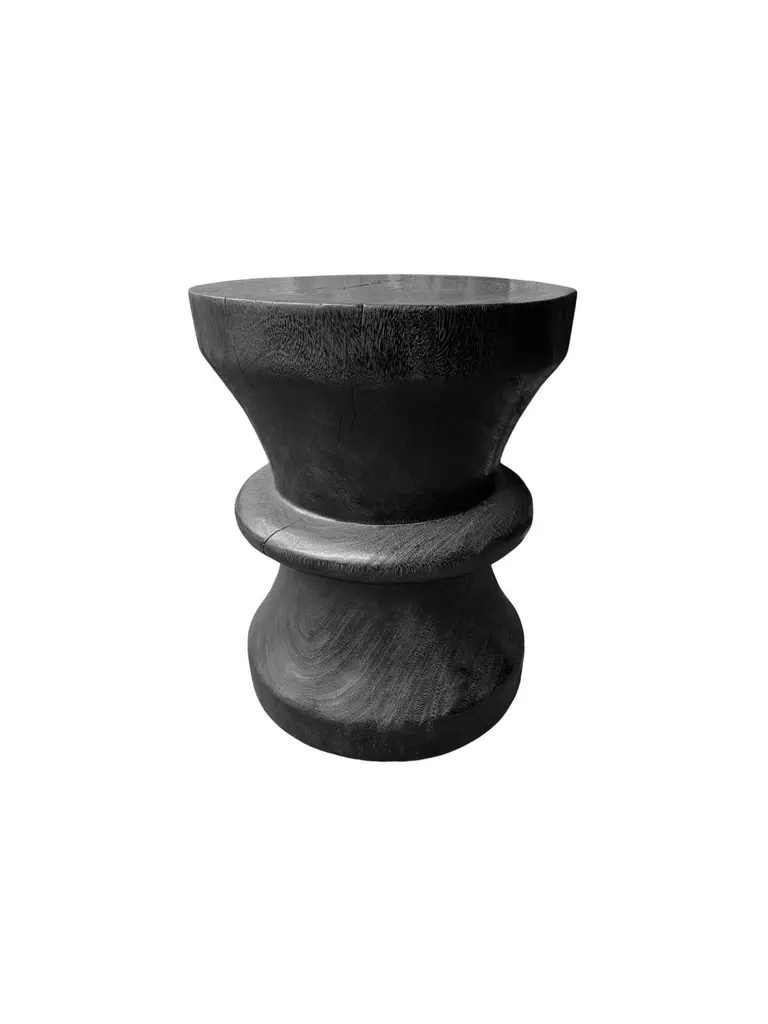 A wonderfully sculptural round side table. Its black pigment was achieved through a burning process creating both a wonderful colour and effect. Its neutral pigment and subtle wood texture makes it perfect for any space. A uniquely sculptural and versatile piece. This table was crafted from mango wood and has a smooth texture.