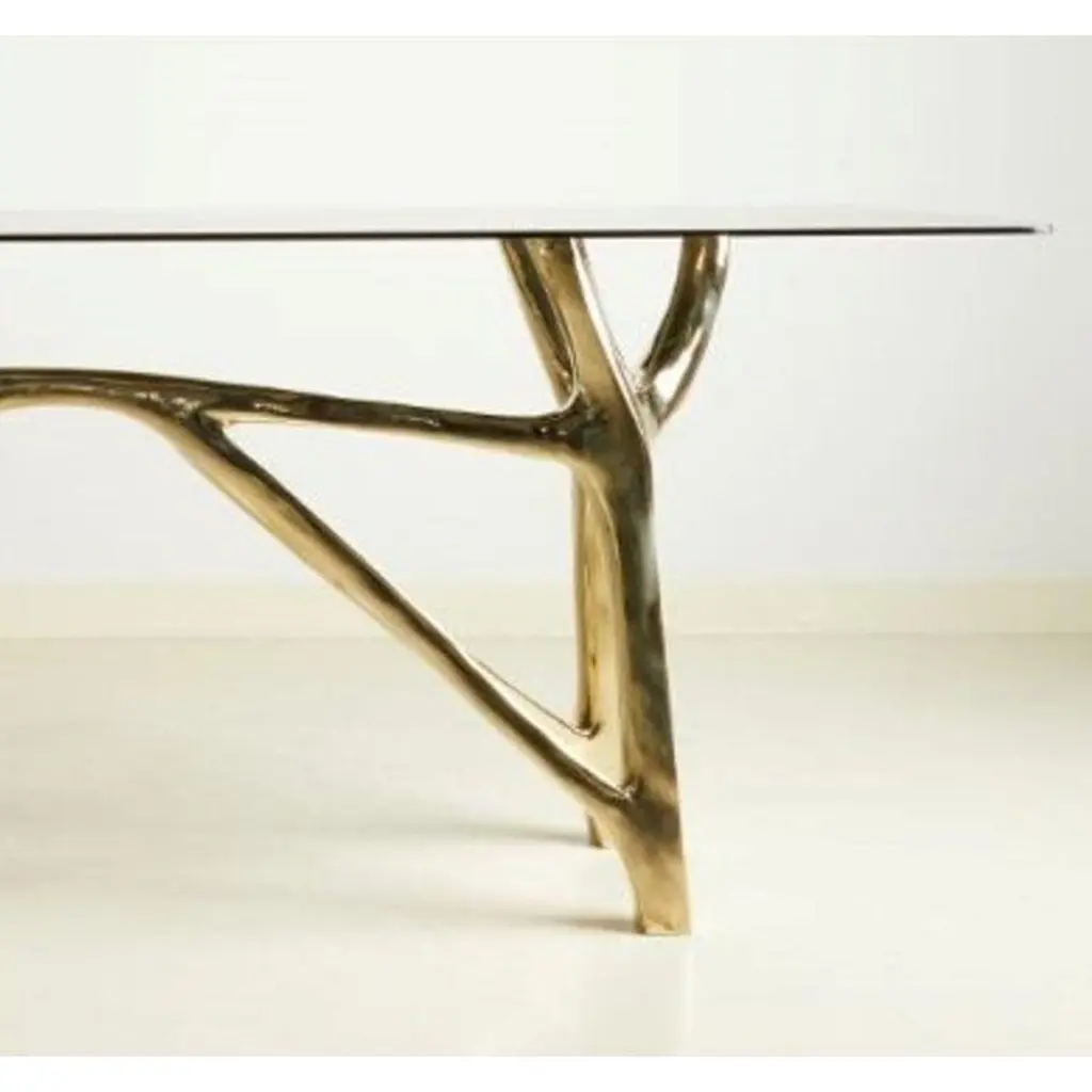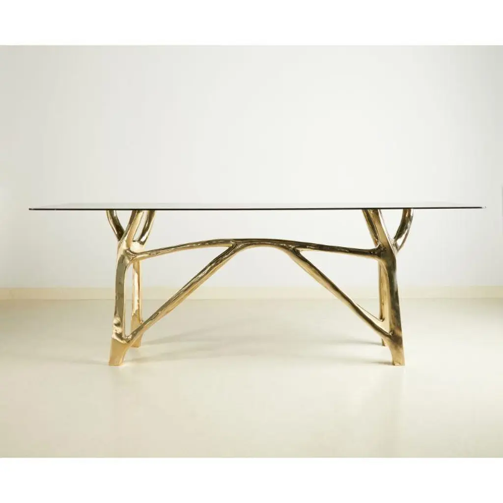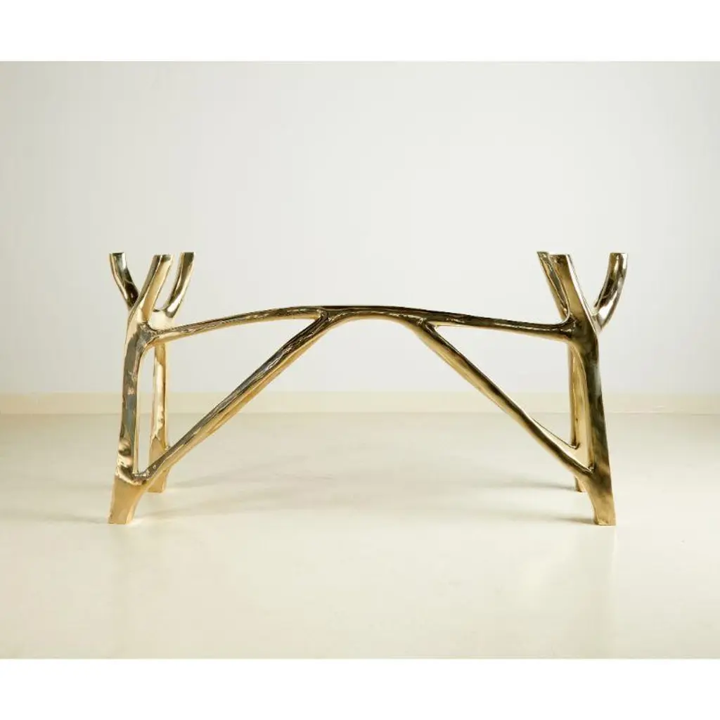 Sculptural Twin Fork Brass Console Table by MisayaDimensions: W 150 x D 37 x H 70 cmMaterials: brassTABLETOP NOT INCLUDEDAlso available in different colors (gold, polished brass, black, painted brass) and materials (wood, marble, or glass tops).MASAYA is our brand’s collection which combines stylishly refined designs with the purity of solid Wood & Marble Tops and Bronze Bases. MASAYA creates both classic and contemporary furniture that fits seamlessly into our everyday lives. As Thailand is globally renowned for its unsurpassed bronze work, products from our collections are often a unique mix of Wood and Bronze home furniture. These include Dining Tables, Coffee Tables, Consoles, Stools, Benches, Chairs, cocktails & Side-Tables both for in-house or outdoor decorations. Our Wood consists of Teak Wood, also available in Makha Wood, Burma Pradauk Wood (also known as Andaman Red Wood), and others to suit your preferences.Additionally, customers can also create custom sized furniture by combining MASAYA models, compatible sizes, Bronze base frames, a wide range of Wood tops of various types and sizes, also available in Marble tops, and colors to perfectly match your choice of perfection.MASAYA furniture is authentic, comfortable, and natural. It is strong, functional, and sturdy. Every product is finished carefully in our own workshops in Thailand. Each design embodies the same refined craftsmanship and adds to create a homely atmosphere. Our furniture design is created to give a naturally elegant look to your household, making you and your guests feel at home and welcome.