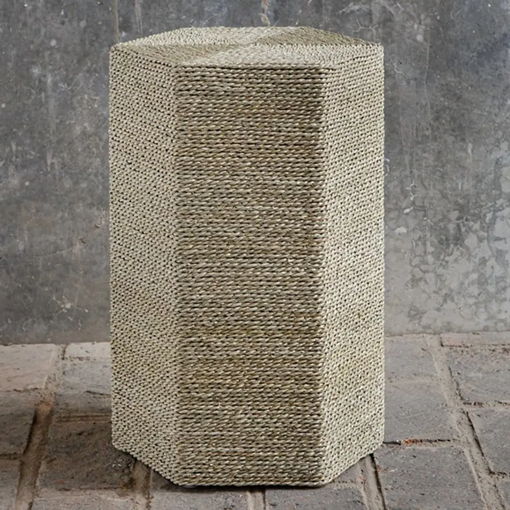 The Sea Braid Accent Table from Uttermost is a contemporary addition to elevate your living space. Crafted in a hexagonal shape, this table exudes charm. This durable side table is skillfully woven with natural braided seagrass and is complemented by a sturdy base made from mahogany and plywood. With its distinctive design and quality materials, this accent table promises to be a chic and functional centerpiece in your home