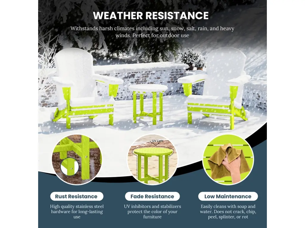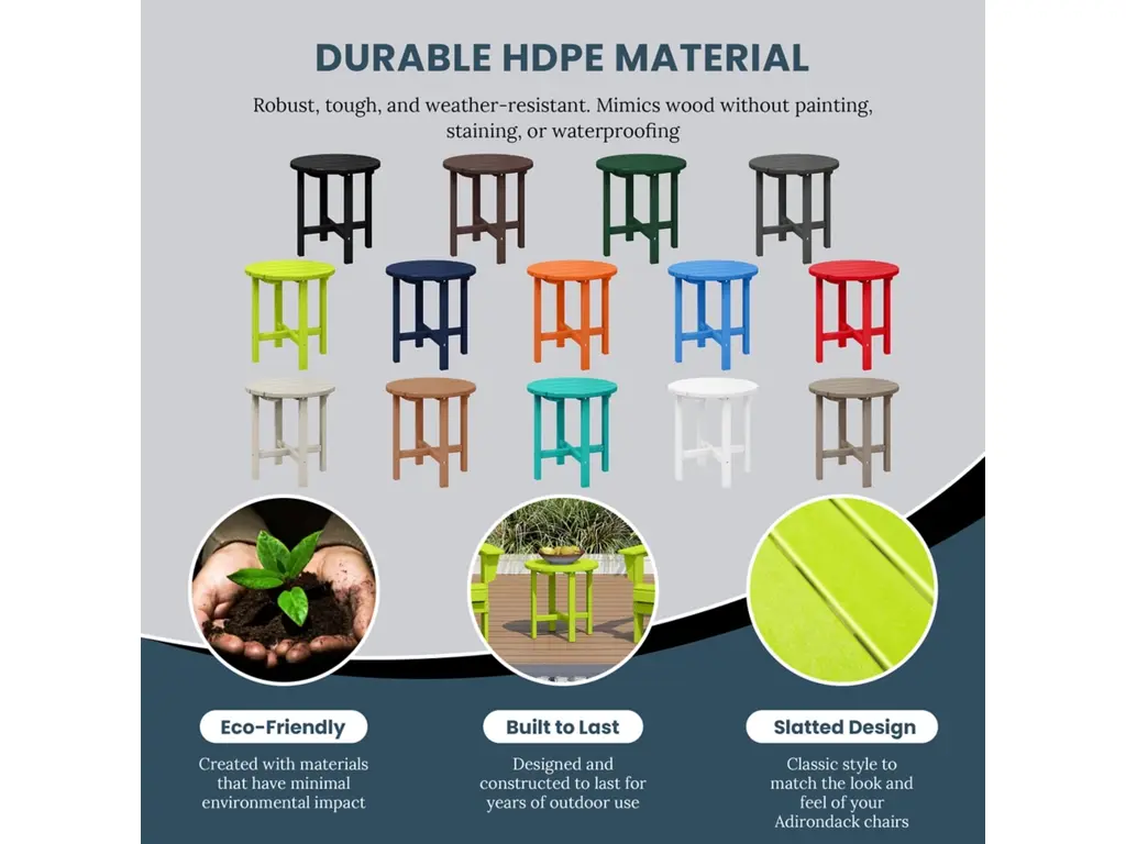 The perfect addition to any outdoor set, this table is both stylish and durable. The HDPE construction is perfect for all climates, with stainless steel hardware that resists rust. This versatile side table features a slatted tabletop that can easily mix and match with your existing Adirondack patio furniture. This side table come partially assembled with stainless steel hardware, however minimal assembly is required.
