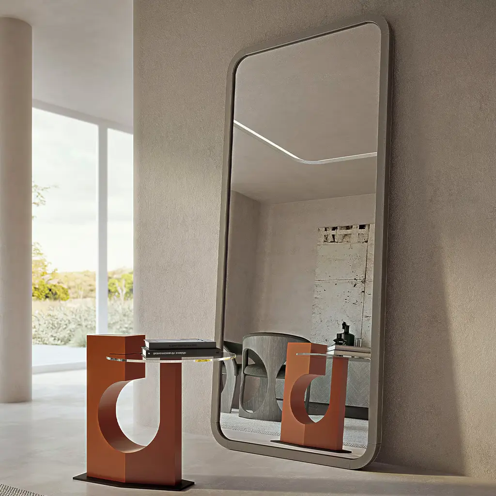 Lacquered side table in salmon finish, and bronze-gold metal base. Also available in lead and burnished finish. Transparent glass top, also available in painted glass. Structure also available in light or dark Tay versions. Lacquer available in various colors.