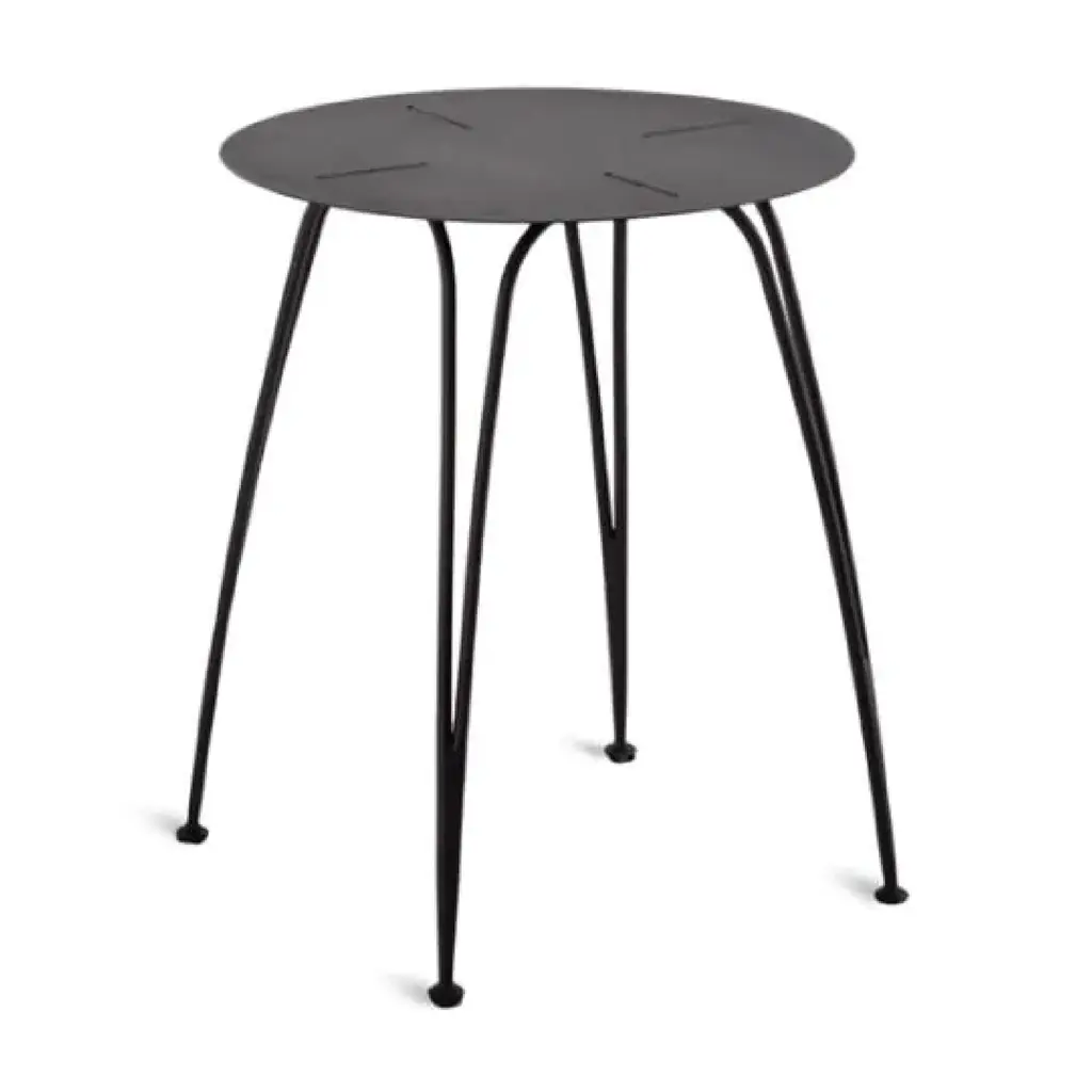 A versatile white finish drapes this modern and minimalist side table designed to add interest and modern appeal to a living room or office decor. Crafted entirely of metal, the round shape of the top is mirrored by the small circle stretcher underneath that adds stability and support to the four hairpin legs. Brimming with architectural flair, the Self Table is suitable for both indoor and outdoor decors.