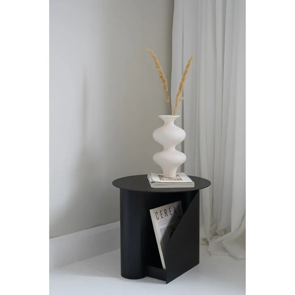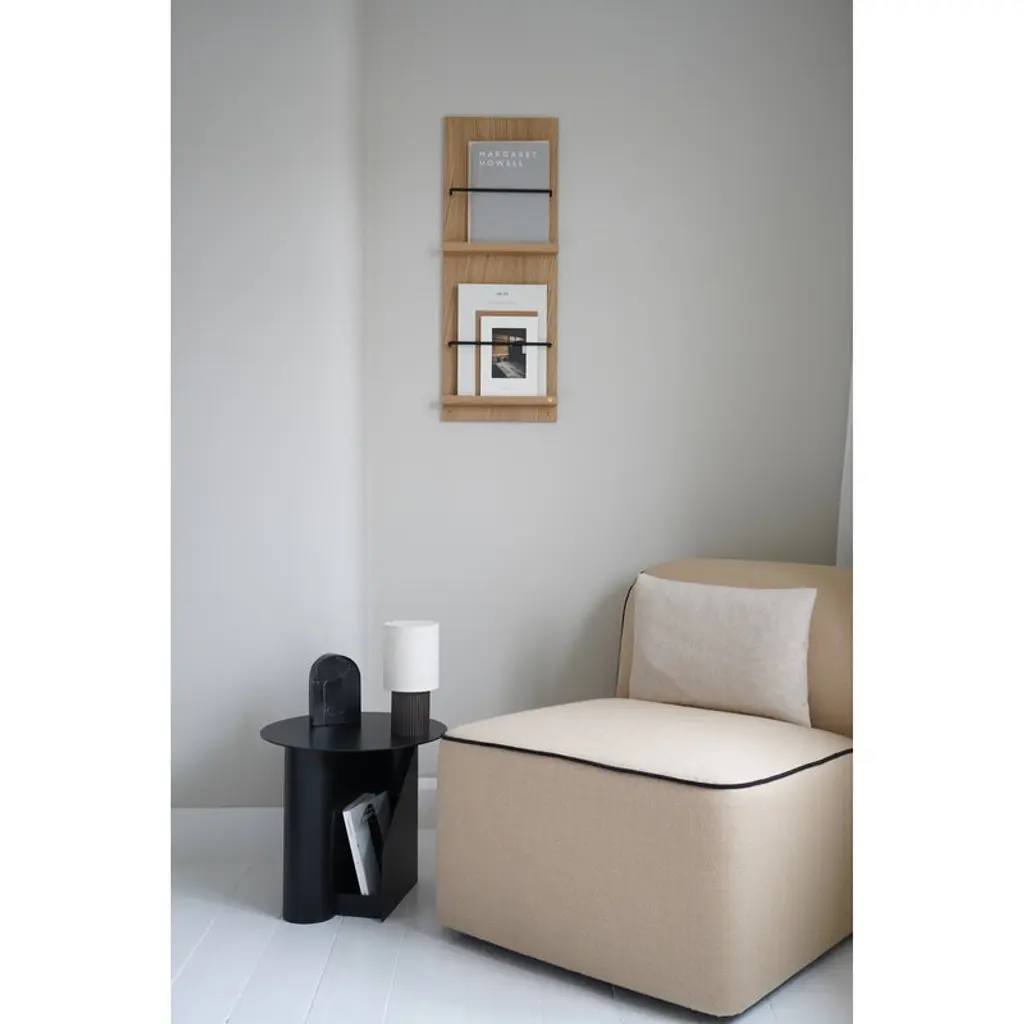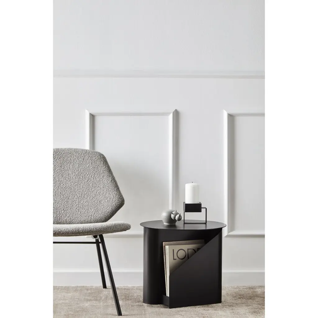 Woud’s Sentrum side table is characterized by an extremely simple yet easily recognizable design combining functionality and geometric elements. Under the round tabletop is an S-shaped construction, which creates a convenient storage space, for instance, for magazines or books. The sculpturally shaped Sentrum side table is made of painted metal and designed by the Schmahl + Schnippering duo.