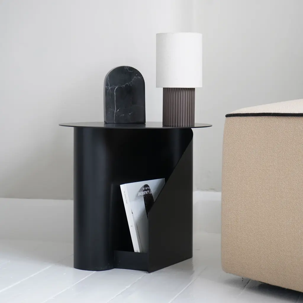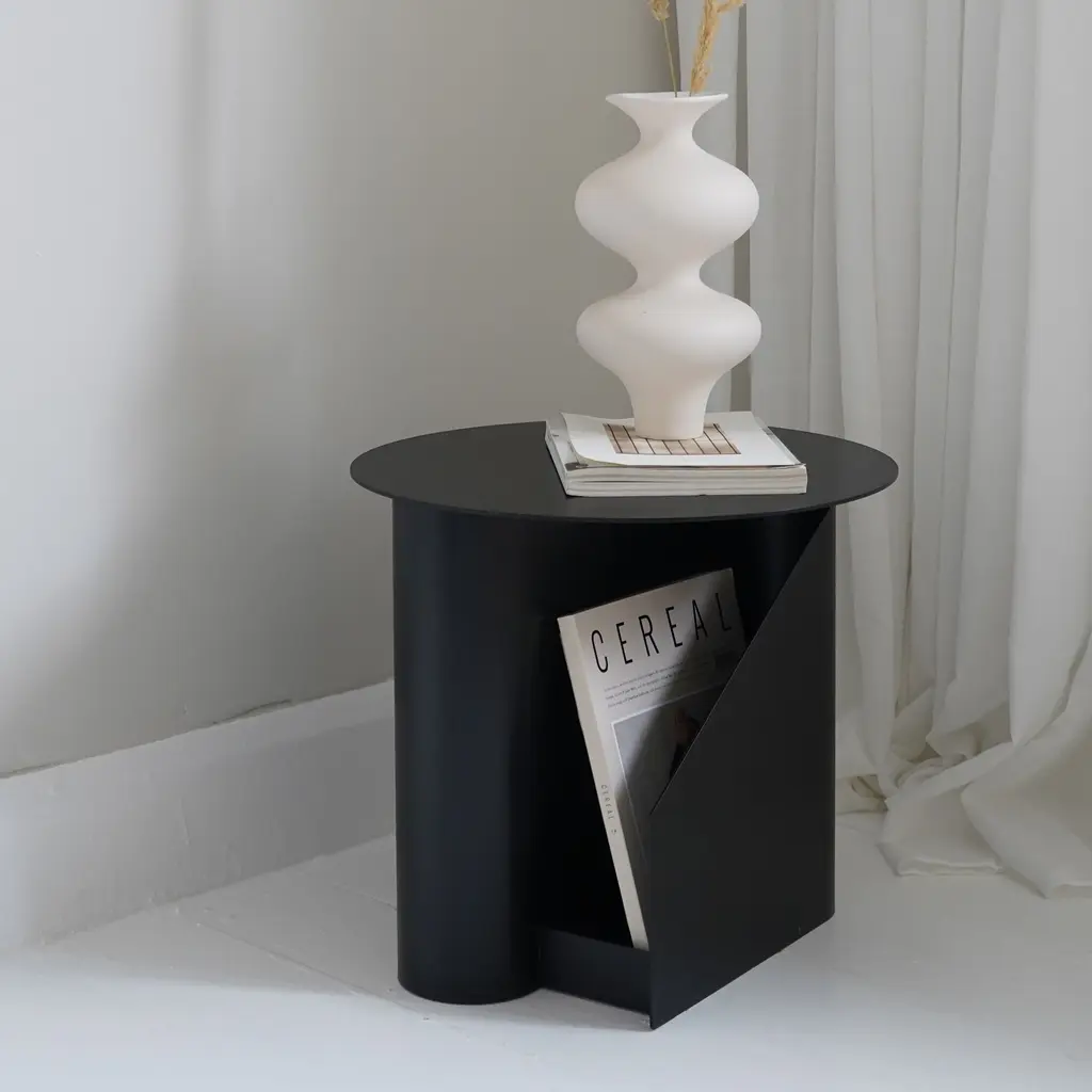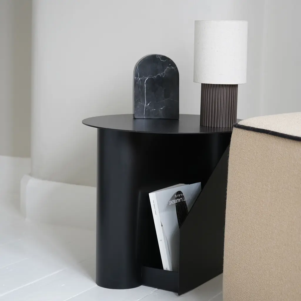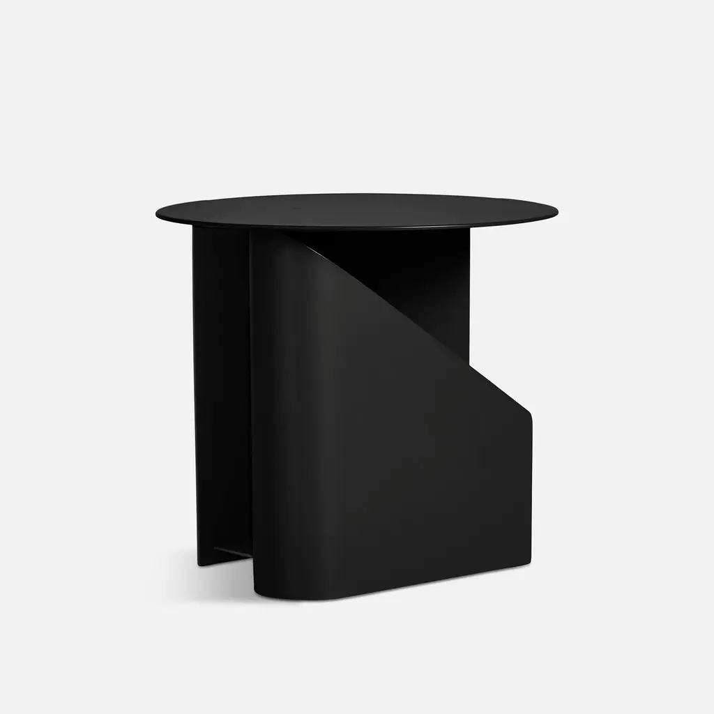 A geometrical visual language in a multi-functional design, the Sentrum black metal side table redefines a ubiquitous piece of furniture as a style statement. Designers Maximilian Schmahl and Fabian Schnippering created the Sentrum series for Danish brand Woud using bold forms that flow in a sculptural silhouette. The side table brings together curved and thin elements in a design that optimizes function. The circular top rests on a hefty S-shaped base that features two separate storage spaces. Perfect for magazines or books, the openings provide easy access to the storage areas and also allow users to see the contents at a glance. Crafted to look gorgeous for a long time, each Woud Sentrum Side Table is made from metal with a painted finish. This version boasts a timeless and versatile black finish to complement any existing furniture and color palettes. Sentrum comes fully assembled, ready to use.