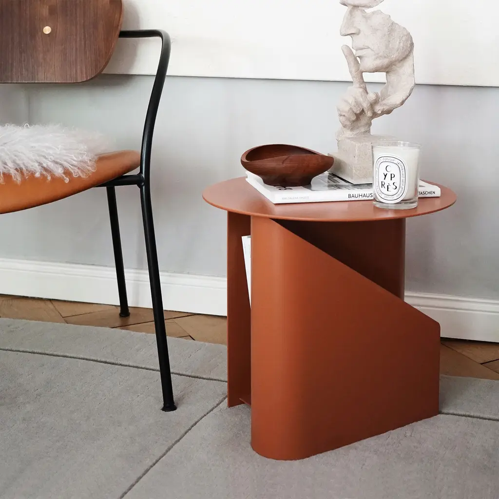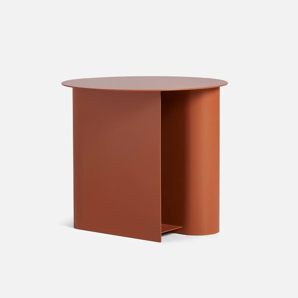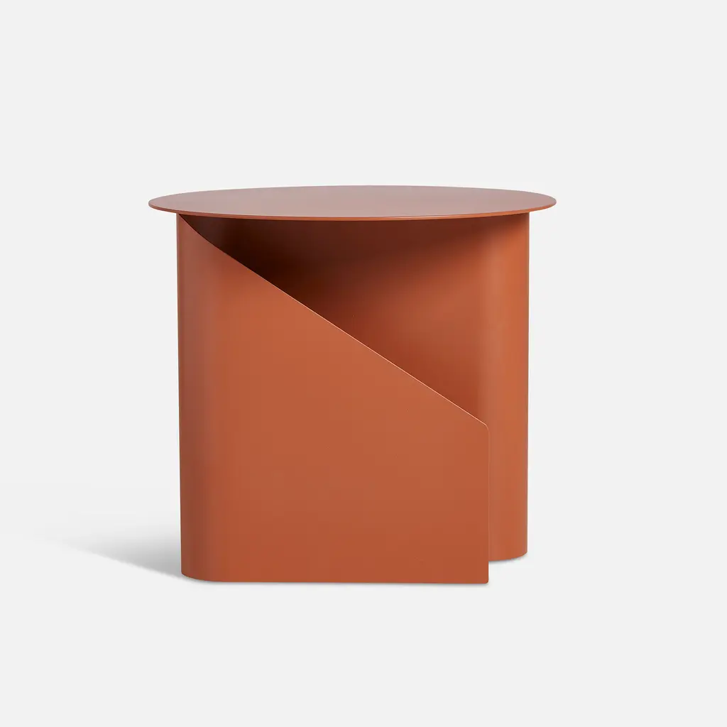 An accent table and a clever magazine holder at the same time, the Sentrum side table is as practical as it is stylish. Part of the Woud collection, Sentrum was created by Maximilian Schmahl and Fabian Schnippering with a sculptural expression and a multi-functional design. Two separate openings offer an ingenious way to store magazines and books, keeping them both organized and close at hand. The round top complements the S-shaped, curved base, providing room for lamps, vases, cups, or home accessories. Manufactured from metal, this version of the Sentrum side table has a burnt orange color with a matte finish. Finally, this table is packaged fully assembled and ready to use.