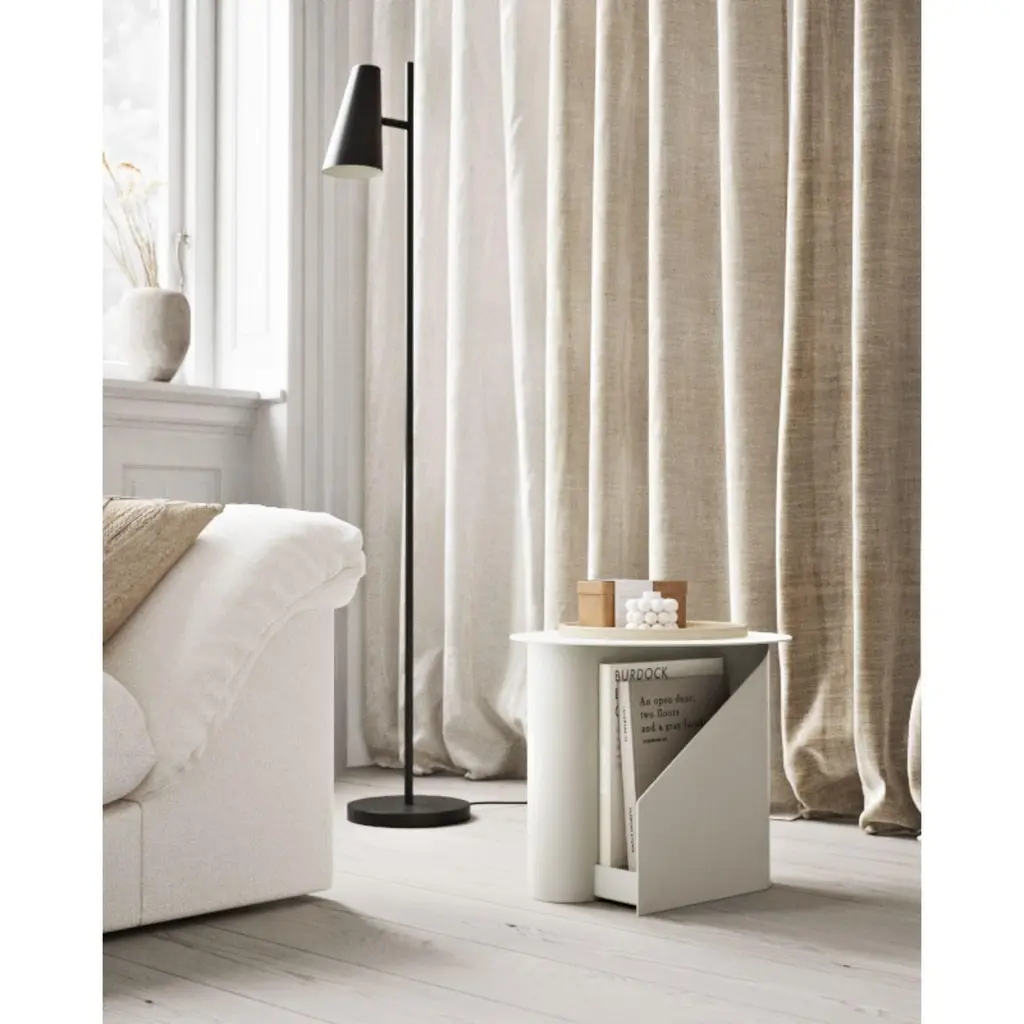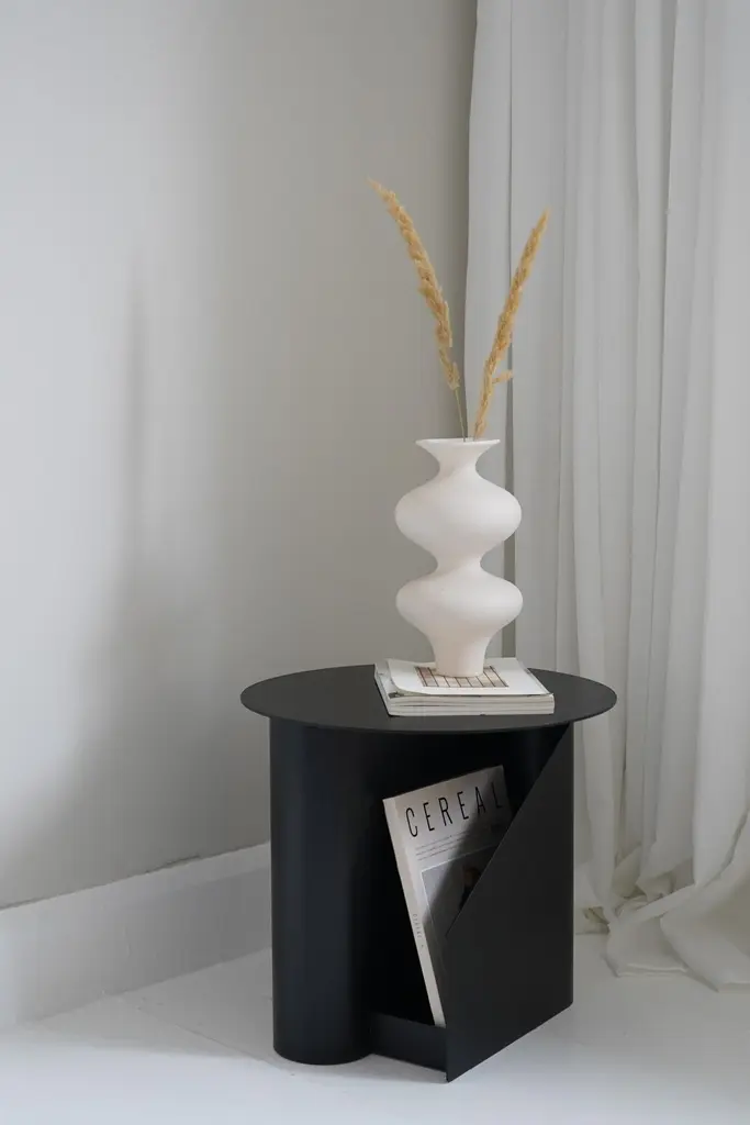 Sentrum side table by Schmahl +Schnippering.Materials: MetalDimensions: D 40 x W 40 x H 36 cmAlso available in different colours.The founders, Mia and Torben Koed, decided to put their 30 years of experience into a new project. It was time for a change and a new challenge. The challenge was to build an ambitious design brand from the ground up with high-quality materials and great attention to the little details. With a drive to create new originals, the WOUD collection is founded upon the idea to look ahead instead of looking back and share the love for honest design. Therefore, we are eager to discover and develop new ideas whether it being in form, function or choice of material. Maximilian Schmahl and Fabian Schnippering are two talented German designers specialising in furniture, interior design and design concepts. The designers studied Product Design together at the Bauhaus University Weimar and found that they share a profound love for decisive details and soft shapes in their designs. In 2013, they established their own studio; Schmahl + Schnippering. With a belief that designs are a part of our culture, the studio creates objects that reflect the user’s needs. Their products are designed to integrate and interact with people as a natural part of their daily life. The functional approach to design and shared theoretical background is visible in the Sentrum side table. The design follows the principle of simplicity as it has been stripped from all unnecessary elements. What is left is a strong base and geometrical expression with the functionalities at the centre of attention. The S-shaped construction creates two spaces for storage on both sides to enhance the usability of the side table.