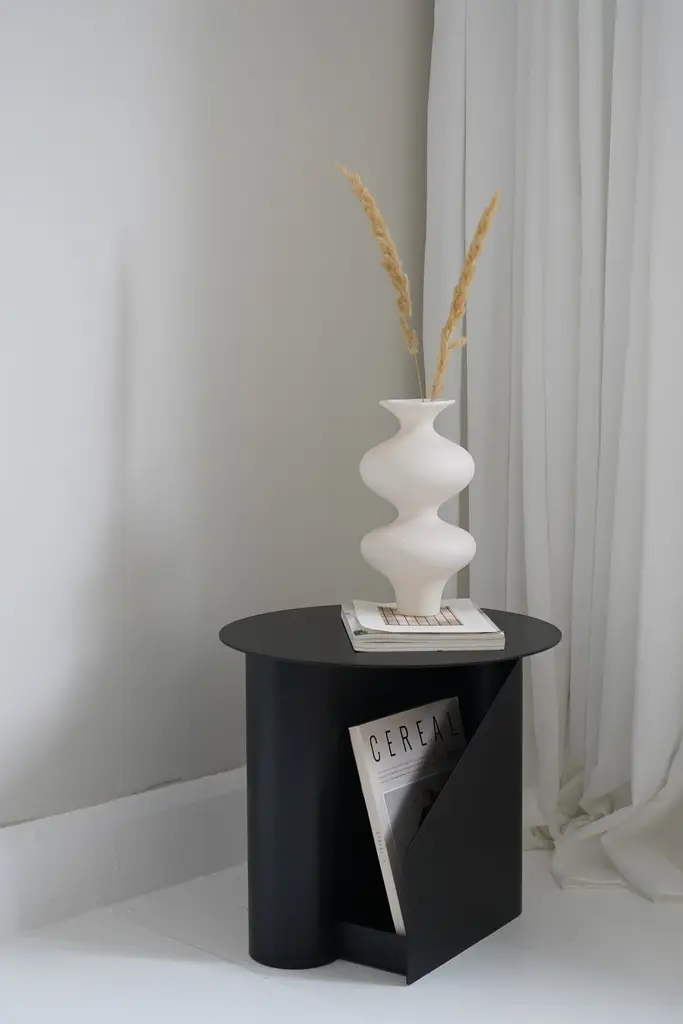 The Sentrum side table follows the principle of simplicity as it has been stripped from all unnecessary elements. What is left is a strong base and geometrical expression with pure functionalities. The S-shaped construction makes the centre of attention and creates two spaces for storage on both sides to enhance the usability of the side table - ideal for magazines and books.