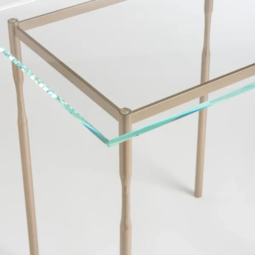 Let the room’s modern aesthetic ring clear with the tidy, handcrafted design of the Senza Side Table from Hubbardton Forge. Every inch on this piece is calculated for outstanding balance between form and function. The table’s solid steel legs sport a slender construction for a light visual and a lightweight feel. These legs reveal fullered accents on the top that recede elegantly. A rectangular frame resting above leaves its interior open to enhance the disappearing visual of the clear glass tabletop. Any item placed on the glass appears to defy gravity thanks to its sheer clarity.