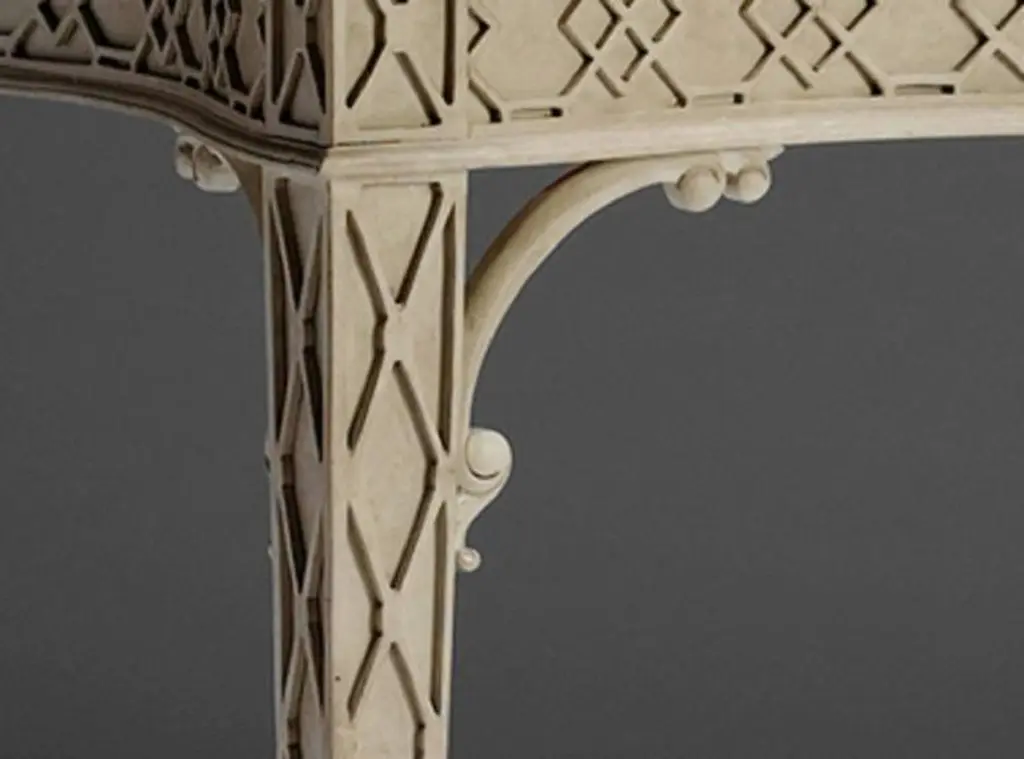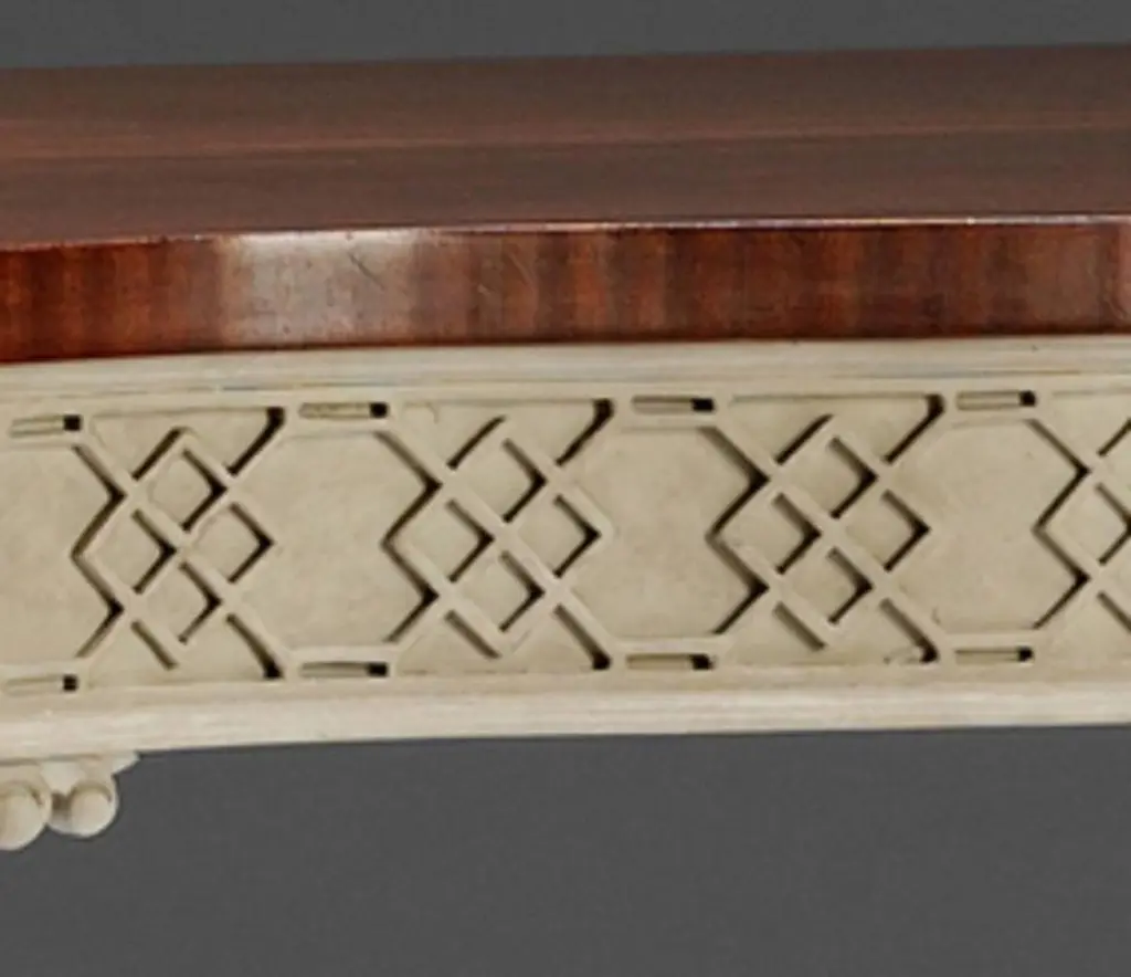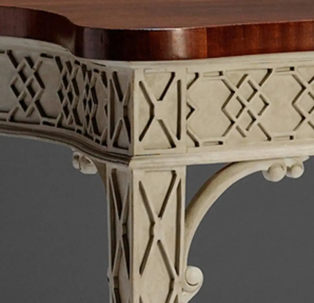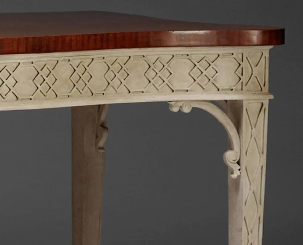 A George III Chippendale design blind-fret serpentine form side table, with polished mahogany top and distressed paint base.We are currently working to a 30-36 week lead time.