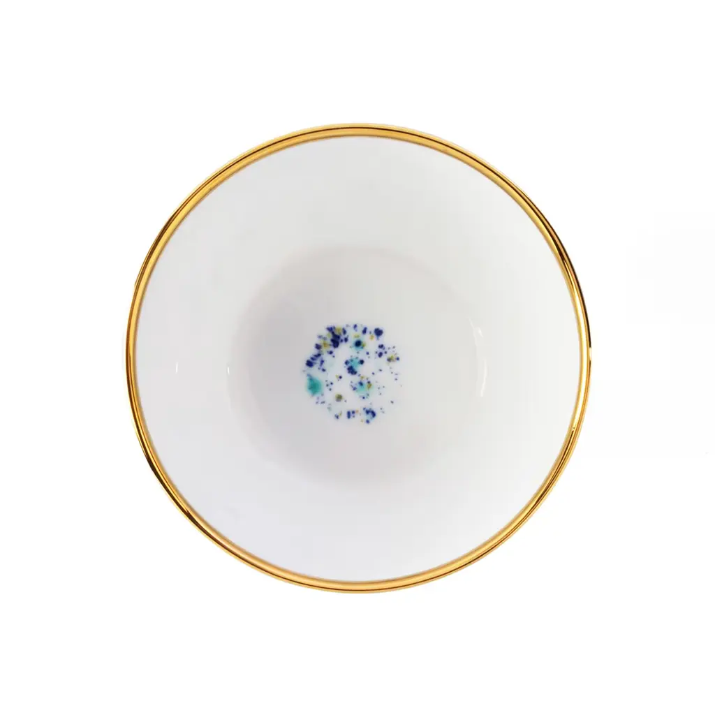 For special occasions or everyday dinners, this elegant set of two bowls will make a superb statement in any dining table. An array of dots in dappled green, blue, yellow, and black is liberally sprinkled on the external surface to evoke the hues and thin veins on marble, hence the name. The 24K gold detail adorning the rim adds a touch of restrained opulence. Not suitable for microwave.