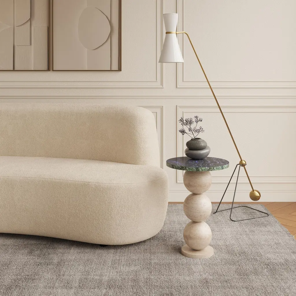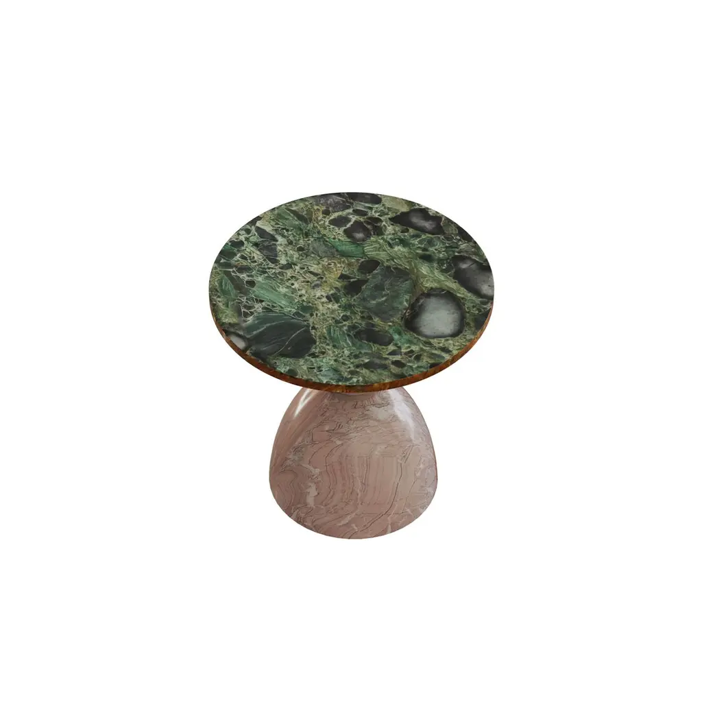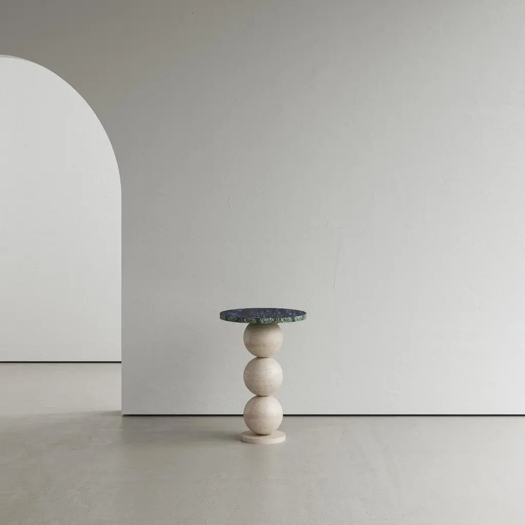 Set of 2 Dança and Boneca Side Tables by Gabriela CamposDimensions: Dança: Ø 35 x H 50 cm. Boneca: Ø 35 x H 35 cm.Materials: Dança: Marble composition on victoria falls, emerald green and blue martinica. Boneca: Marble composition on negroni, via appia and emerald green.The side table "Dança" is a reinterpretation of the work "La Danse" by Henri Matisse, one of the most innovative artists of the 20th century. it is believed that the idea for the composition came about in 1905, while the painter watched some fishermen performing a circle dance, the "Sardana", on a beach in the south of France. Its base structure alludes to the bodies present in the work. The spheres were used to give movement to the piece and, at the same time, repetition. The intention was to recreate all this soul present in the work, bringing a rhythmic pattern, colors and harmony through an organic and fluid design.Boneca side table is a reinterpretation of the work “A Boneca” (1928) by Tarsila do Amaral, the muse of Brazilian modernism. The figure of the doll expresses her understanding of her childhood, lived by the artist in a very sweet way. Here we seek to reproduce the Brazilianness and energy of the colors portrayed by the artist in the work, combining a playful soul with fluid and organic lines. For the representation of the form, we seek to respect the contour of the work, with the use of geometric shapes so present in the Cubist movement.