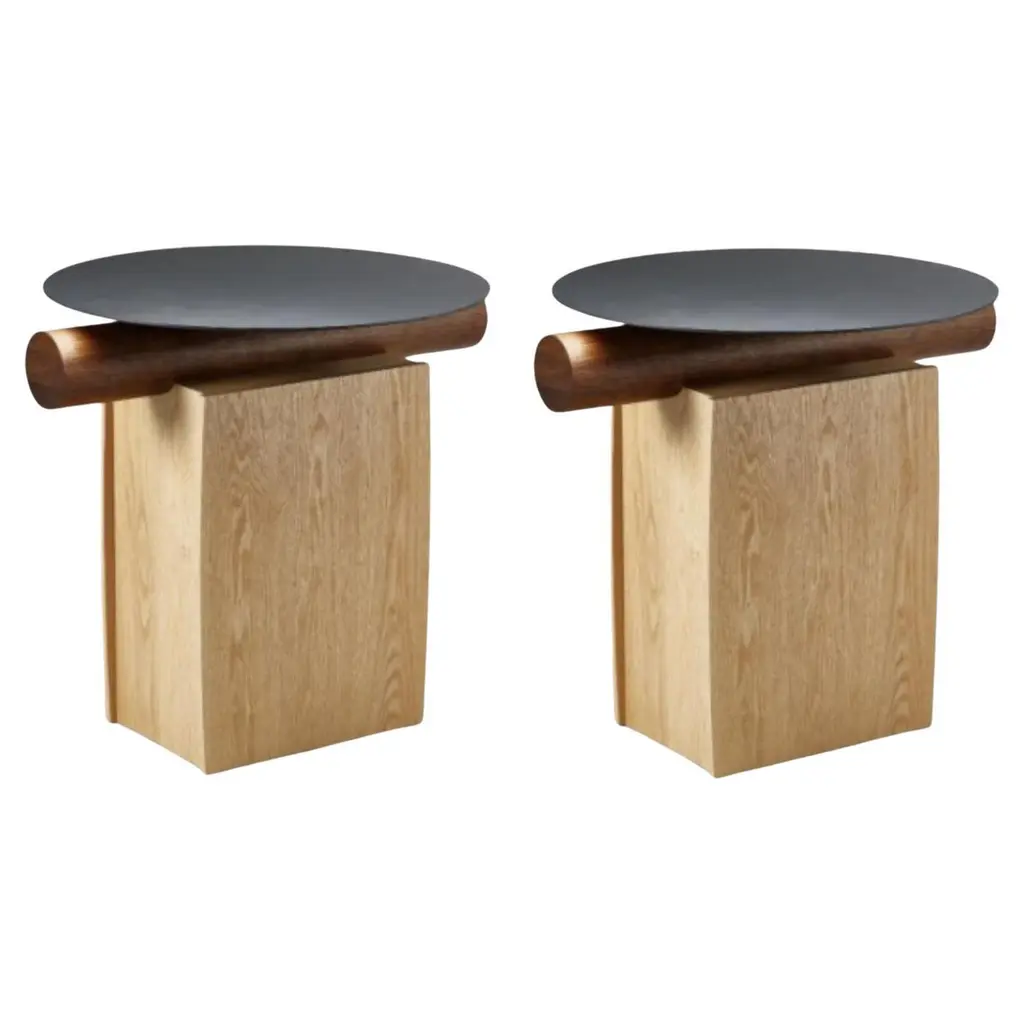 Set Of 2 Epicure XIII Shou Sugi Ban Oak & Brass Side Tables by Grzegorz MajkaLimited Edition Of 8 Sets. Dimensions: D 50 x W 60 x H 55 cm.Materials: Solid brass and Shou Sugi Ban oakAvailable in different material variations. Please contact us.The Epicure XIII, contemporary side tablesLuxury doesn’t always follow the common patterns. Luxury goes beyond and almost like one of the best gourmets joins varied experiences, ingredients, recipes into one.Exactly like our new piece of art called „”The Epicure’’, which could not present its beauty by itself. Only with the help of the other elements reveals the one complete part, one complete ’’island’’.Following this idea, we have selected the unique material such as Polish Oak in Shou Sugi Ban technique.Shou Sugi Ban finish highlights the irregular shapes, veins and the pits of the wooden elements designed by the Mother Nature.The solid brass base in “Antique Satin” finish highly effects the sophisticated and tasty look of the whole part.Grzegorz Majka is a self-taught Polish artist who explores the concepts of modularity, sculptural form, and artisanal processes in the design of furniture and lighting. His work seamlessly blends craft and contemporary design, incorporating high-quality noble materials like natural stone, wood, metals, and hand-blown glass. Guided by a deep respect for the inherent character of materials, Grzegorz highlights natural irregularities, textures, and patterns - veins in stone, the living patina of untreated metals, the organic feel of brushed surfaces. These elements are not hidden but embraced, inviting collectors on a sensory journey through touch and time.His studio practice focuses on handcrafted limited-edition furniture that is not only functional, but also living, authentic, collectible art.