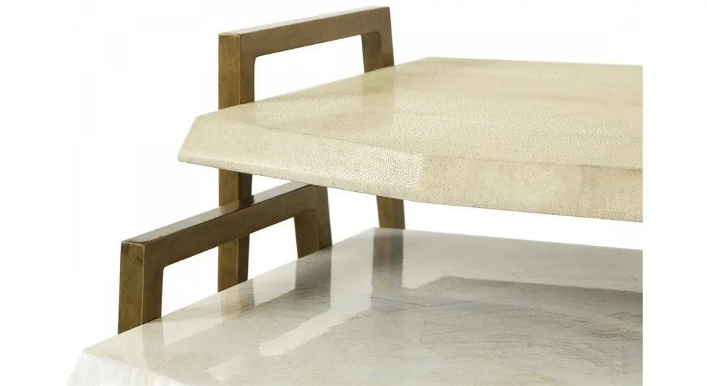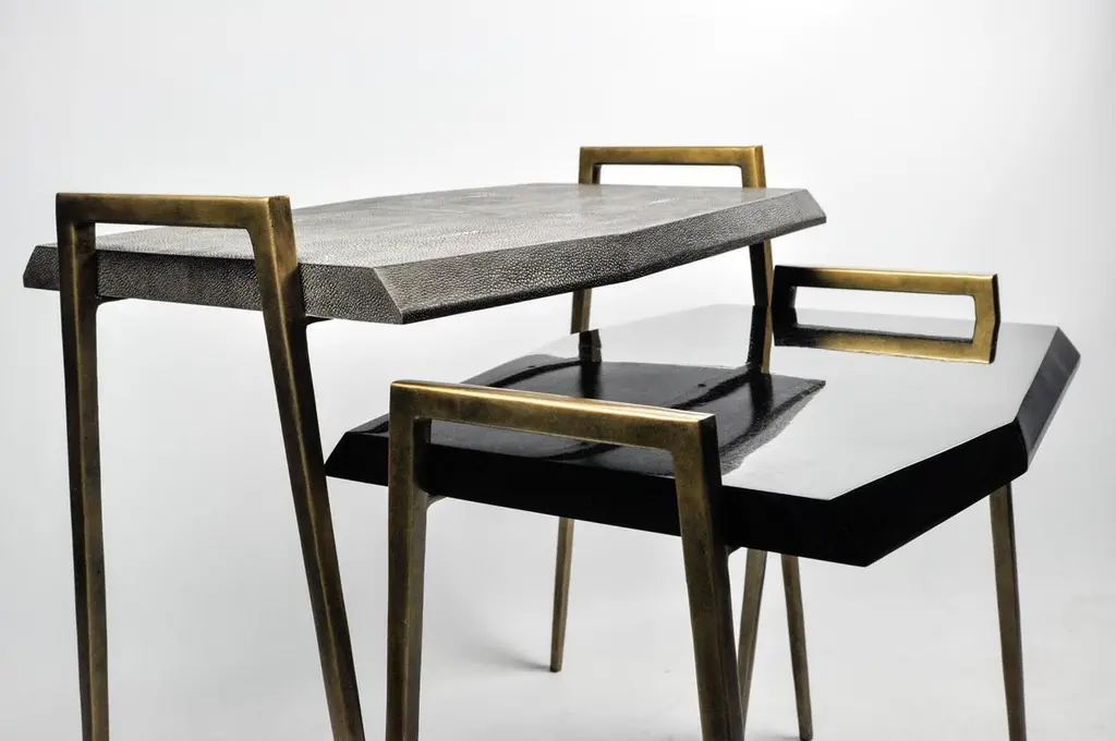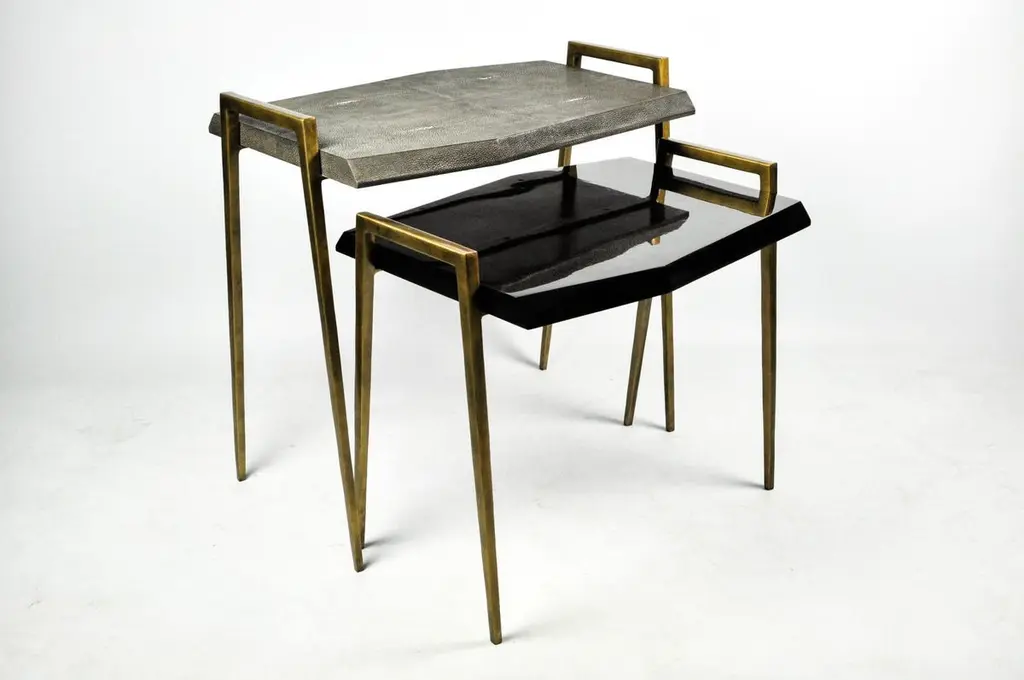 The METEOR nesting tables is made of a natural genuine shagreen on the highest table and polished white sea shell marquetry on the lower one.The feet have an old brass patina.This set of side tables is very versatile and can be placed anywhere in both small and large rooms.Size of the shagreen table: 25" x 15.75" x H 23.8" (63.5 x 40 x 60cm)Size of the sea shell table: 21" x 14.96" x H 49.5" (53.5 x 38 x 49.5cm)We can customize these tables.You can choose a different color of shagreen and sea shell. Range of shagreen colors in the photo gallery.Care instructions:To clean, simply wipe with a dry clean clothDo not use any cleaning agent on the surfaceKeep the shagreen dry and protected from direct sunlight and heat surfacesThis piece is handmade by our talented team of master craftsmen.