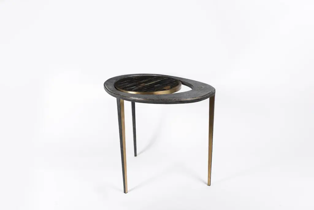 The Paris based label has distinguished themselves since their launch, with their iconic use of shagreen mixed with brass and other exotic materials. All furniture is handcrafted by skilled artisans, ultimately making each piece unique, designed in Paris and produced in the Philippines.The set of 2 peacock nesting side tables are an iconic R&Y Augousti piece and one of their first designs. The piece is Minimalist and sculptural, with inspiration of course from the shape of exotic peacock feathers. The large piece is inlaid in a mixture of coal black shagreen, tiger eye blue & bronze patina brass, while the medium piece is inlaid in a mixture of coal black shagreen, black pen shell and bronze patina brass creating overall a dramatic look. This design comes in different sizes and variations as well as coffee table version, see images at end of slide. The option to purchase a single table and not as a set is available upon requestThe dimensions of this piece are L-60 x 44 x 60 cm, M-51 x 41 x 58cm / L-23.6” x 17.3 x 23.6”, M-20.1” x 16.1” x 22.8”All R&Y Augousti pieces are handmade by artisans, ultimately making each piece unique. Custom color/sizing available on request. Wipe clean with soft dry cloth.Acclaimed design duo Ria & Yiouri Augousti have established themselves since the 1990s as pioneers of modern-vintage style through their luxurious Art Deco inspired collections.The Paris based label has distinguished themselves since their launch, with their iconic use of shagreen mixed with brass and other exotic materials. All furniture is handcrafted by skilled artisans, ultimately making each piece unique. All shagreen-covered items should be kept out of direct sunlight, color variants may occur on the stingray and other exotic finishes, but this showcases the Parisian label's commitment to creating authentic luxurious products using natural components.