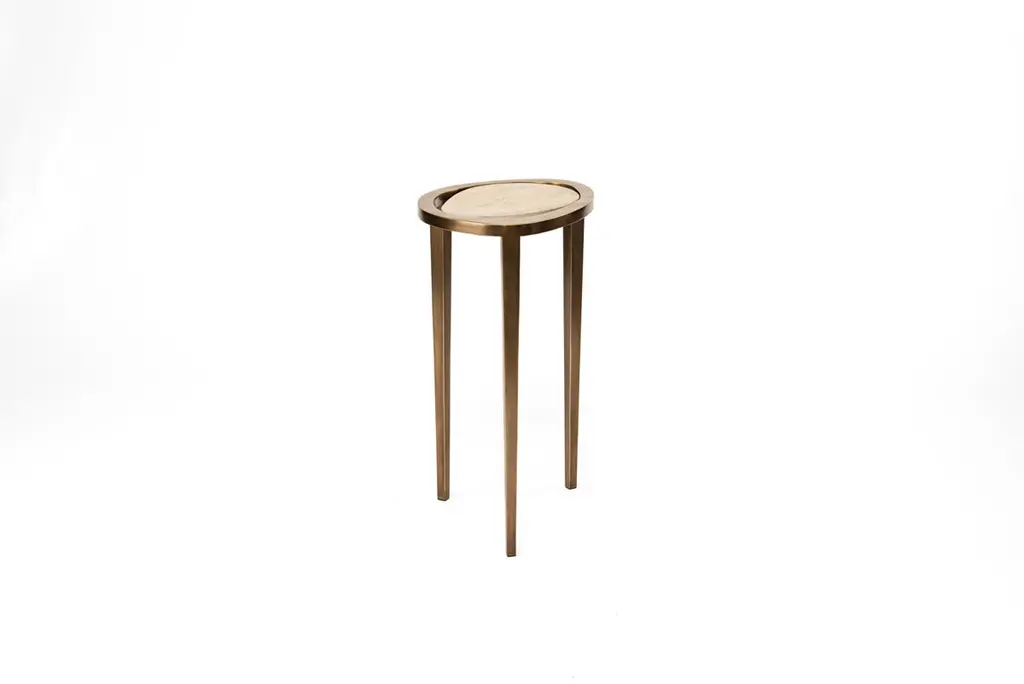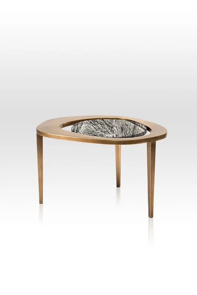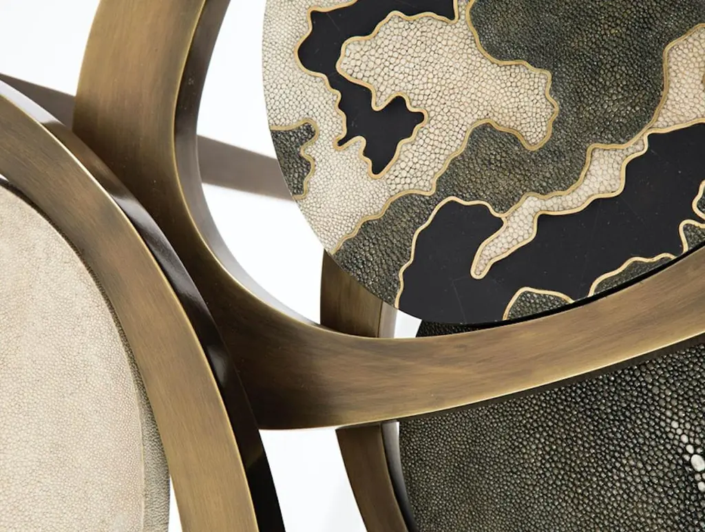 The Paris based label has distinguished themselves since their launch, with their iconic use of shagreen mixed with brass and other exotic materials. All furniture is handcrafted by skilled artisans, ultimately making each piece unique, designed in Paris and produced in the Philippines.The set of 3 peacock nesting coffee tables, are an iconic R&Y Augousti piece and one of their first designs. The set includes the large, medium and small size. The pieces are both Minimalist and sculptural, with inspiration of course from the shape of exotic peacock feathers. As shown on the images the large size is inlaid with cream Shagreen in the center, the medium size with a camouflage pattern in the center, and the small size with coal black Shagreen in the center. However, the center parts of the pieces can be inlaid in whatever finish from our collection you would like. Please confirm once you have purchased the set how you would like the tops to be inlaid. With its beautiful amorphous shape this nesting set adds a statement to any room. Other variations are also available where the outer frame is inlaid in Shagreen, see images at end of slide. A coffee table version is also available, see images at end of slide. Option to purchase tables as singles is also available on request.The dimensions of the set are: S:15.25"x11.5"x20" M:15"x11"x22 L-31"x12.25"x24"All R&Y Augousti pieces are handmade by artisans, ultimately making each piece unique. Custom color/sizing available on request. Wipe clean with soft dry cloth.Acclaimed design duo Ria & Yiouri Augousti have established themselves since the 1990s as pioneers of modern-vintage style through their luxurious Art Deco inspired collections.The Paris based label has distinguished themselves since their launch, with their iconic use of Shagreen mixed with brass and other exotic materials. All furniture is handcrafted by skilled artisans, ultimately making each piece unique. All Shagreen-covered items should be kept out of direct sunlight, color variants may occur on the stingray and other exotic finishes, but this showcases the Parisian label's commitment to creating authentic luxurious products using natural components.