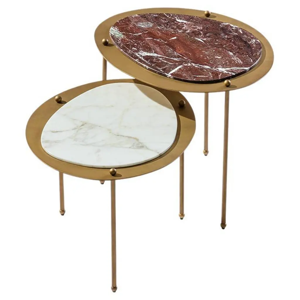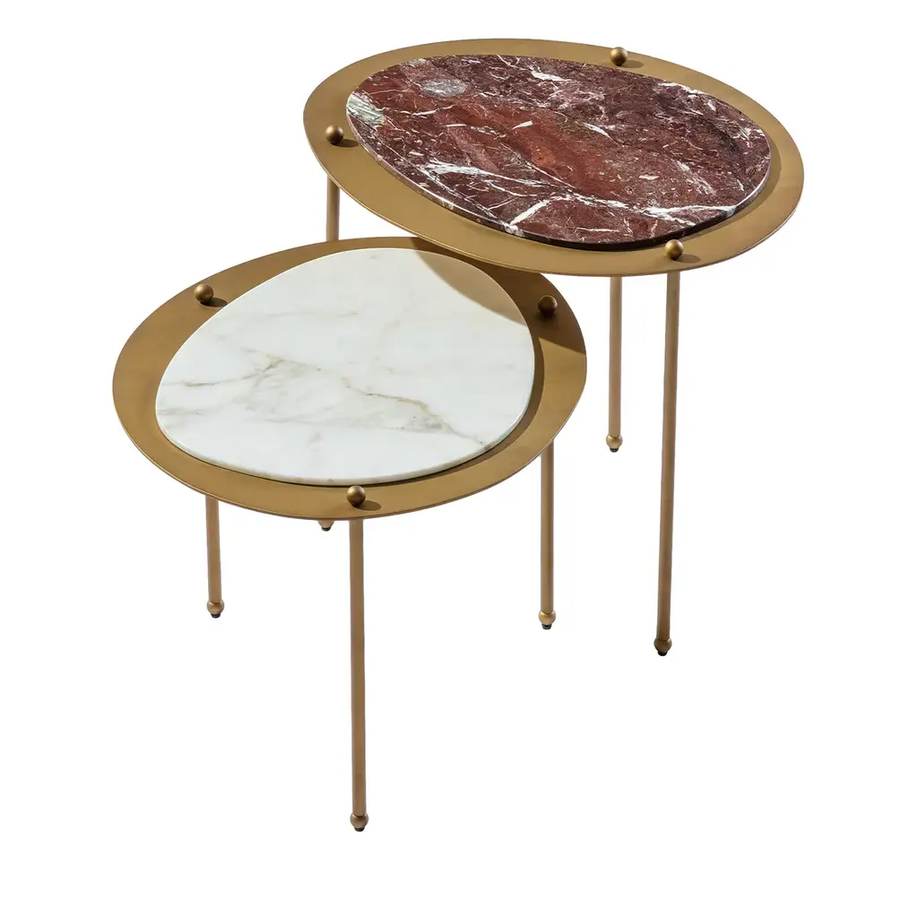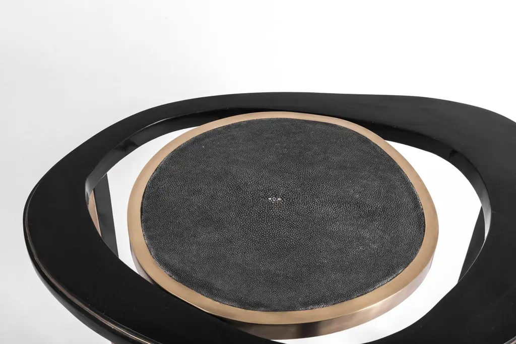 The Paris based label has distinguished themselves since their launch, with their iconic use of shagreen mixed with brass and other exotic materials. All furniture is handcrafted by skilled artisans, ultimately making each piece unique, designed in Paris and produced in the Philippines.The set of 3 peacock nesting side tables are an iconic R&Y Augousti piece and one of their first designs. The piece is Minimalist and sculptural, with inspiration of course from the shape of exotic peacock feathers. All 3 pieces are inlaid in a mixture of cream shagreen, Hwana stone and bronze-patina brass. This design comes in different sizes and variations as well as a coffee table version, see images at end of slide. The option to purchase a single table and not as a set is available upon requestThe dimensions of this piece are L-70 x 52 x 60 cm, M-61 x 46 x 56.3 cm S- 52.5 x 40.5 x 52.3 cm / L-27.5” x 20.5" x 23.6”, M-24.1” x 18.1” x 22.2, S-20.1” x 15.9” x 20.6”All R&Y Augousti pieces are handmade by artisans, ultimately making each piece unique. Custom color/sizing available on request. Wipe clean with soft dry cloth.Acclaimed design duo Ria & Yiouri Augousti have established themselves since the 1990s as pioneers of modern-vintage style through their luxurious Art Deco inspired collections.The Paris based label has distinguished themselves since their launch, with their iconic use of shagreen mixed with brass and other exotic materials. All furniture is handcrafted by skilled artisans, ultimately making each piece unique. All shagreen-covered items should be kept out of direct sunlight, color variants may occur on the stingray and other exotic finishes, but this showcases the Parisian label's commitment to creating authentic luxurious products using natural components.