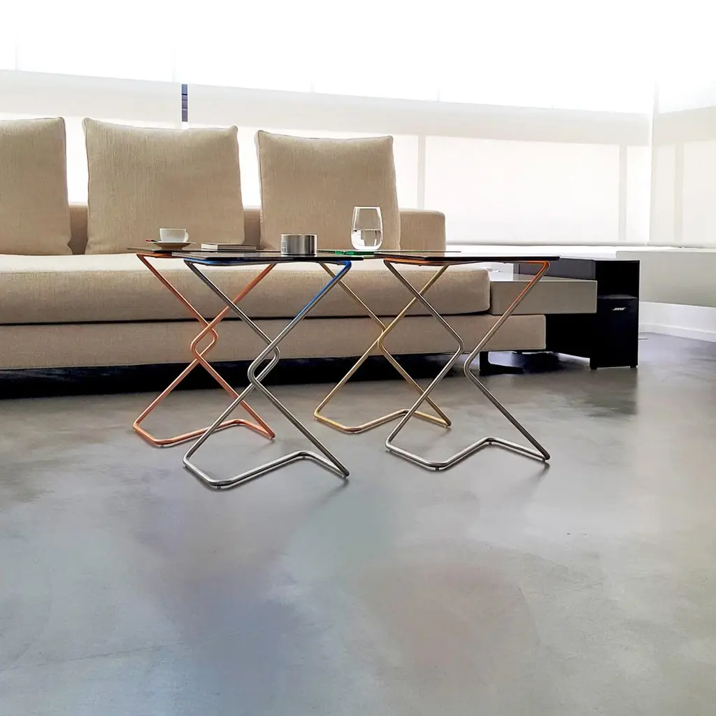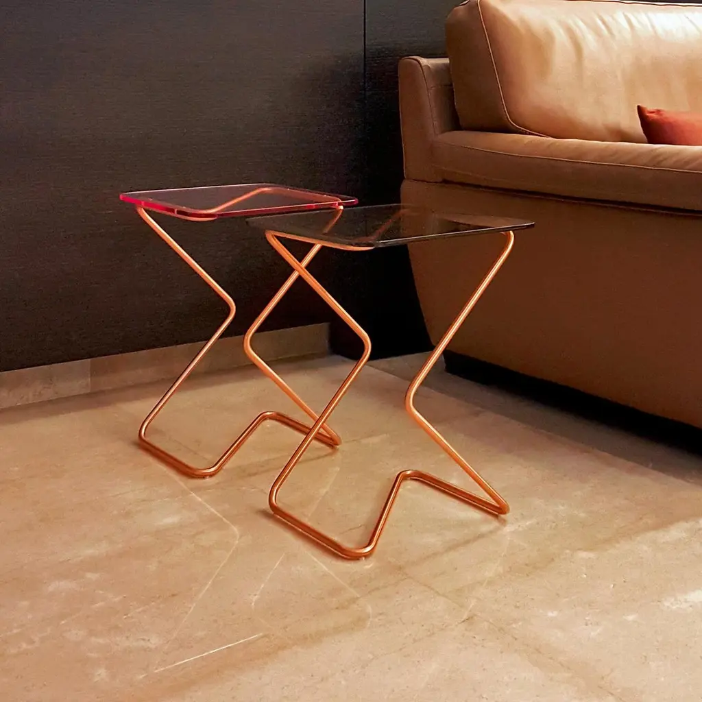 Set of 3 square side table by Rita Kettaneh Dimensions: The base: brushed stainless steel plated with brass optionally plated with copper or brass The top: acrylicMaterials: H 46 x W 33 x D 33 cmWeight: 3.75 KgColors and finishes: Stainless finish: Burnt orange, maya blue, cherry red, navyCopper finish: Light pink, brownBrass finish: Mint greenThe Crystal Tables are proudly produced in Lebanon by combining top notch industrial methodswith authentic craftsmanship. The result is high quality products that capture the delicateness ofthe human touchThe Square is one of the side tables in the award-winning Crystal Tables Collection designed by RitaKettaneh. Inspired by the crystal's transparency, purity, and geometry, The Square has a geometric identitywhich influences its entire shape and various silhouettes.Rita Kettaneh designs furniture that is unique, playful and meaningful. She seeks to make the experience of owning furniture an inspiring one where pieces evoke an emotion within their users. With an engineeringfoundation, an entrepreneurial specialisation, and experience in marketing and design, she brings in amultitude of perspectives when designing her products. Rita won the A’ Design Award for The Crystal Tables and has participated in exhibitions in Como, Beirut, Dubai, and Berlin.KRAY Studio is an emerging furniture brand that seeks to make the experience of owning furniture more meaningful and beautiful. Our vision is for you to connect with the pieces of furniture so your home starts resonating with you and becomes a space of discovery and restored vitality. We introduce a new kind of luxury, that is socially aware, spatially smart, all the while being fresh and contemporary. Designed by Rita Kettaneh, our high end pieces are produced by collaborating with local fabricators and craftsmen to preserve the authenticity of the craft and the delicateness of the human touch.
