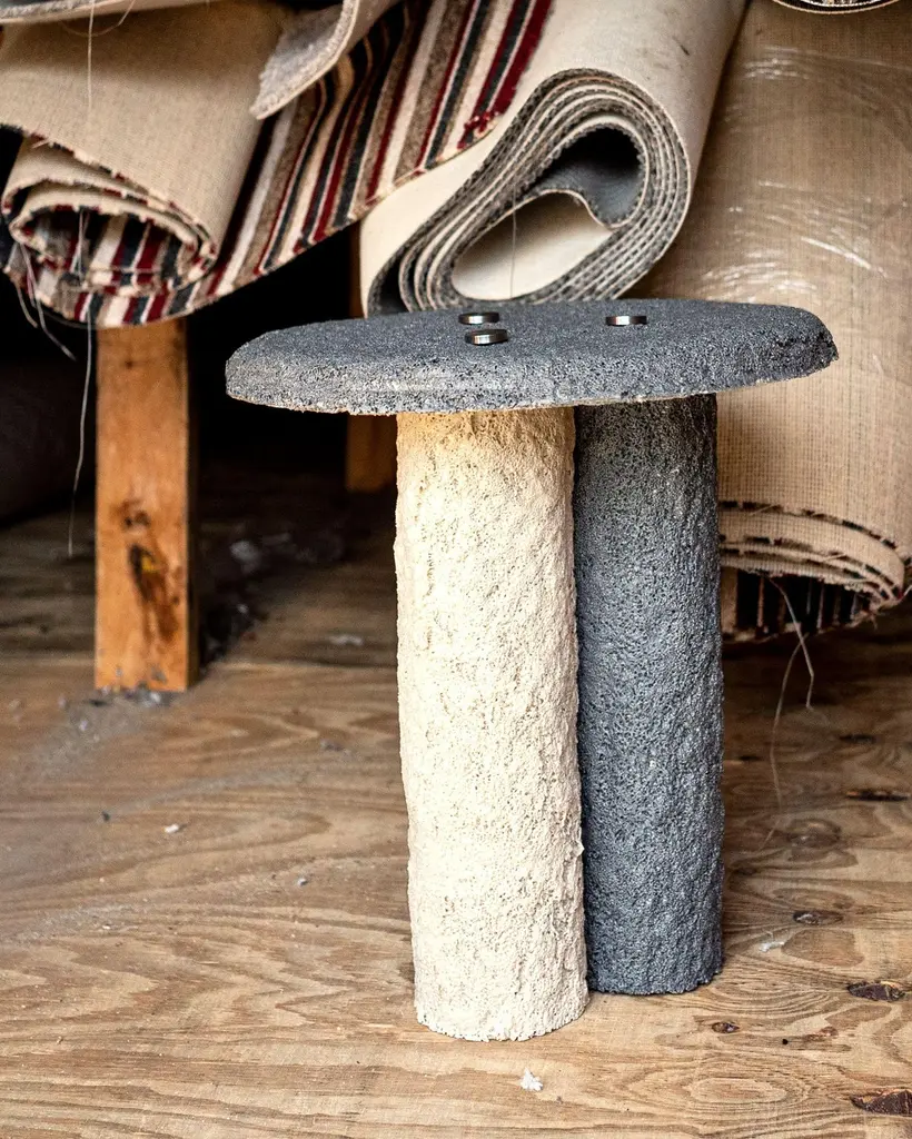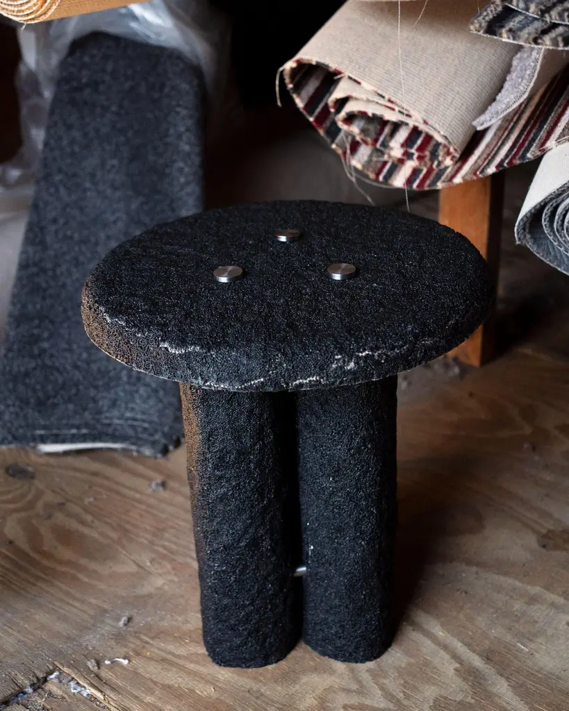 Set of carpet matter side table and low table by Riccardo CenedellaDimensions: 45 x 45 x H 47 cm65 x 65 x H 35 cmMaterials: Waste synthetic carpet.I am Riccardo Cenedella I graduated in Product Design from Politecnico di Torino in 2016 and straight after my graduation I started to work for an art design studio in Turin. There I started to develop my passion for making things with my hands and became confident with using the most common tools. However, while I was in the process of creating, I started to feel guilty about making objects only to satisfy my pleasure but without a specific purpose, and be part of the conventional linear model of take-make-discard and the current approach to materiality and objects. For this reason, in 2019, I decided to study MA Material Futures at Central Saint Martins in London. Studying there I came across the theory of Charles Levi-Strauss who described the figure of the bricoleur as the one who always makes with "whatever is at hand", after research into this topic I find out that for me this means to set the limit of my practice to the use of only waste materials.Inspiration:The carpet matter collection is a great representation of my practice: as an alchemist, through ingenuity, persistence and hands-on experimentation, a useless material is transformed into design artefacts.While I was researching about what waste material I wanted to use for my final year project, I bumped into some carpet waste during a walk around my neighbourhood. This material grabbed my attention and when I discovered that the vast majority of carpet is made with thermoplastic materials I decided to experiment treating it as a common plastic. Through hands-on experimentation with synthetic materials, I developed a technique that allows me to reshape and repurpose this material for the creation of new design artefacts, avoiding carpet from ending up in dumpsites.