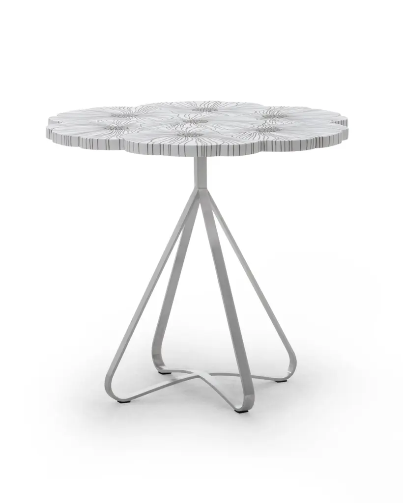 Set of bouquet coffee table and end table by Kenneth CobonpueMaterials: Fiberglass reinforced polymer and stainless steel.Dimensions:Coffee table diameter 75cm x height 40cm End table diameter 55cm x height 50cmAn exquisitely eye-catching centerpiece, Bouquet makes any day feel like a special occasion. The delicate lines of the signature floral relief pattern complete the contrasting resin top and stainless steel base.Also available in other sizes and colors.Designer's BiographyKenneth Cobonpue is a multi-awarded furniture designer and manufacturer from Cebu, Philippines. His passage to design began in 1987, studying Industrial Design at the Pratt Institute in New York. While completing his studies, he apprenticed for a leather and wood workshop near Florence, Italy. He went on to study Furniture Marketing and Production at the Export-Akademie Baden-Württemberg in Reutlingen, Germany, under a private and state scholarship program, and subsequently worked in Bielefeld and Munich.Kenneth returned home to Cebu in 1996 to manage Interior Crafts of the Islands, Inc., a furniture design and manufacturing company founded by his mother Betty Cobonpue in 1972. Discovering that modern design could have a new face using natural fibers and materials, Kenneth created pieces of functional art, offering an alternative to the Western definition of modern design. Today, the Kennethcobonpue brand has become known globally for its unique designs and extensive roster of clientele, including Hollywood celebrities and members of royalty.With his masterful way of integrating nature, traditional craft and innovative technologies, designer and creative director Kenneth Cobonpue has earned international awards and recognition for his creative, organic, and expressive pieces. Working closely with some of the world’s leading designers, from household names to emerging talents, Kenneth has been pushing the envelope for design in the Philippines and sharing his vision to a global audience. Awards to his credit include five Japan Good Design Awards, the grand prize at Singapore International Design Competition, the Design for Asia Award of Hong Kong, the American Society of Interior Design Top Pick selection and the French Coup de Coeur award. Several of his designs were selected for several editions of the International Design Yearbook published in London and New York. Phaidon’s book entitled “& FORK” underscores Kenneth’s position as a leader of a new movement incorporating new technologies with crafts. In 2007, TIME magazine called him “rattan’s first virtuoso”. Kenneth was named the Designer of the Year in the first edition of Maison et Objet Asia held in March 2014 in Singapore.Kenneth reveals new work each year in the design shows from Milan to New York, and he speaks regularly about Southeast Asian design all over the world. He has also appeared in European television and in countless international magazines and newspapers around the world. Various Cobonpue designs have also appeared in full-length feature films and television, such as Oceans 13 and CSI.