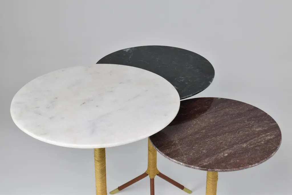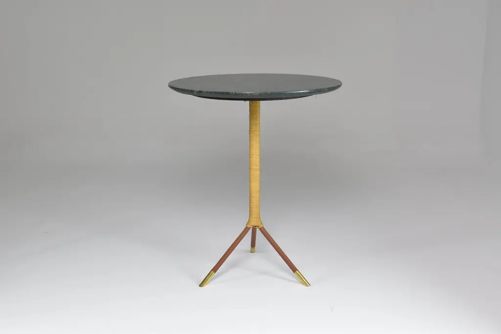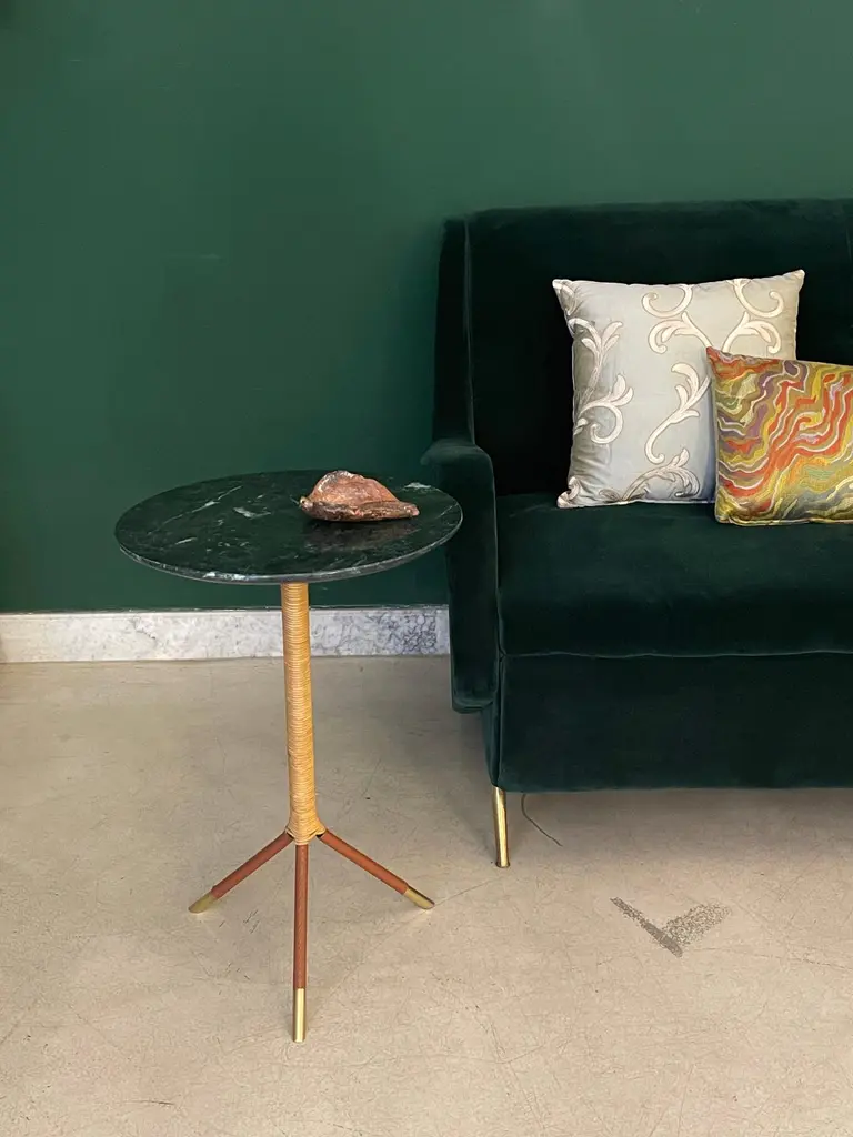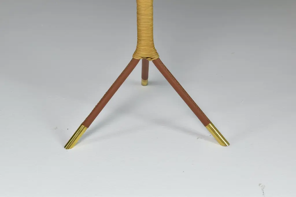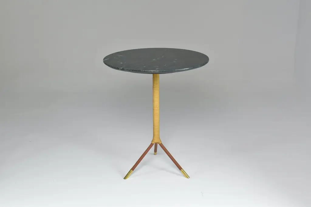 Handcrafted made-to-measure side table designed with a thick polished marble tabletop, a steel structure, and sustainably sourced natural rattan core. The hand-sewn leather sheathed tripod structure is highlighted by chic solid brass endings. Red marble:Ø 37 cm (14.5")H 55 cm (21.6")White marble:Ø 45 cm (17.7")H 65 cm (25.6")Green Guatemala marble:Ø 40 cm (15.7")H 60 cm (23.6")-----Our design studio - JAS - handcrafts bespoke brass lighting, tables, and ceramics. Our modular designs embrace a contemporary outlook on traditional Moroccan craftsmanship and high-quality Portuguese glass. Our know-how stems from combining traditional materials such as wicker, rattan, and leather and meticulous workmanship. Based in Paris and Rabat. Handcrafted in Portugal and Morocco.