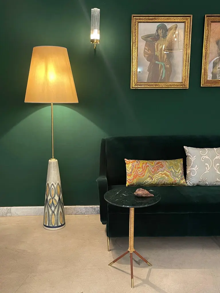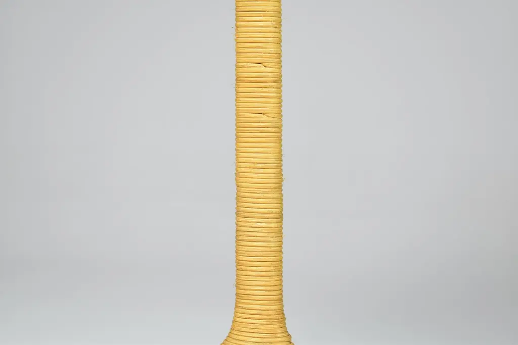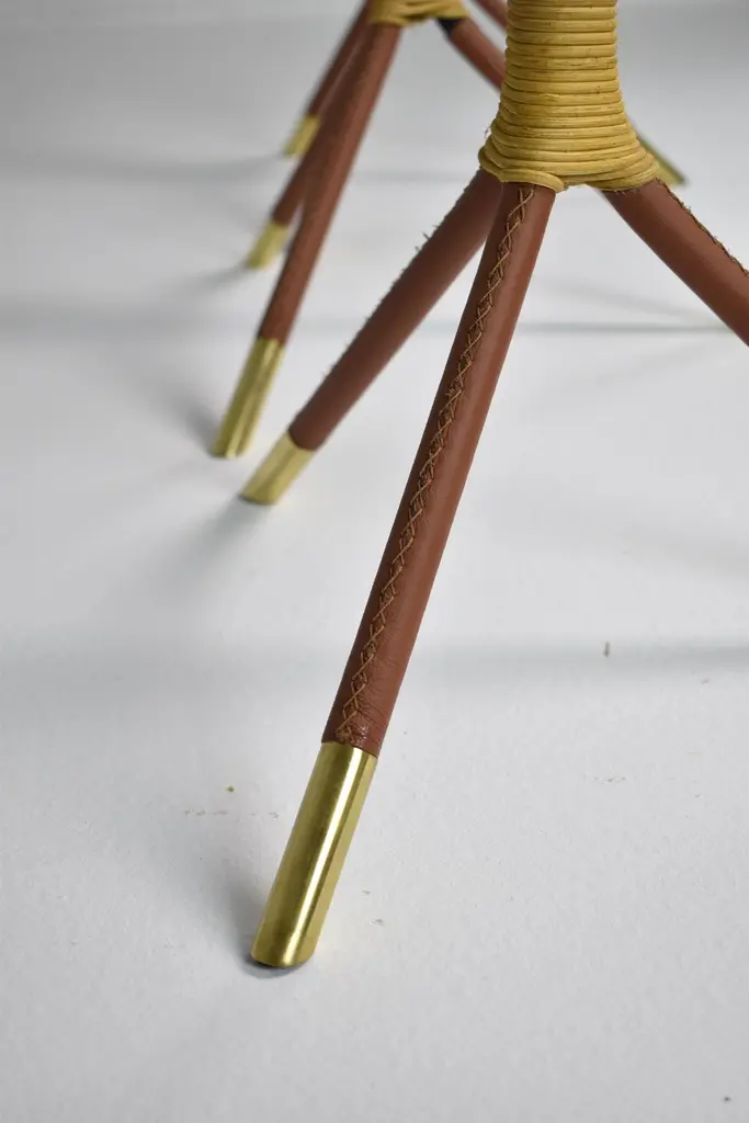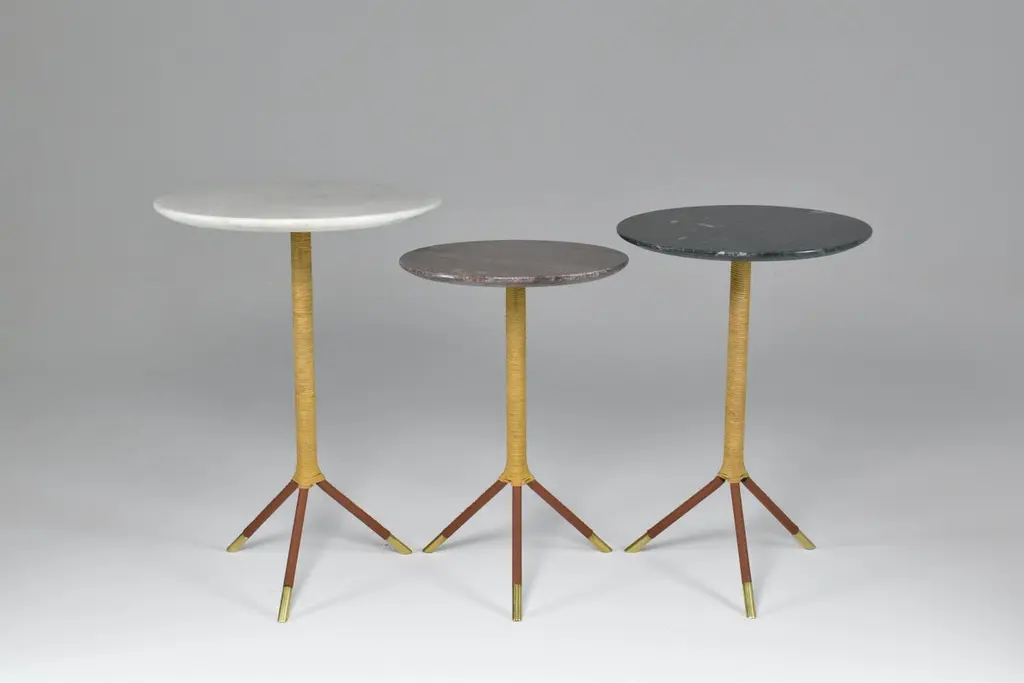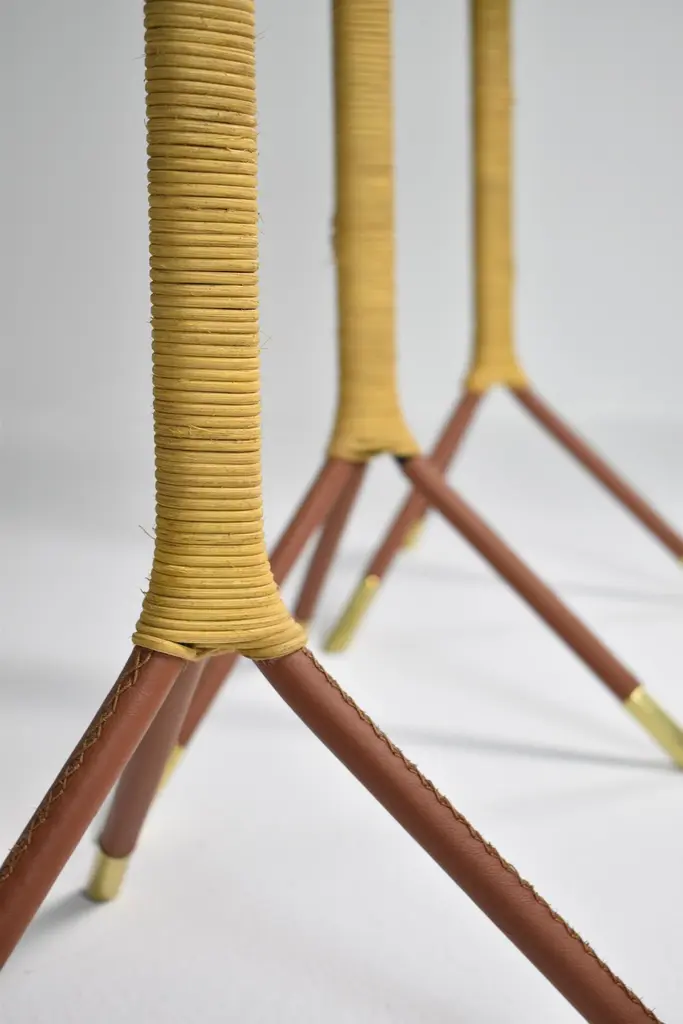 Handcrafted made-to-measure side table designed with a thick polished marble tabletop, a steel structure, and sustainably sourced natural rattan core. The hand-sewn leather sheathed tripod structure is highlighted by chic solid brass endings. Red marble:Ø 37 cm (14.5")H 55 cm (21.6")White marble:Ø 45 cm (17.7")H 65 cm (25.6")Green Guatemala marble:Ø 40 cm (15.7")H 60 cm (23.6")-----Our design studio - JAS - handcrafts bespoke brass lighting, tables, and ceramics. Our modular designs embrace a contemporary outlook on traditional Moroccan craftsmanship and high-quality Portuguese glass. Our know-how stems from combining traditional materials such as wicker, rattan, and leather and meticulous workmanship. Based in Paris and Rabat. Handcrafted in Portugal and Morocco.