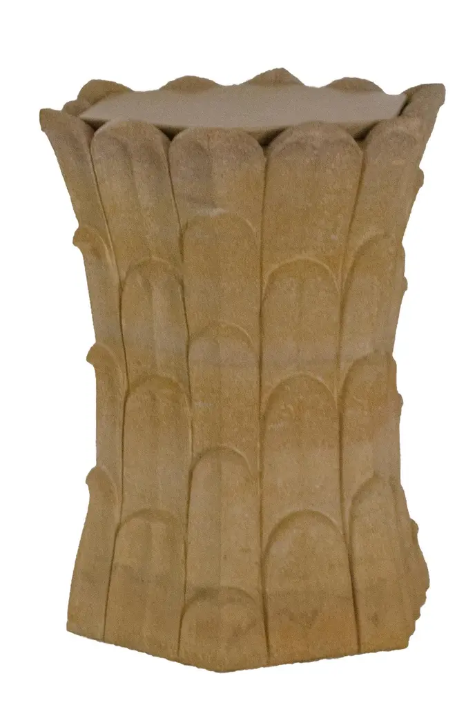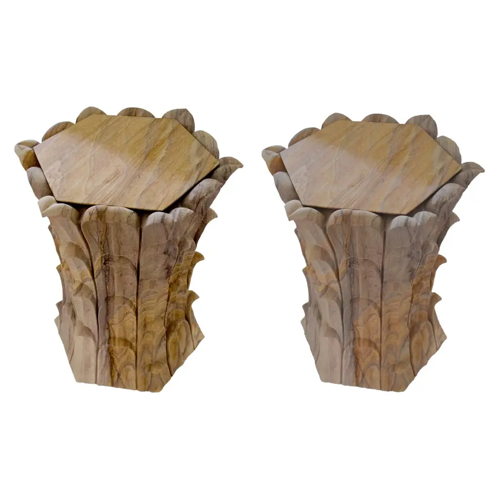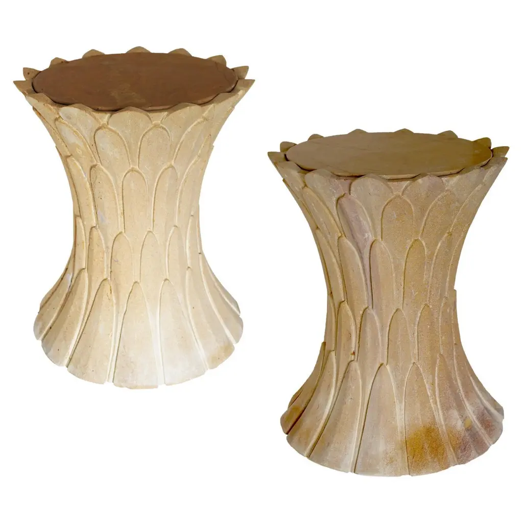Inspired by the temple carvings in and around Udaipur, Stephanie Odegard designed this unique side table using locally available stones. The arrangement of the carved leaf motif gives an impression of a dense Bamboo Grove.Set of Two Bamboo Grove Marble Tables in Jaisalmer StoneSize- 12" x 12" x 18" HMaterials - Jaisalmer Stone, Hand Carved, Semi matt finished.Buyer Cancellation-The cancellation charge is 25% which increases to 50% if the production is started.Prices do not include shipping from India (for custom orders) or our MN warehouse (items from stock). That will be additional.