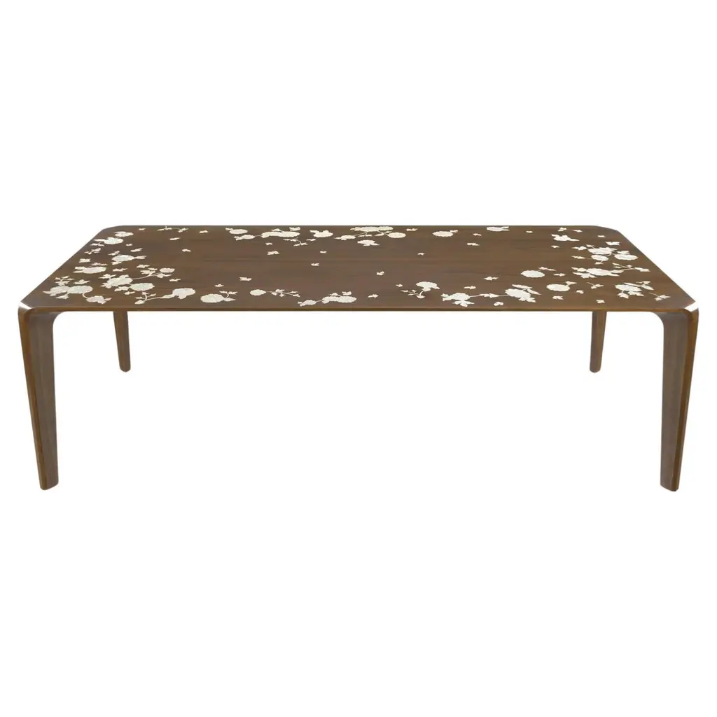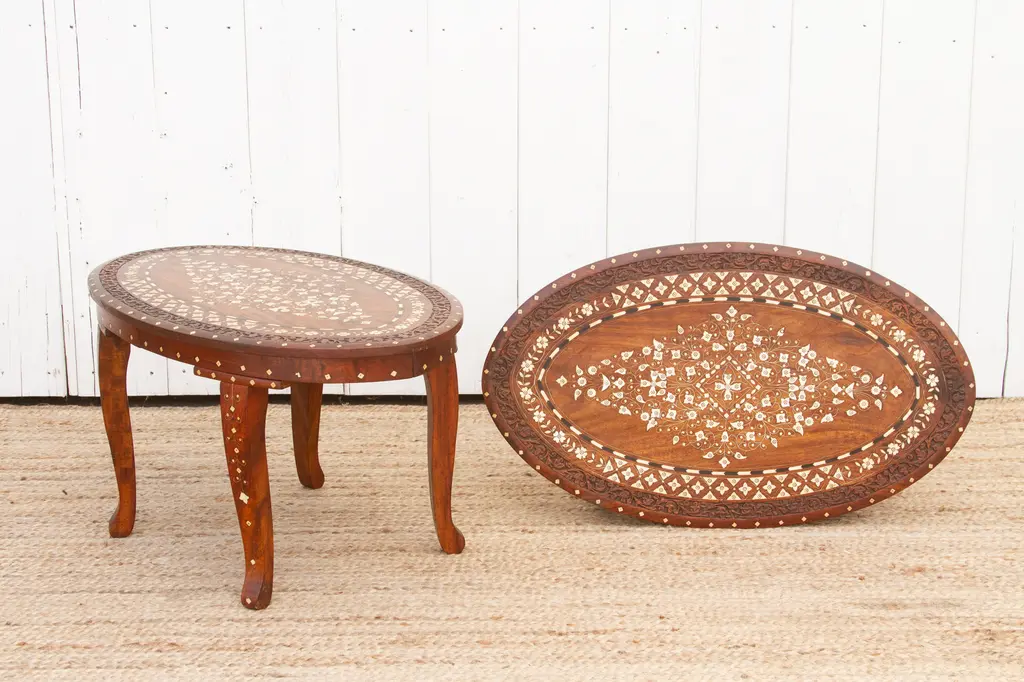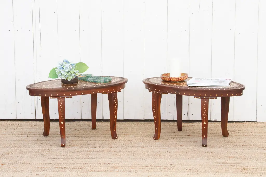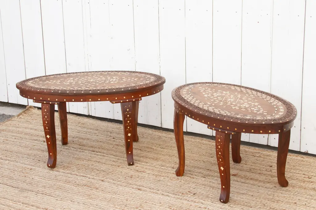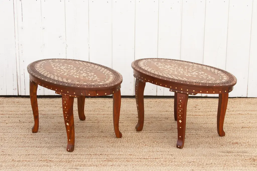 A set of 2 exquisite vintage Anglo-Indian rosewood side tables. With finely carved floral borders and detailed bone inlay floral work on the top, this pair of Indian end tables are a masterpiece of artistry. standing on four gracefully shaped legs with intricate decorative inlay, these tables seamlessly blends carving and inlay techniques for a captivating design.