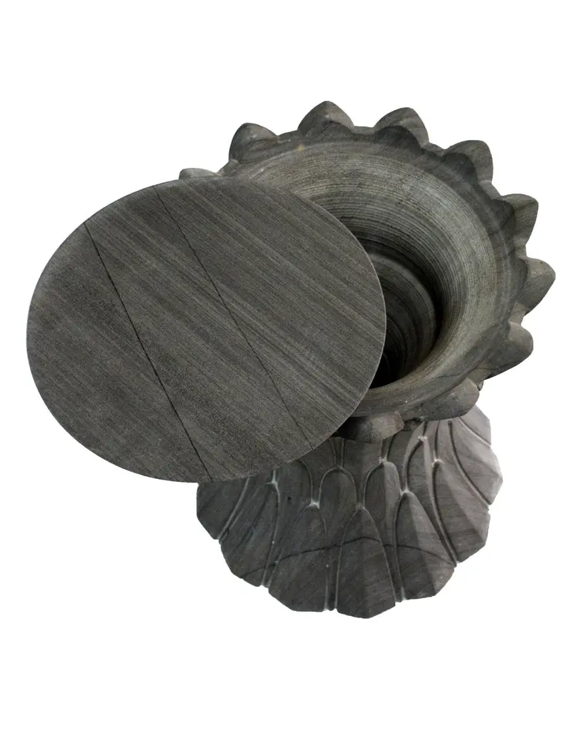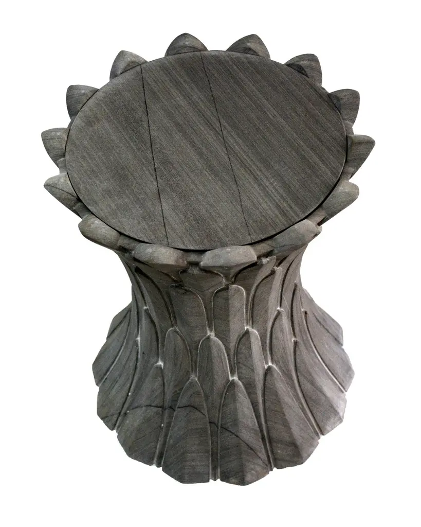 Inspired by the temple carvings in and around Udaipur, Stephanie Odegard designed this unique side table using locally available stones. The arrangement of the carved leaf motif is toned down to give a much lighter feel and appearance. Feathers Marble Tables in Agra Grey StoneSize- 14" x 14" x 17" H.Materials - Agra Grey Stone, Hand Carved, Semi matt finishBuyer Cancellation-The cancellation charge is 25% which increases to 50% if the production is started.Prices do not include shipping from India (for custom orders) or our MN warehouse (items from stock). That will be additional.Prices do not include shipping from India (for custom orders) or our MN warehouse (items from stock). That will be additional.