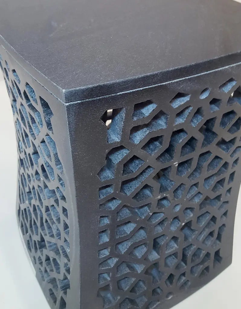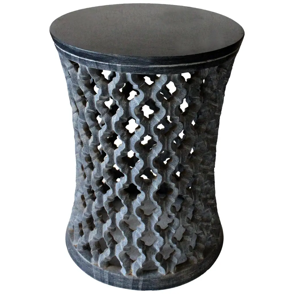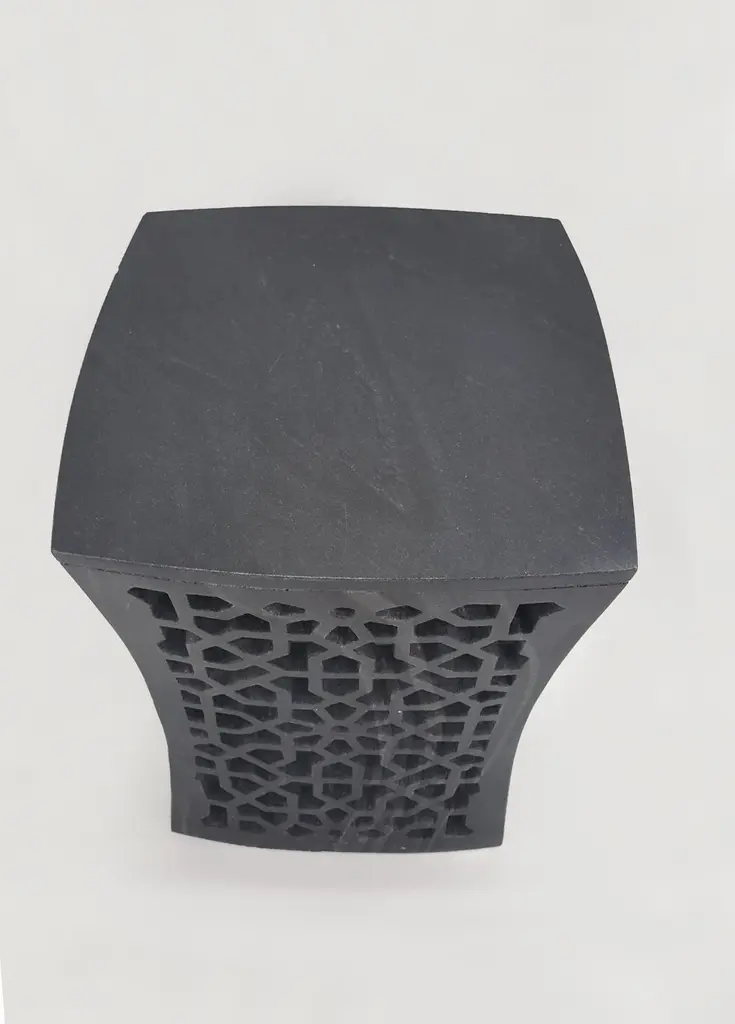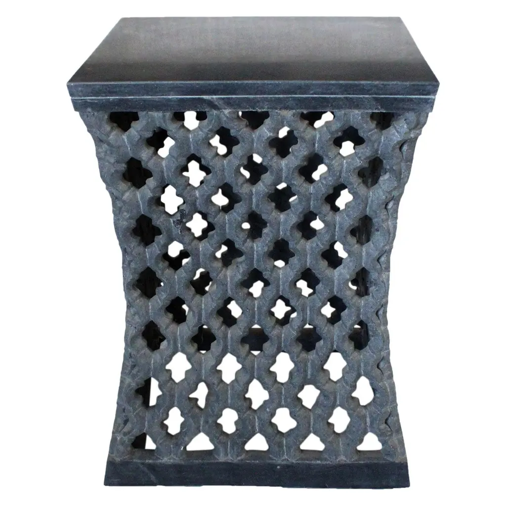 Inspired by the elegant pierced marble “Geometric jali” screens and windows he saw in the palaces of Mughal India, the renowned designer Paul Mathieu has created a unique collection of hand-carved side tables. Solid blocks of marble are hollowed out and hand-carved into low elegant tables through which light and air pass with ease. The intricate jali patterns are first traced onto the surface of the stone. Craftsmen then hand chisel and form hundreds of intricate, interlocking patterns in each piece before the tables are polished by hand. Jour Geometric Jali Side Tables in Black Marble Size- 12" x 12" x 16" HMaterials - Black Marble, Hand-CarvedBuyer Cancellation-The cancellation charge is 25% which increases to 50% if the production is started.Prices do not include shipping from India (for custom orders) or our MN warehouse (items from stock). That will be additional.