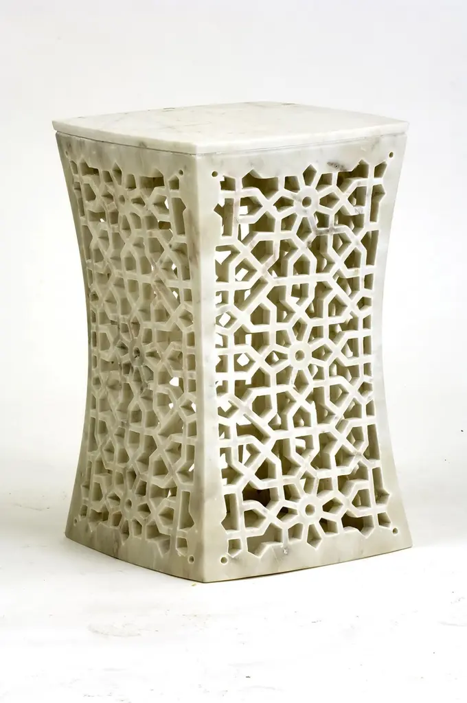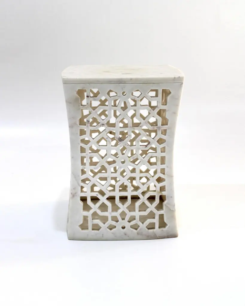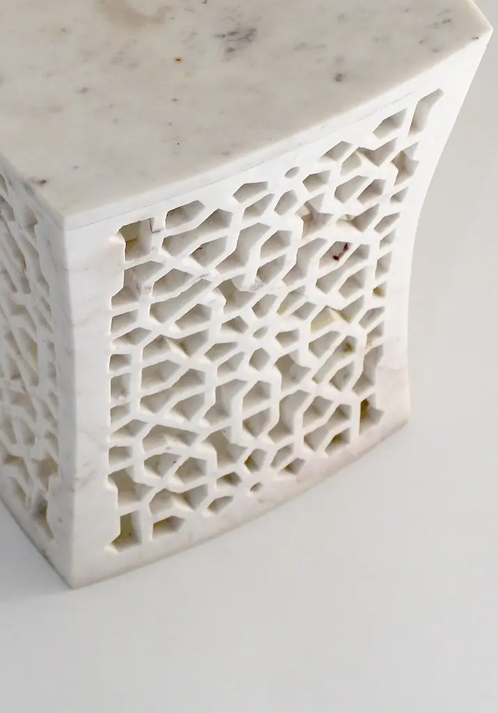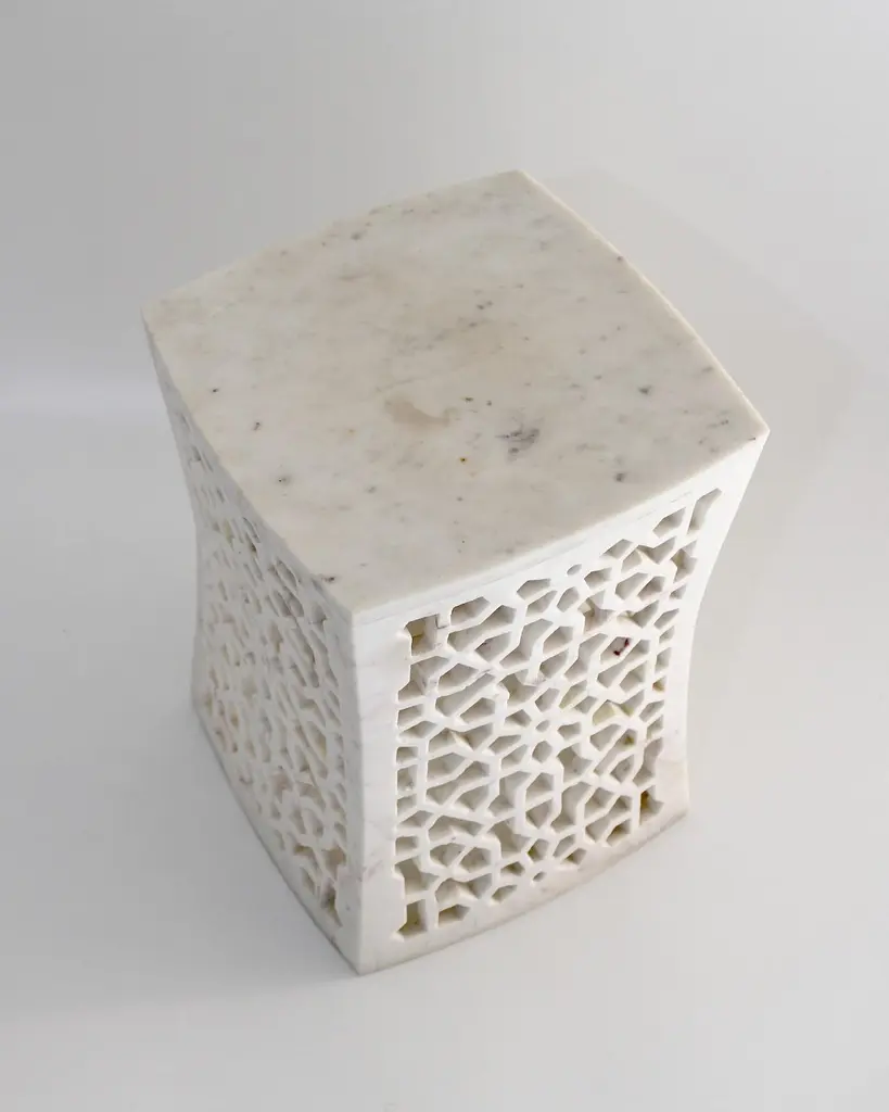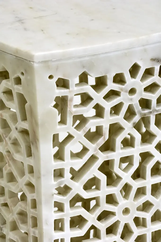 Inspired by the elegant pierced marble “Geometric jali” screens and windows he saw in the palaces of Mughal India, the renowned designer Paul Mathieu has created a unique collection of hand-carved side tables. Solid blocks of marble are hollowed out and hand-carved into low elegant tables through which light and air pass with ease. The intricate jali patterns are first traced onto the surface of the stone. Craftsmen then hand chisel and form hundreds of intricate, interlocking patterns in each piece before the tables are polished by hand. Jour Geometric Jali side tables in white marbleSize- 12" x 12" x 16" HMaterials - White marble, hand-carvedBuyer cancellation-The cancellation charge is 25% which increases to 50% if the production is started.Prices do not include shipping from India (for custom orders) or our MN warehouse (items from stock). That will be additional.