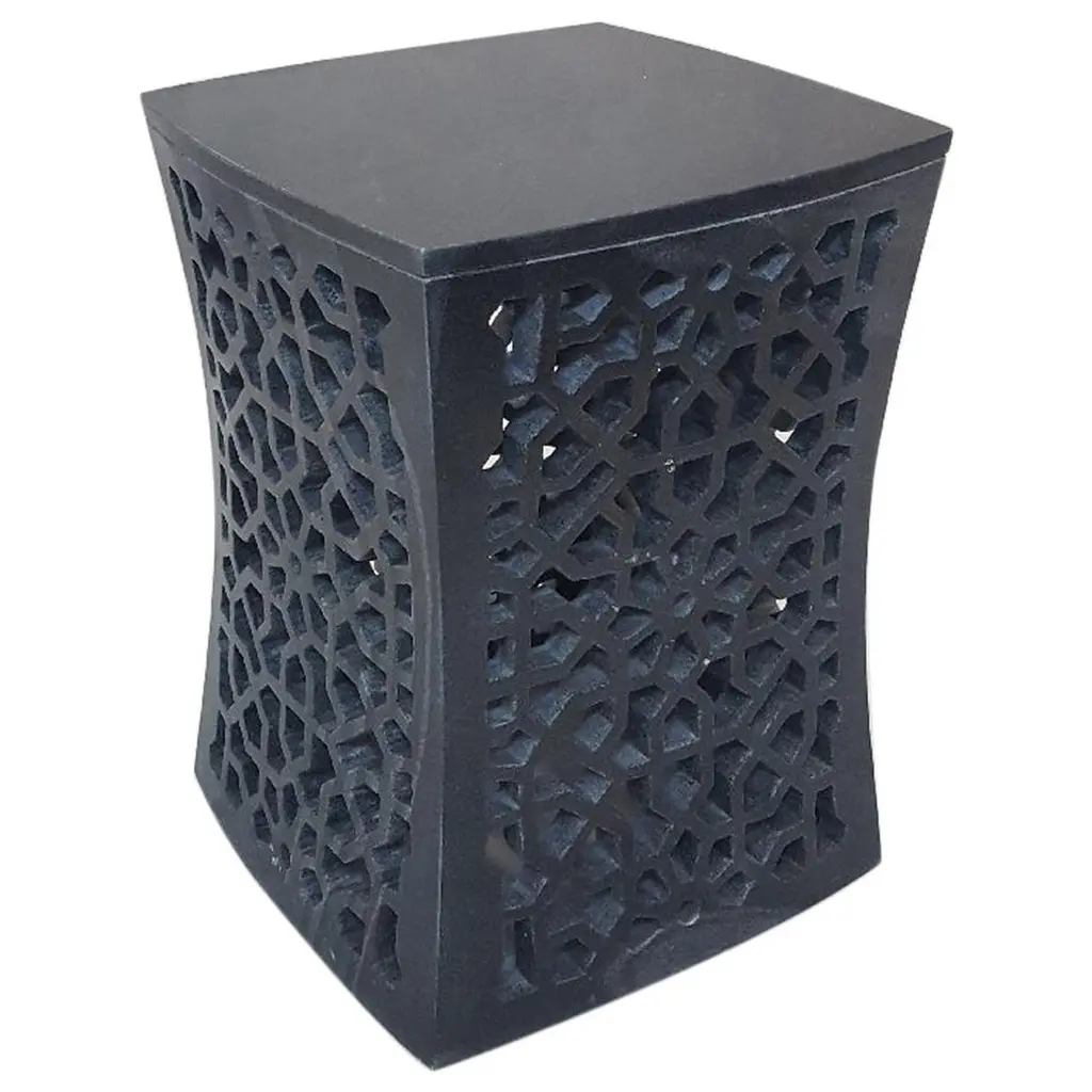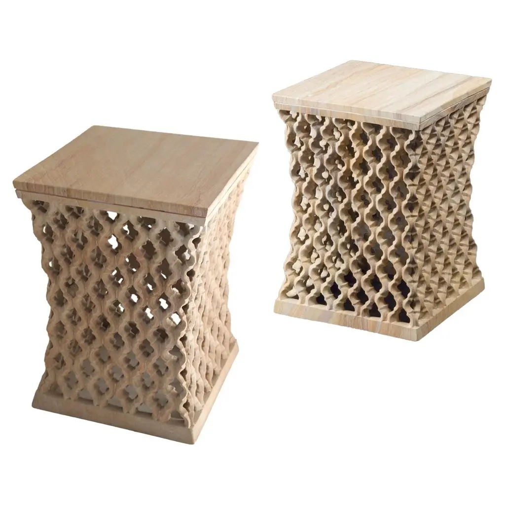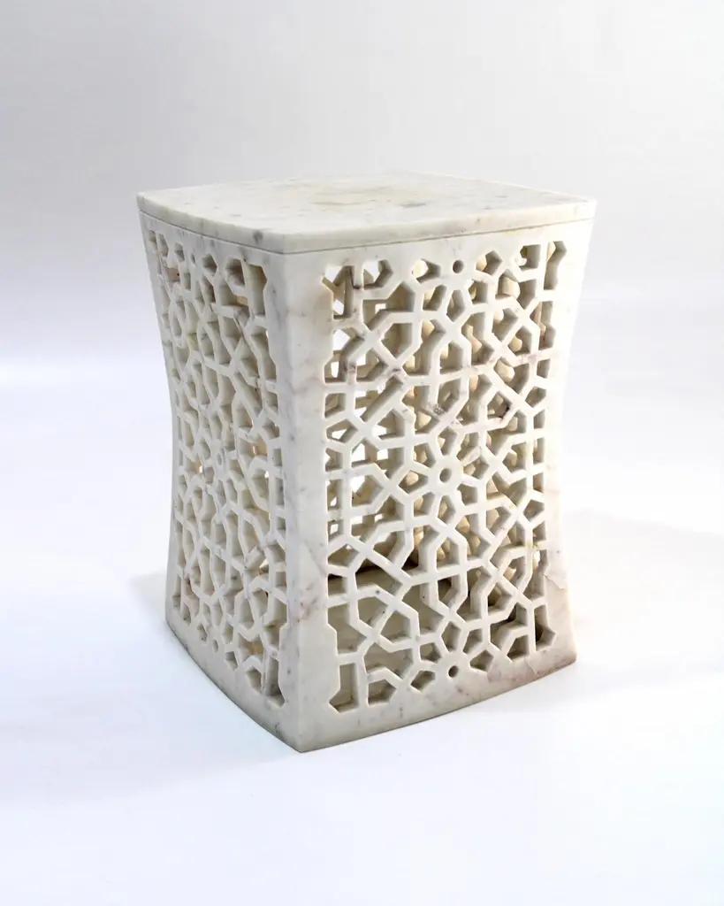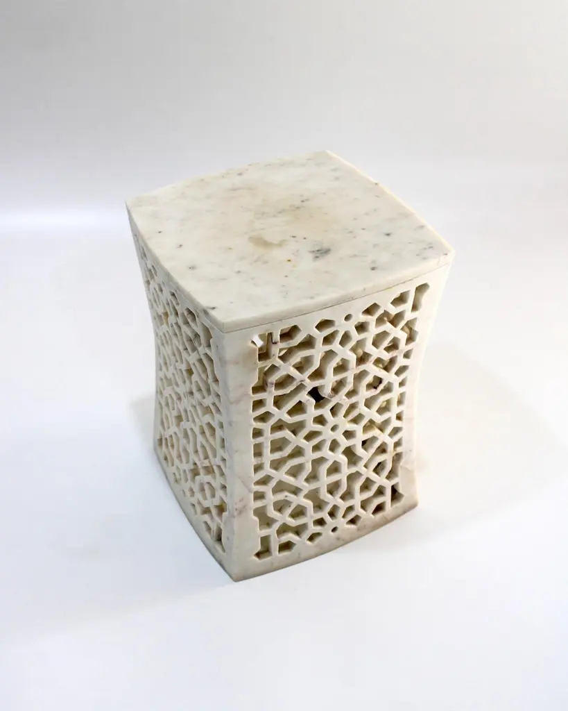 Inspired by the elegant pierced marble “Geometric jali” screens and windows he saw in the palaces of Mughal India, the renowned designer Paul Mathieu has created a unique collection of hand-carved side tables. Solid blocks of marble are hollowed out and hand-carved into low elegant tables through which light and air pass with ease. The intricate jali patterns are first traced onto the surface of the stone. Craftsmen then hand chisel and form hundreds of intricate, interlocking patterns in each piece before the tables are polished by hand. Jour Geometric Jali side tables in white marbleSize- 12" x 12" x 16" HMaterials - White marble, hand-carvedBuyer cancellation-The cancellation charge is 25% which increases to 50% if the production is started.Prices do not include shipping from India (for custom orders) or our MN warehouse (items from stock). That will be additional.