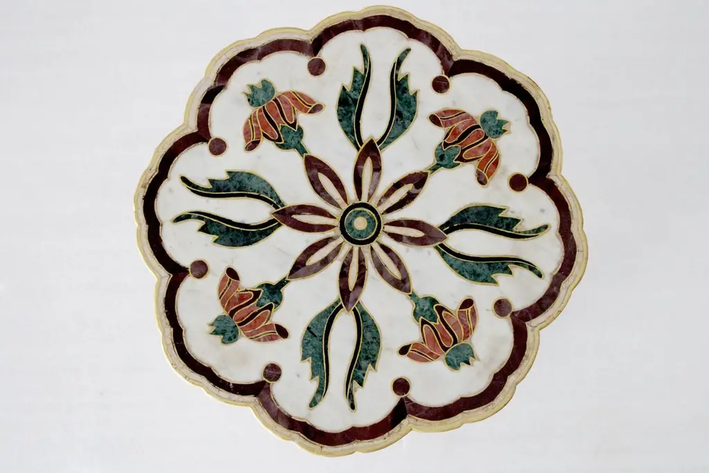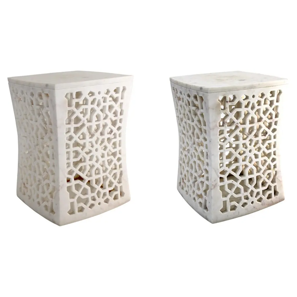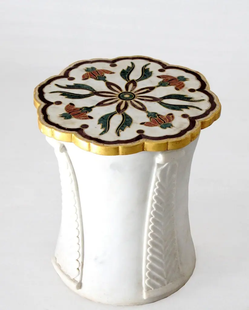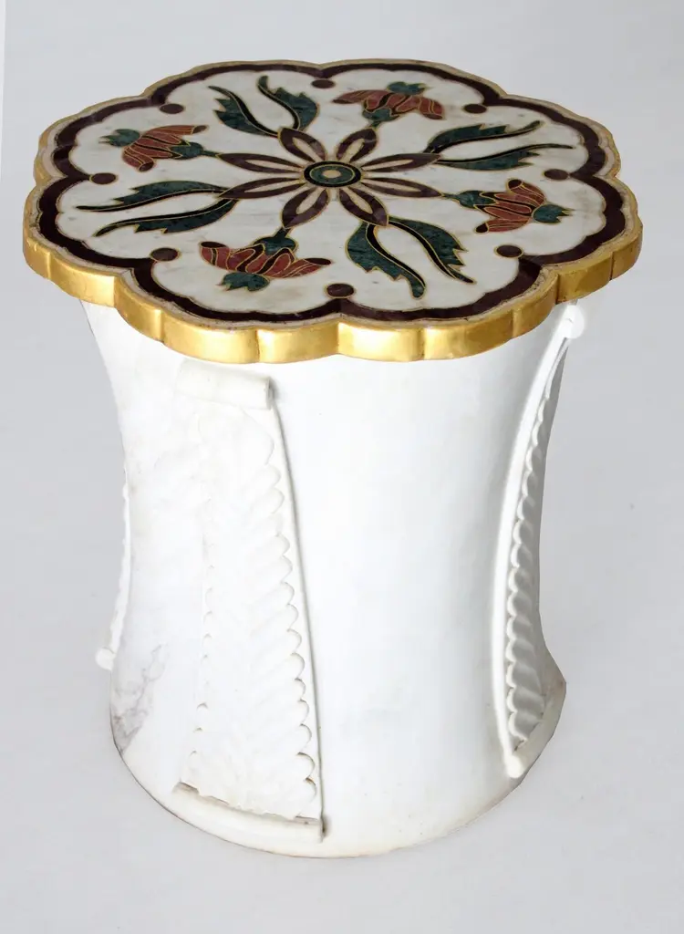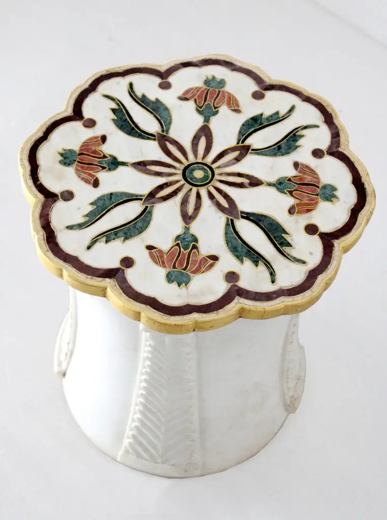 "Inspired by the elegant design elements of the palaces of Mughal India, and the technique of stone inlay - pacchikari. Solid blocks of marble are hollowed out and hand carved into this low elegant tables with leaves accents carved on all four sides. The master craftsmen then inlay the top with a floral motif using semi precious stones.Set of Two Mughal Side Tables in White Marble Size- 12"x12"x16"H Materials - White Marble , Inlay, Agate, Hand-Crafted, Semi precious stonesBuyer Cancellation-The cancellation charge is 25% which increases to 50% if the production is started.Prices do not include shipping from India (for custom orders) or our MN warehouse (items from stock). That will be additional.".