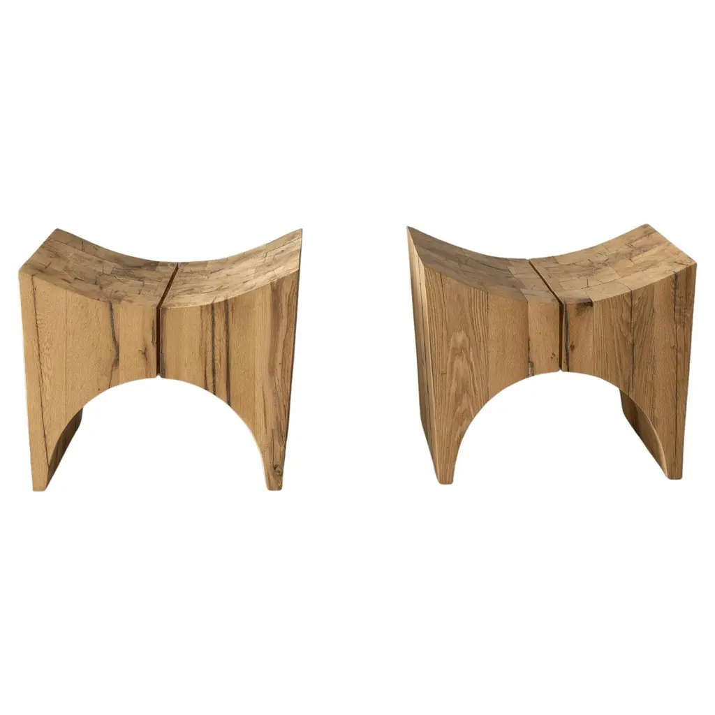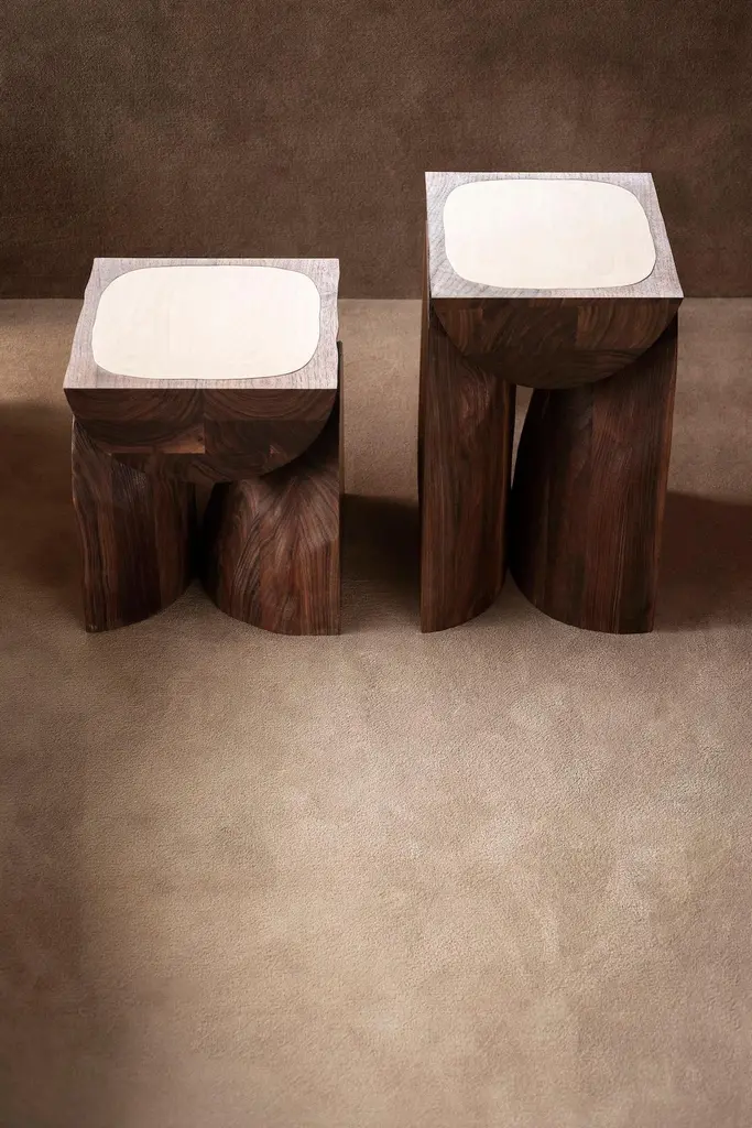 Bread side tables were designed by baking, slicing and stacking a loaf of Sourdough bread. From this rustic beginning, two sculptural side tables have emerged. Bread side table’s soft and naturalistic forms are carved from Ash. The warmth and tactility of the side tables is complimented with a stain that celebrates the wood’s natural grain. The side table’s Maple inlay is naturally stained in a pale primrose tone, giving the impression of a slice of buttered bread.Stained ash wood- Walnut stained and Maple woodOne: Cod. 0BRDTB01L 40 P 40 H 45 cmOne: Cod. 0BRDTB02L 35 P 35 H 60 cm