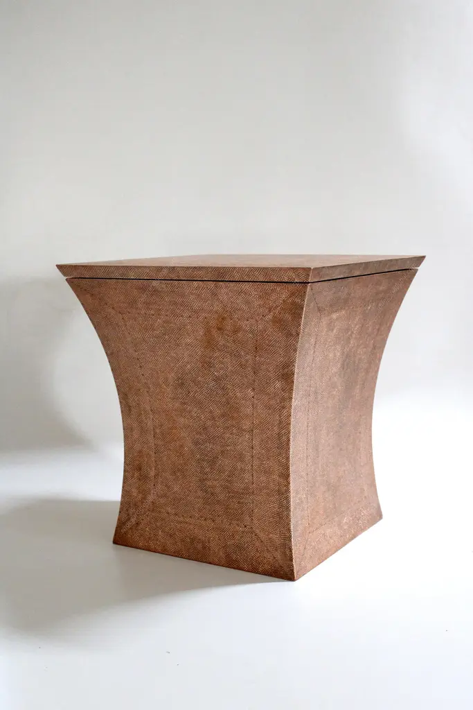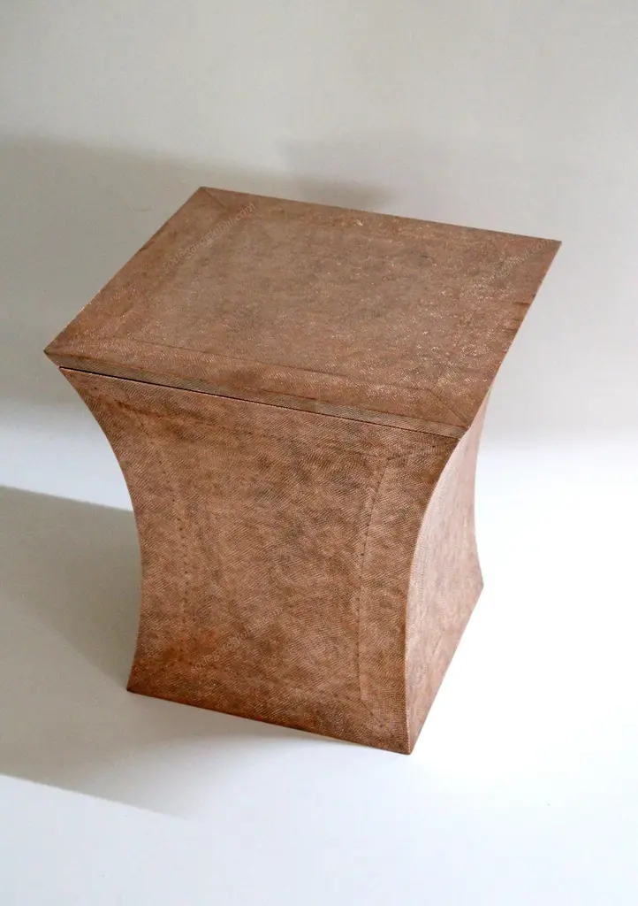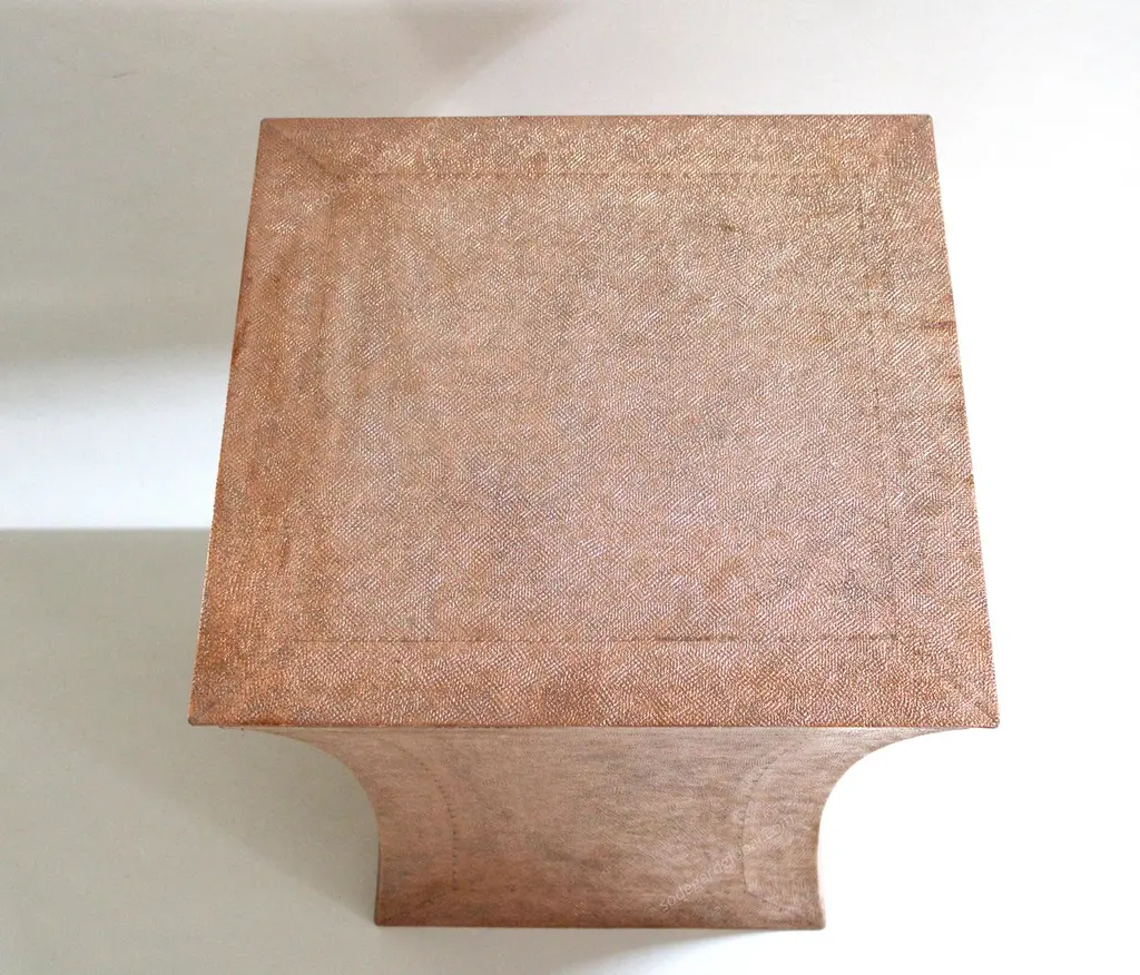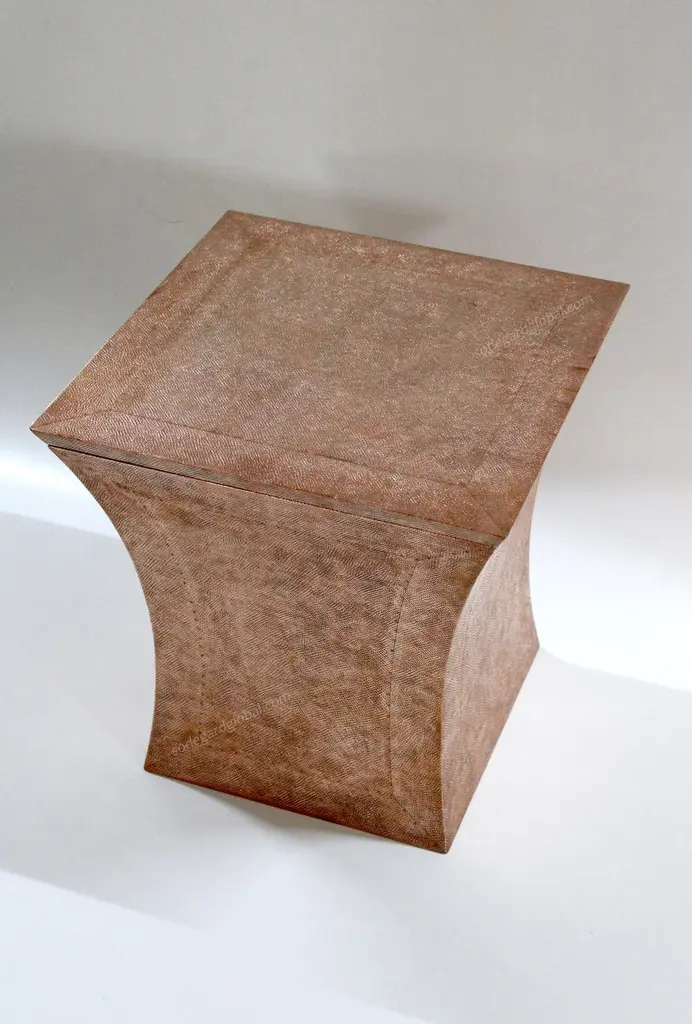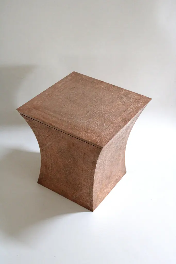 The traditional metal clad furniture he found in India inspired renowned designer Paul Mathieu to create this elegant and curvaceous storage bench. The arcing sides and top of this piece are hand carved from solid pieces of teak. The hinged lid opens to reveal a removable inset tray. Pattern makers trace and cut complex forms that will cover the bench from thick sheets of copper, brass or white bronze. Once the bench is joined together, it is meticulously encased in a tight fitting skin of white bronze, copper or brass. The metal finish will tarnish over time, but regular non-abrasive household metal polish can be used to restore the original luster. Brass, white bronze, antiqued bronze, silver and copper are the available options for the metal skin. Both silver and copper will tarnish over time. Regular non-abrasive household metal polishes can be used to restore the original finish. Customization is our specialty.Vaisseau side tables copperSize- 17" x 17" x 18" HMaterials - Copper, teak, cast, hand-craftedPlease note that moisture in air, sudden change in temperature and natural movement of wood over time causes the metal to wrinkle or bubble up. We use well seasoned, reclaimed teak and high quality marine grade MDF (wherever technically possible) to avoid and delay the above mentioned changes. However a perfect stability of metal cannot be guaranteed.Please note that our smooth finish metal clad pieces will have some unavoidable tool marks. This is proof that everything is done by hand. The smooth finish will not come out like a machine made perfect surface and the master artisan will do their best to make it look as good/clean/stable/perfect as he possibly can. Our hammered finishes are a much safer option if the tool mark scratches are unacceptable. The hammered finishes are also safer against eventual bubbling/wrinkles due to natural forces as mentioned above. We would love to send you some samples before order confirmation so that the finish can be judged and experienced first hand.Buyer Cancellation-The cancellation charge is 25% which increases to 50% if the production is started.Prices do not include shipping from India (for custom orders) or our MN warehouse (items from stock). That will be additional.