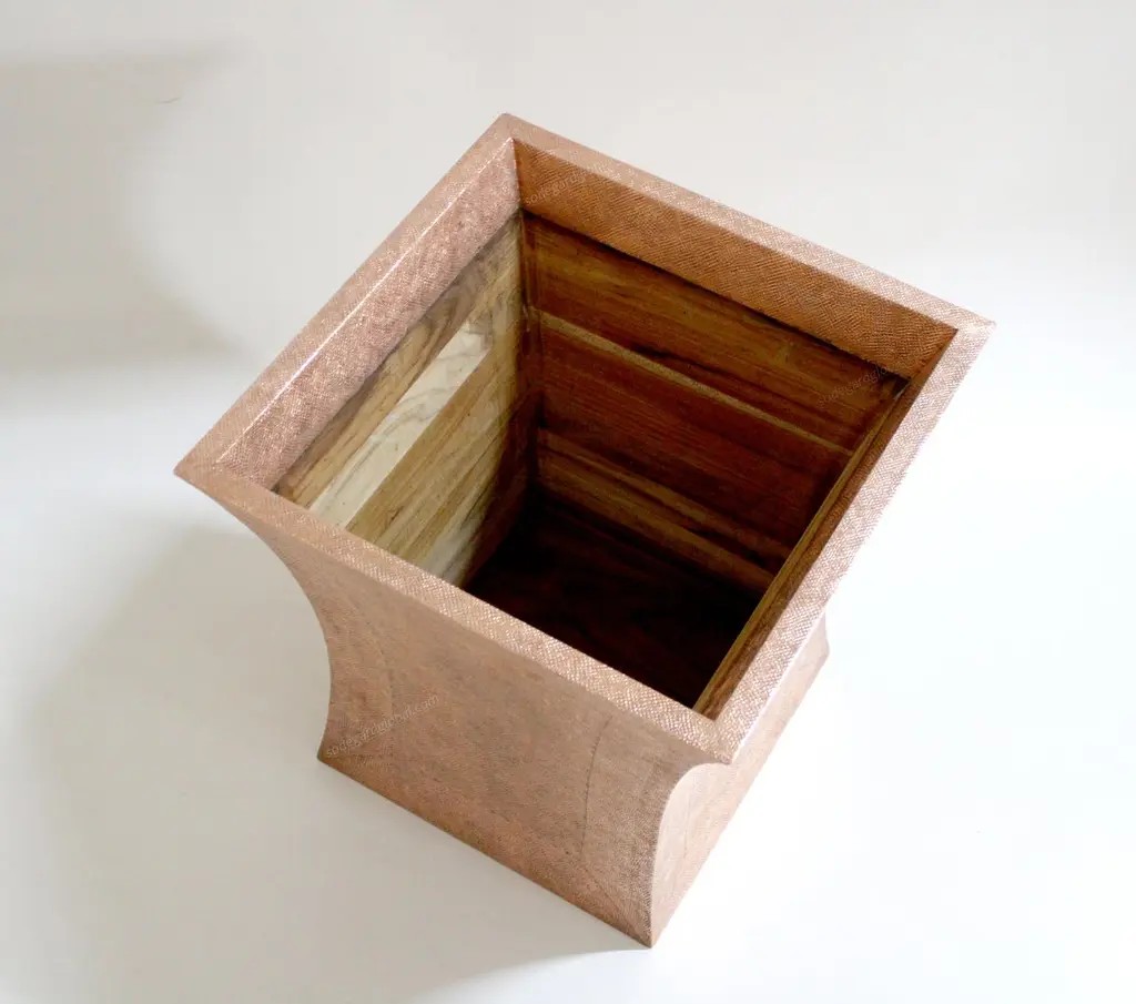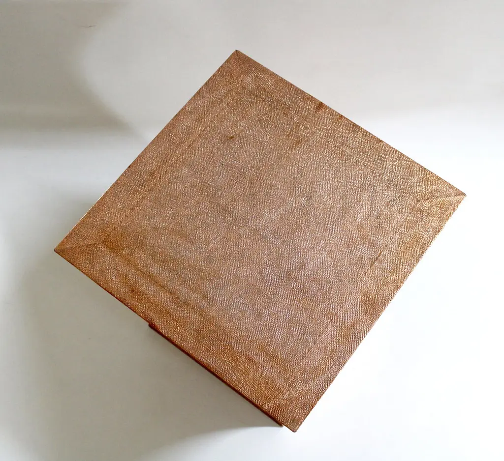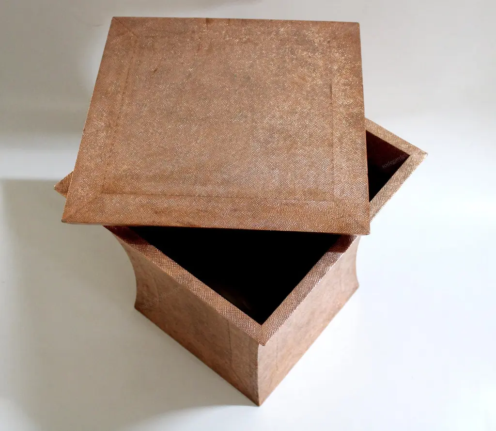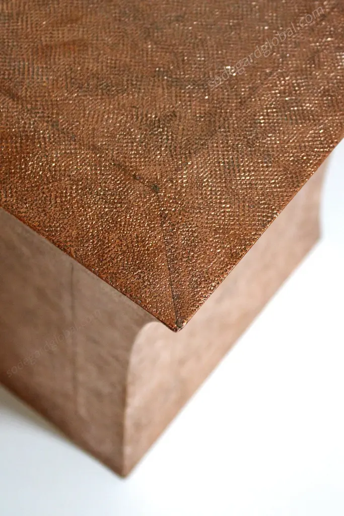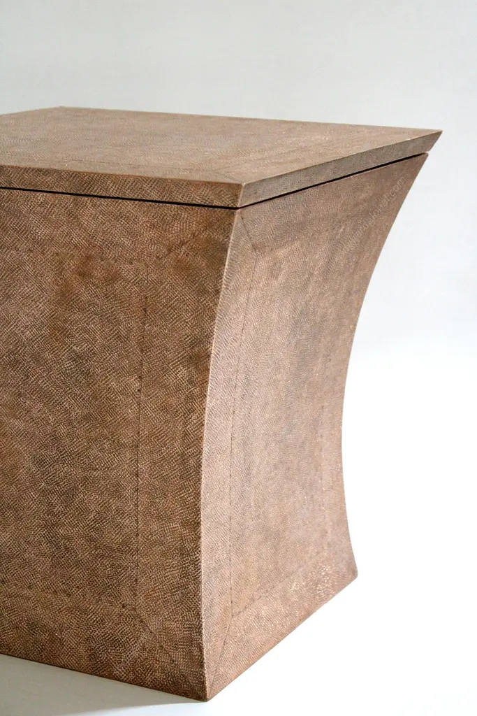 The traditional metal clad furniture he found in India inspired renowned designer Paul Mathieu to create this elegant and curvaceous storage bench. The arcing sides and top of this piece are hand carved from solid pieces of teak. The hinged lid opens to reveal a removable inset tray. Pattern makers trace and cut complex forms that will cover the bench from thick sheets of copper, brass or white bronze. Once the bench is joined together, it is meticulously encased in a tight fitting skin of white bronze, copper or brass. The metal finish will tarnish over time, but regular non-abrasive household metal polish can be used to restore the original luster. Brass, white bronze, antiqued bronze, silver and copper are the available options for the metal skin. Both silver and copper will tarnish over time. Regular non-abrasive household metal polishes can be used to restore the original finish. Customization is our specialty.Vaisseau side tables copperSize- 17" x 17" x 18" HMaterials - Copper, teak, cast, hand-craftedPlease note that moisture in air, sudden change in temperature and natural movement of wood over time causes the metal to wrinkle or bubble up. We use well seasoned, reclaimed teak and high quality marine grade MDF (wherever technically possible) to avoid and delay the above mentioned changes. However a perfect stability of metal cannot be guaranteed.Please note that our smooth finish metal clad pieces will have some unavoidable tool marks. This is proof that everything is done by hand. The smooth finish will not come out like a machine made perfect surface and the master artisan will do their best to make it look as good/clean/stable/perfect as he possibly can. Our hammered finishes are a much safer option if the tool mark scratches are unacceptable. The hammered finishes are also safer against eventual bubbling/wrinkles due to natural forces as mentioned above. We would love to send you some samples before order confirmation so that the finish can be judged and experienced first hand.Buyer Cancellation-The cancellation charge is 25% which increases to 50% if the production is started.Prices do not include shipping from India (for custom orders) or our MN warehouse (items from stock). That will be additional.