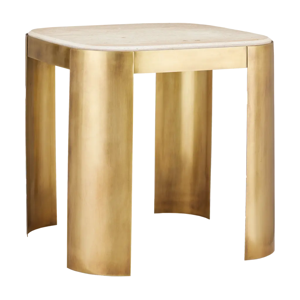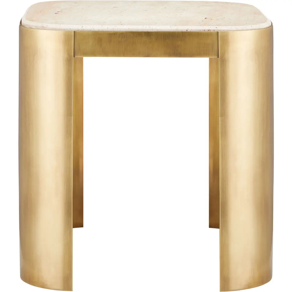 At the top of the mod-squad list, the Sev Travertine Accent Table has a shape that looks back to the past but with forward-thinking finishing techniques. The stainless steel table with a contemporary shape has a gold finish. The natural travertine top sits proud so it will always stay in place. Due to the nature of travertine, there will be color and texture variations.
