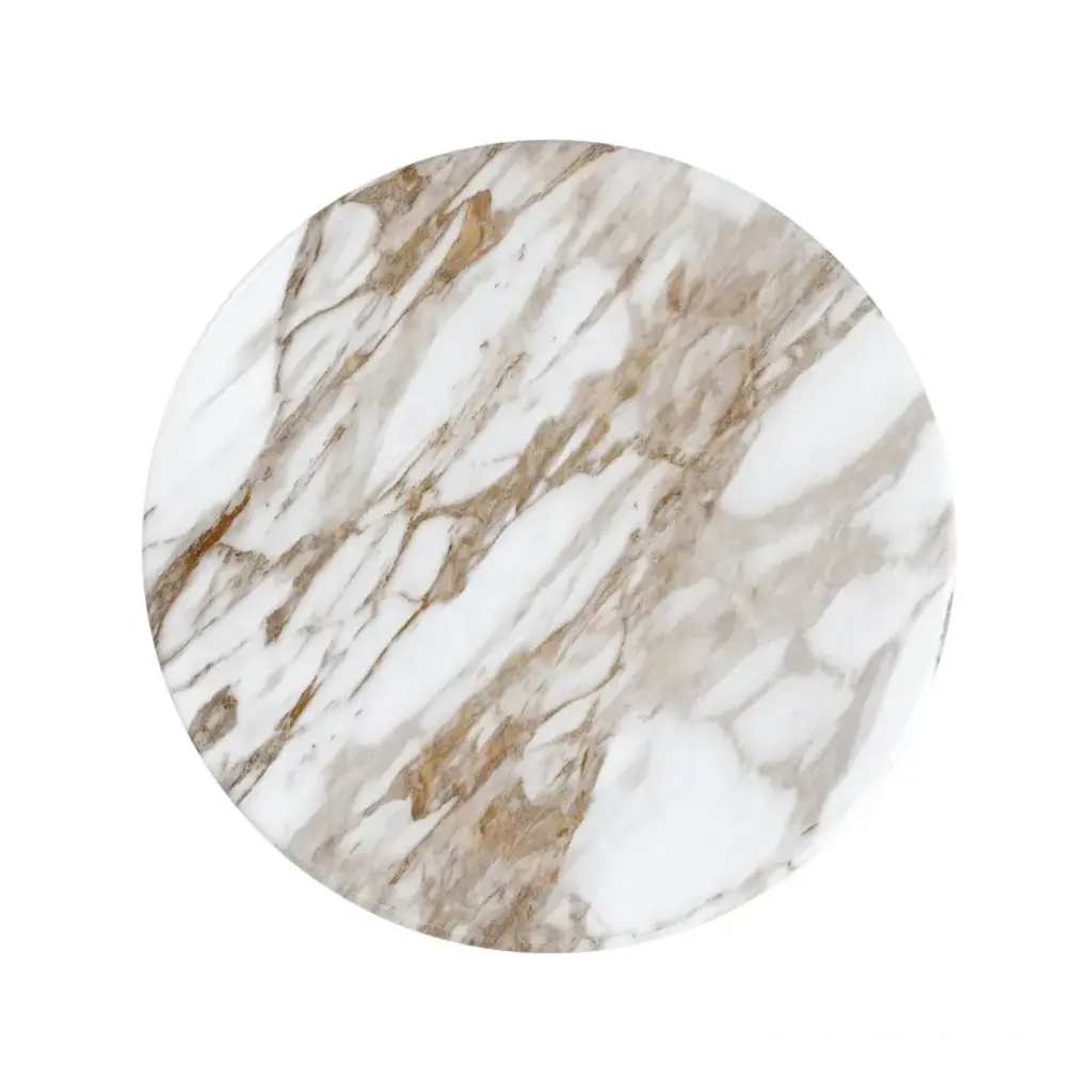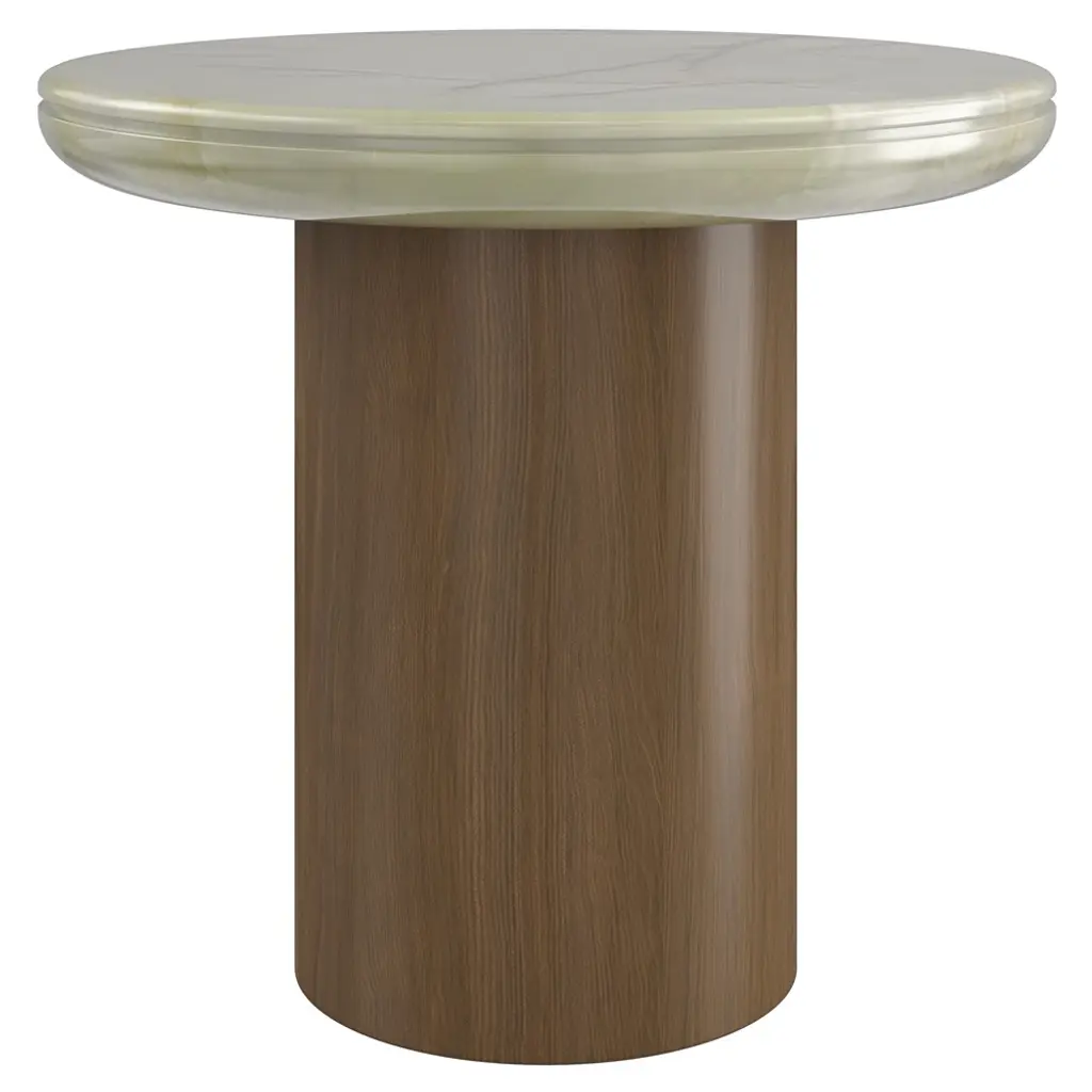 Designed to tuck into a notch on our Seychelles cocktail table, this boldly modern accent table makes an unforgettable statement. Features a highly figured, sculpted Calcutta Oro stone top with caramel veining, warmly complemented by a rounded base in a Retro Walnut finish. A standout on its own, or a functional piece that adds surface and dimension in tandem with the cocktail table.