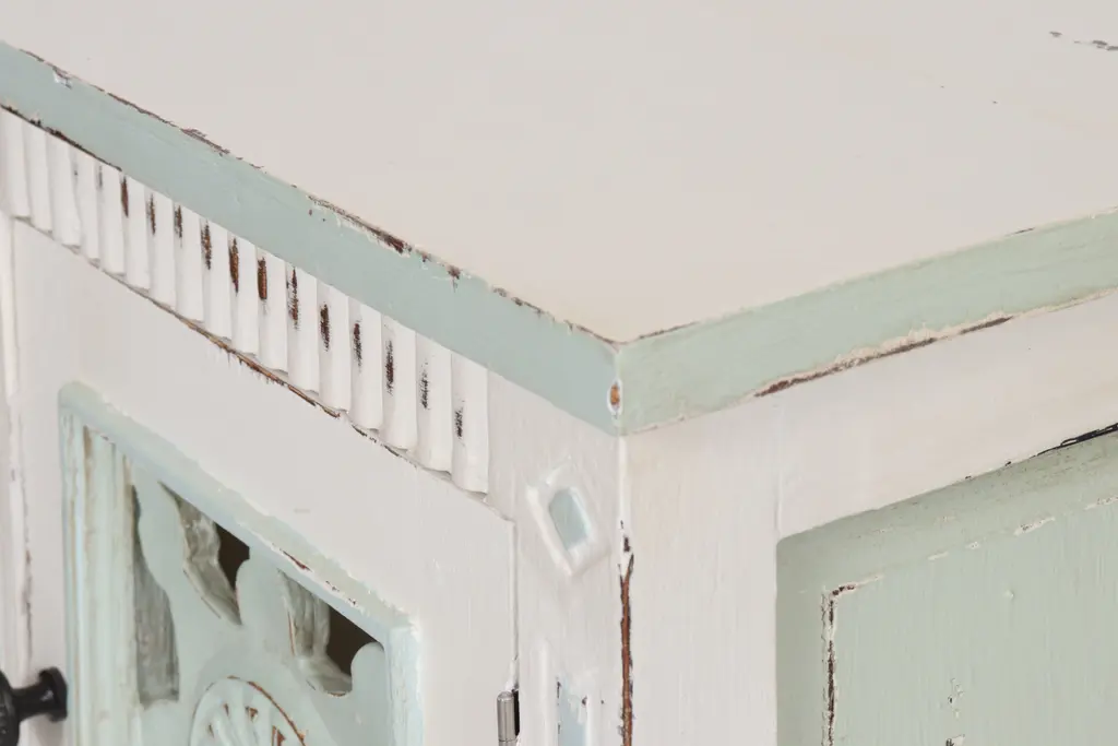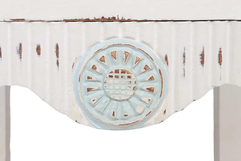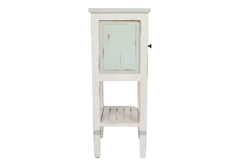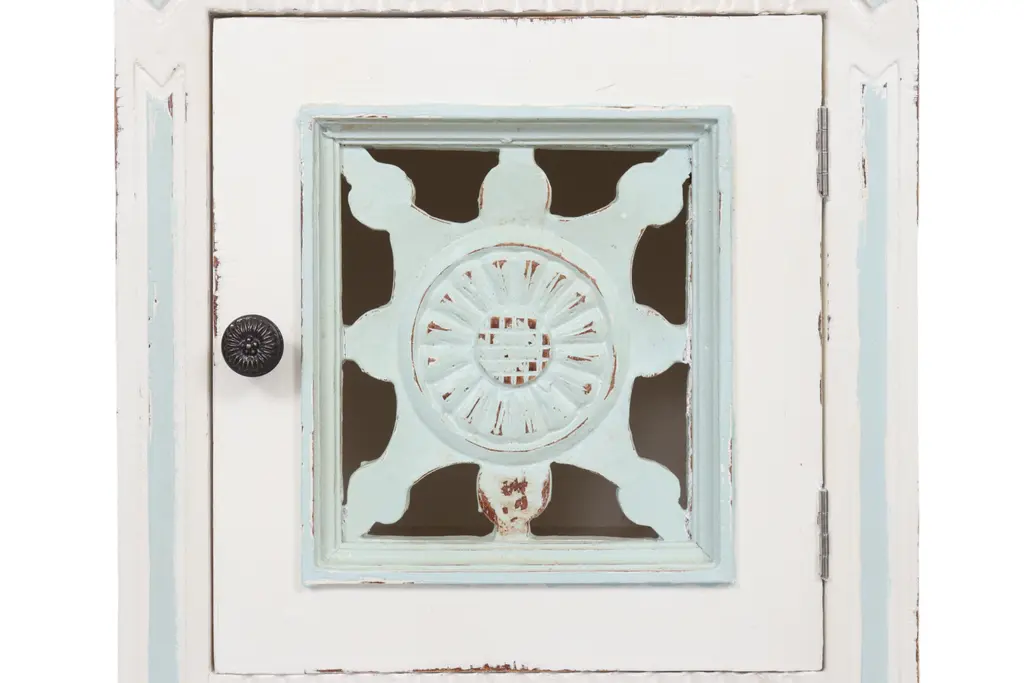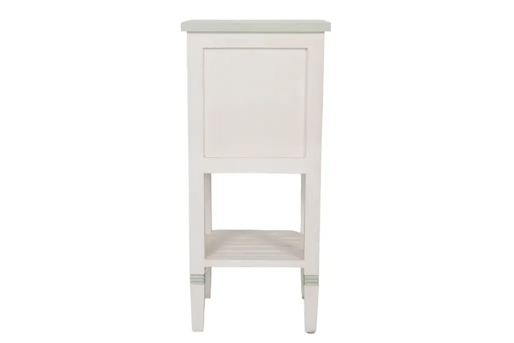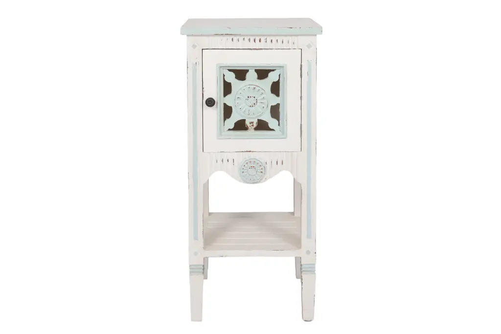 A shabby chic side table made of solid wood and painted in white with teal details. The cabinet door is pierced and decorated with a simply carved sunflower motif that repeats on the reeded skirt below. Straight square legs support a slatted shelf and finish with squared tapered feet.