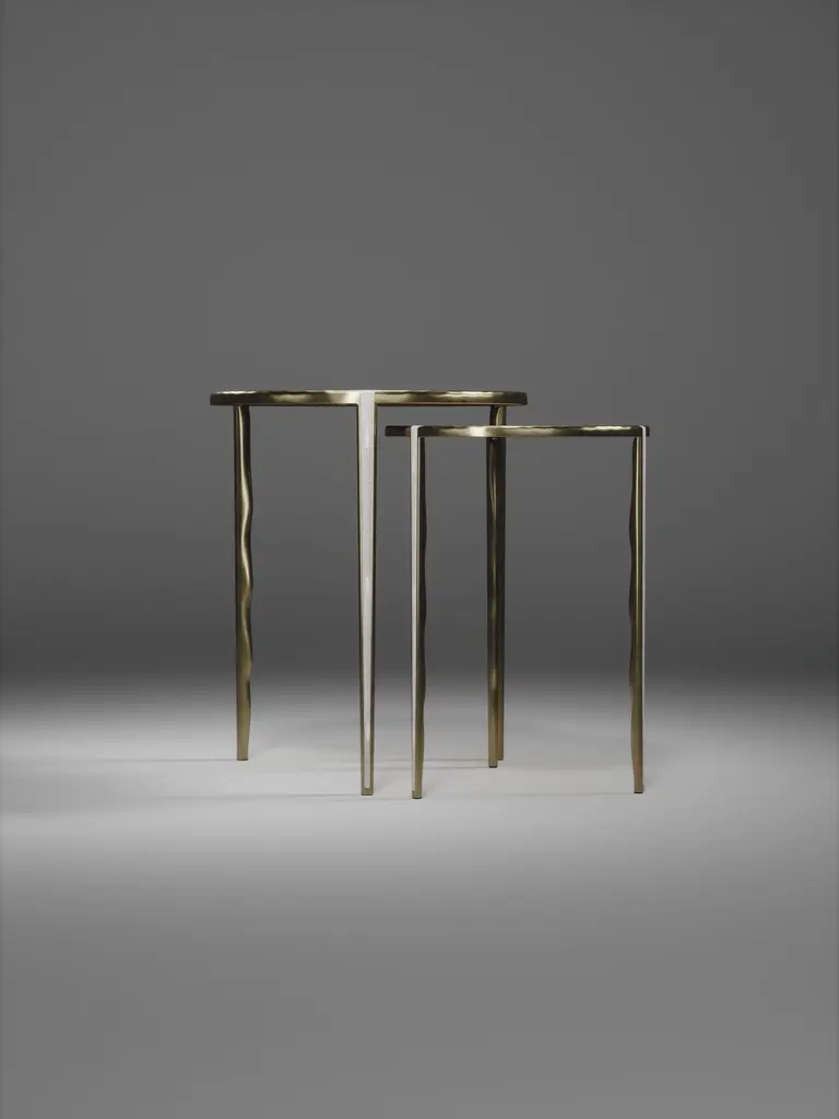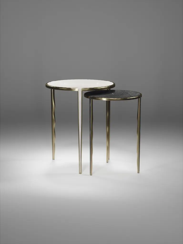 The Paris based label has distinguished themselves since their launch, with their iconic use of shagreen mixed with brass and other exotic materials. All furniture is handcrafted by skilled artisans, ultimately making each piece unique, designed in Paris and produced in the Philippines.The set of 2 round melting nesting side tables, are the perfect accent pieces for any living space. These are sold as a set of 2 to create elegant and geometric shapes, but one can purchase the tables on their own. The large and medium size are inlaid in white quartz and cream shagreen respectively, both tops are framed with an irregular surface bronze-patina brass that continues onto the legs, which creates the "melting" effect against the shagreen/quartz inlay. These pieces come in other finishes and rectangle shapes, see image at end of slide. The dimensions of this piece are Medium- 40 diameter x 55 cmLarge- 50 diameter x 60 cmAll R&Y Augousti pieces are handmade by artisans, ultimately making each piece unique. Custom color/sizing available on request. Wipe clean with soft dry cloth.Acclaimed design duo Ria & Yiouri Augousti have established themselves since the 1990s as pioneers of modern-vintage style through their luxurious Art Deco inspired collections.The Paris based label has distinguished themselves since their launch, with their iconic use of shagreen mixed with brass and other exotic materials. All furniture is handcrafted by skilled artisans, ultimately making each piece unique. All shagreen-covered items should be kept out of direct sunlight, color variants may occur on the stingray and other exotic finishes, but this showcases the Parisian label's commitment to creating authentic luxurious products using natural components.