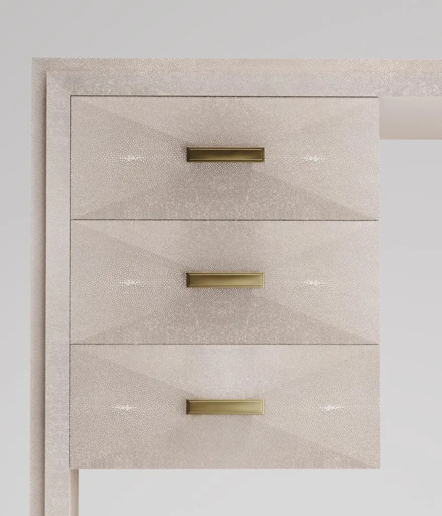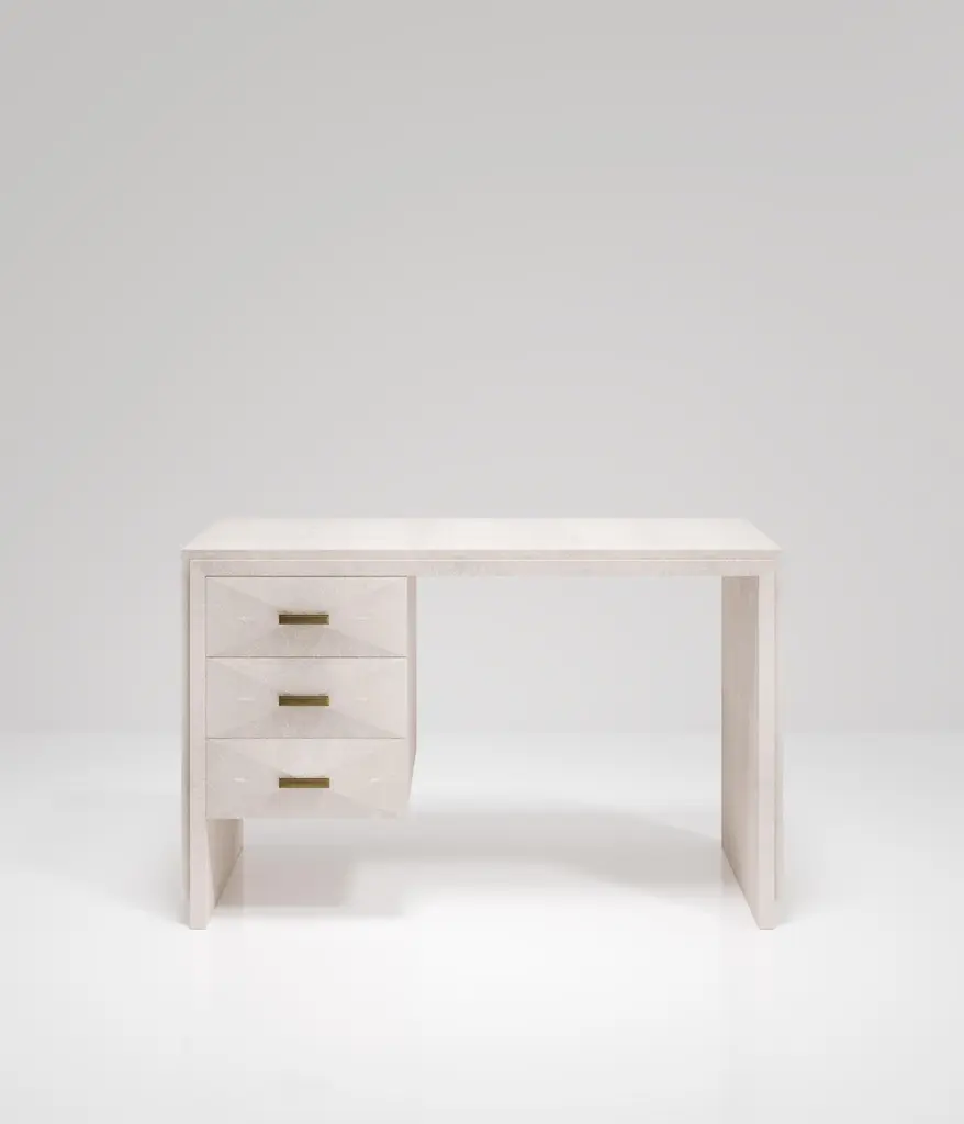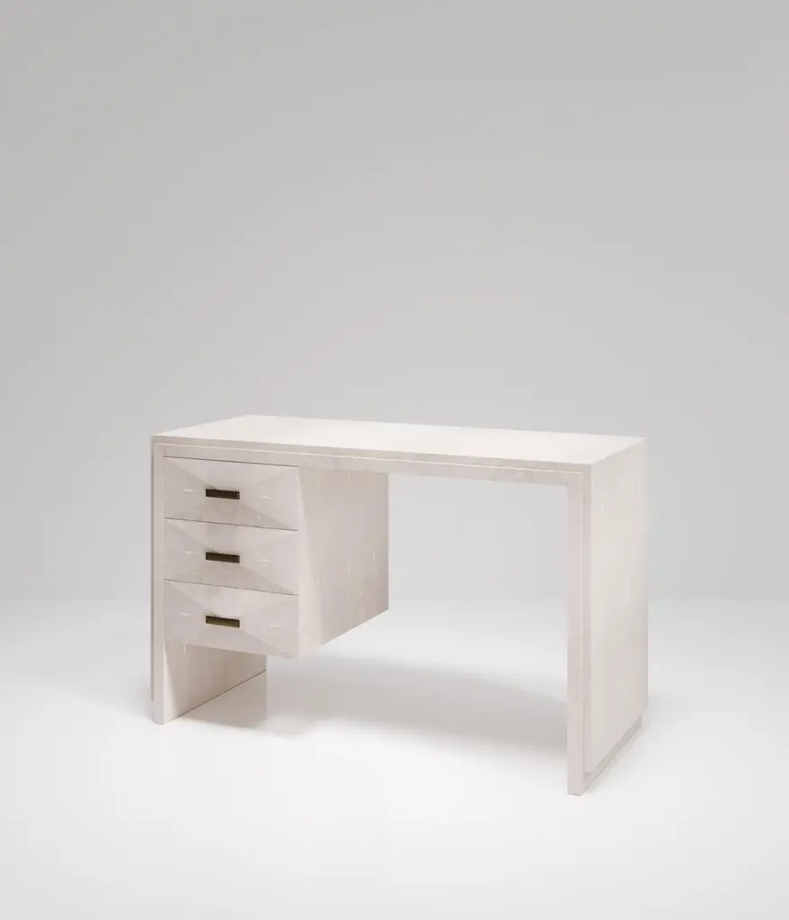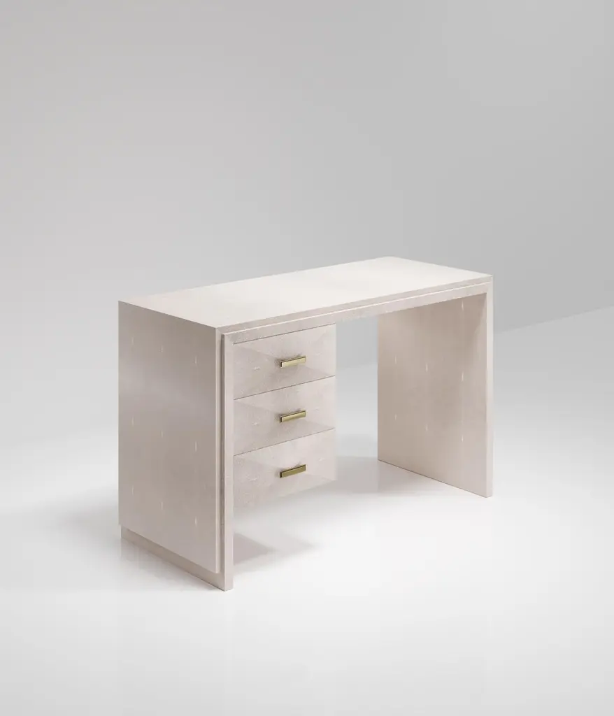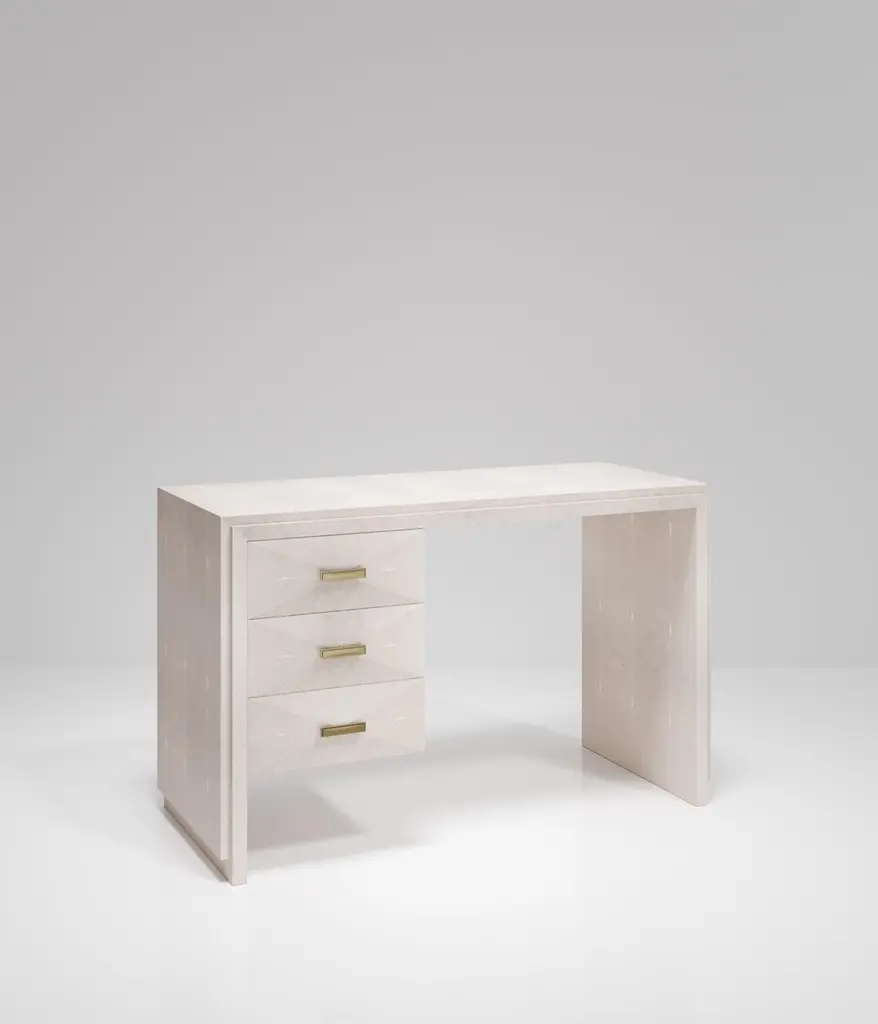 The Paris based label has distinguished themselves since their launch, with their iconic use of shagreen mixed with brass and other exotic materials. All furniture is handcrafted by skilled artisans, ultimately making each piece unique, designed in Paris and produced in the Philippines.The Iconic Writing Desk is both elegant and minimalist with its classic aesthetic that showcases the purity of the beautiful Augousti craftsmanship. This piece is completely inlaid in cream shagreen and includes 3 bevelled drawers on the left side of the desk with bronze patina brass handles. Available in other finishes and materials; see images at end of slide. A side table and chest of drawers version is also available, see images at end of slide. Custom color/sizing available on request.The finish of the shagreen is authentic as it is hand-dyed and the designer calls the finish look: "antique natural".The dimensions of this piece are 47" x 19" x 29".All R&Y Augousti pieces are handmade by artisans, ultimately making each piece unique. Wipe clean with soft dry cloth.Acclaimed design duo Ria & Yiouri Augousti have established themselves since the 1990s as pioneers of modern-vintage style through their luxurious Art Deco inspired collections.The Paris based label has distinguished themselves since their launch, with their iconic use of shagreen mixed with brass and other exotic materials. All furniture is handcrafted by skilled artisans, ultimately making each piece unique. All shagreen-covered items should be kept out of direct sunlight, color variants may occur on the stingray and other exotic finishes, but this showcases the Parisian label's commitment to creating authentic luxurious products using natural components.