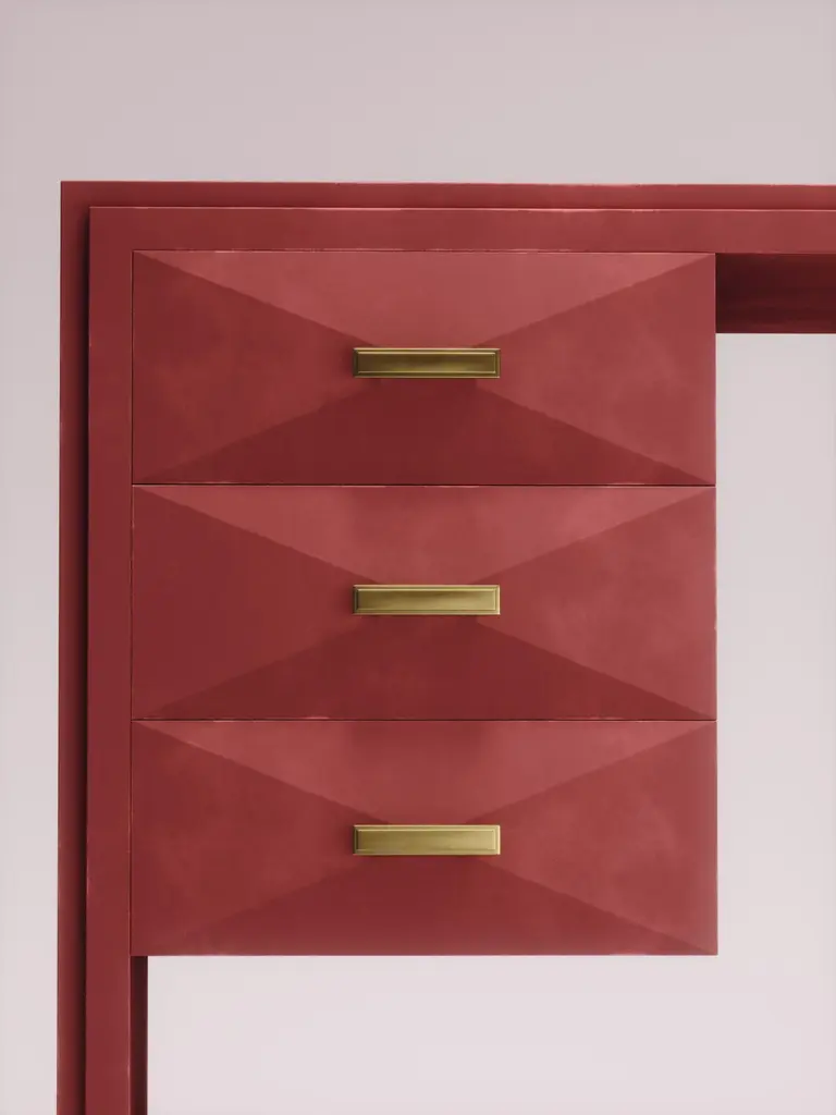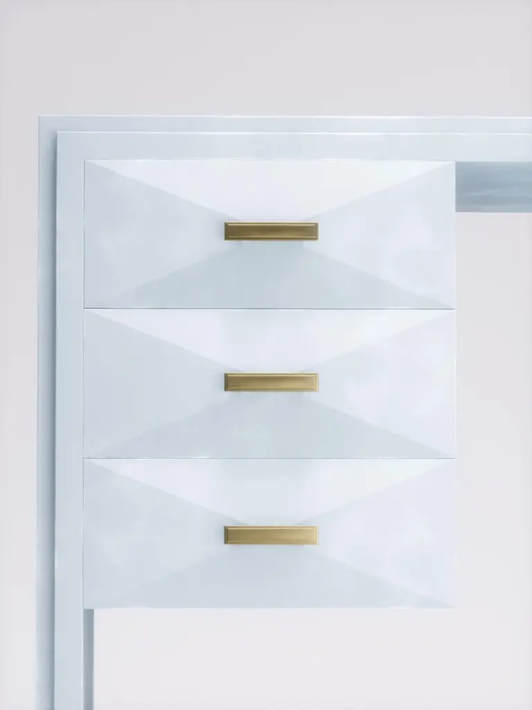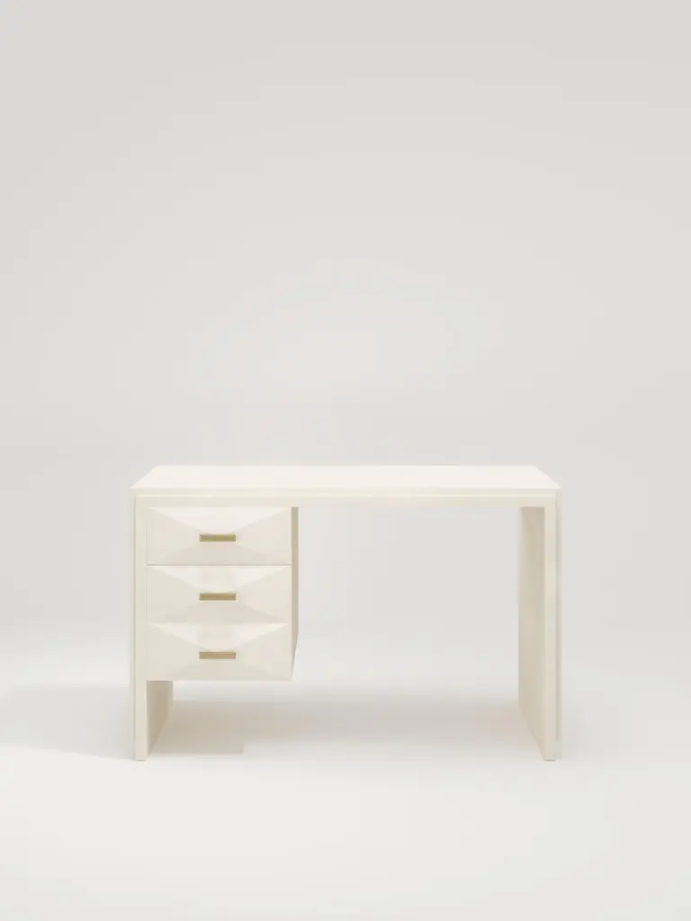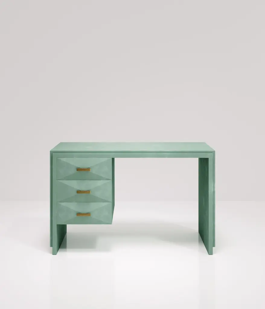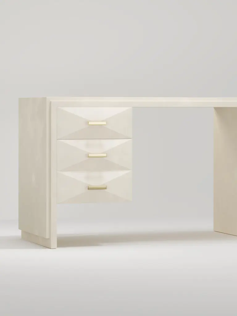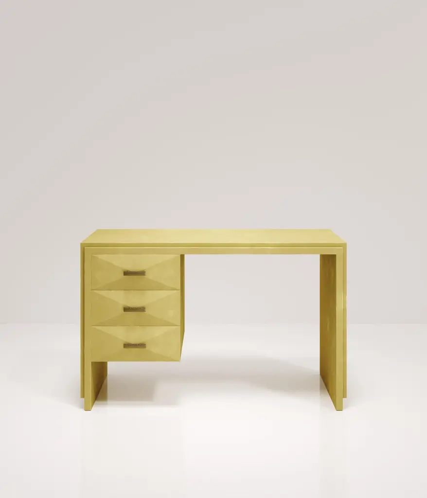 The Paris based label has distinguished themselves since their launch, with their iconic use of shagreen mixed with brass and other exotic materials. All furniture is handcrafted by skilled artisans, ultimately making each piece unique, designed in Paris and produced in the Philippines.The Iconic Writing Desk is both elegant and minimalist with its classic aesthetic that showcases the purity of the beautiful Augousti craftsmanship. This piece is completely inlaid in cream shagreen and includes 3 bevelled drawers on the left side of the desk with bronze patina brass handles. Available in other finishes and materials; see images at end of slide. A side table and chest of drawers version is also available, see images at end of slide. Custom color/sizing available on request.The finish of the shagreen is authentic as it is hand-dyed and the designer calls the finish look: "antique natural".The dimensions of this piece are 47" x 19" x 29".All R&Y Augousti pieces are handmade by artisans, ultimately making each piece unique. Wipe clean with soft dry cloth.Acclaimed design duo Ria & Yiouri Augousti have established themselves since the 1990s as pioneers of modern-vintage style through their luxurious Art Deco inspired collections.The Paris based label has distinguished themselves since their launch, with their iconic use of shagreen mixed with brass and other exotic materials. All furniture is handcrafted by skilled artisans, ultimately making each piece unique. All shagreen-covered items should be kept out of direct sunlight, color variants may occur on the stingray and other exotic finishes, but this showcases the Parisian label's commitment to creating authentic luxurious products using natural components.