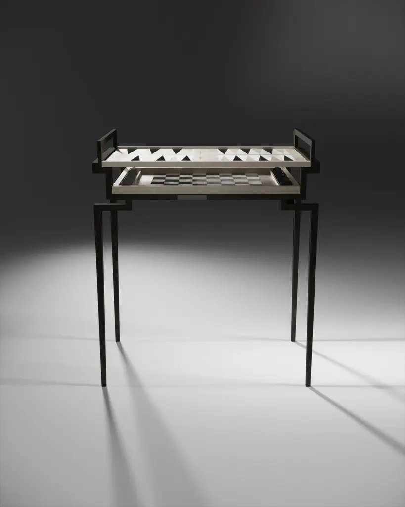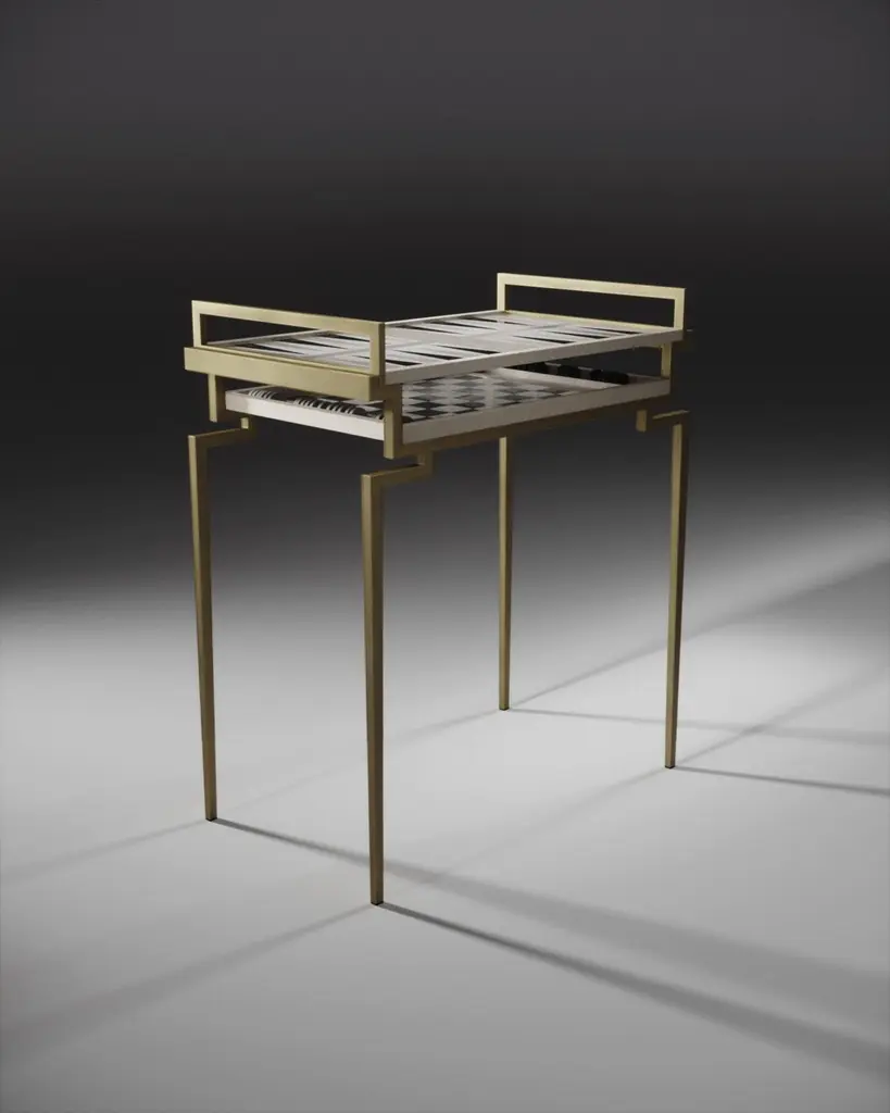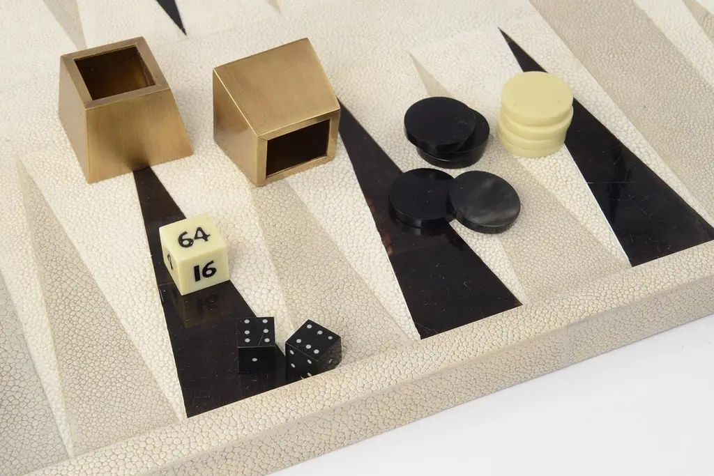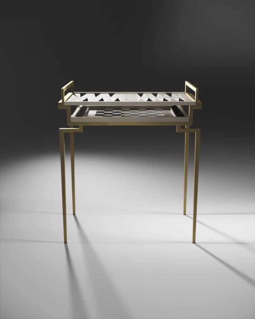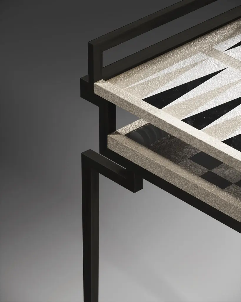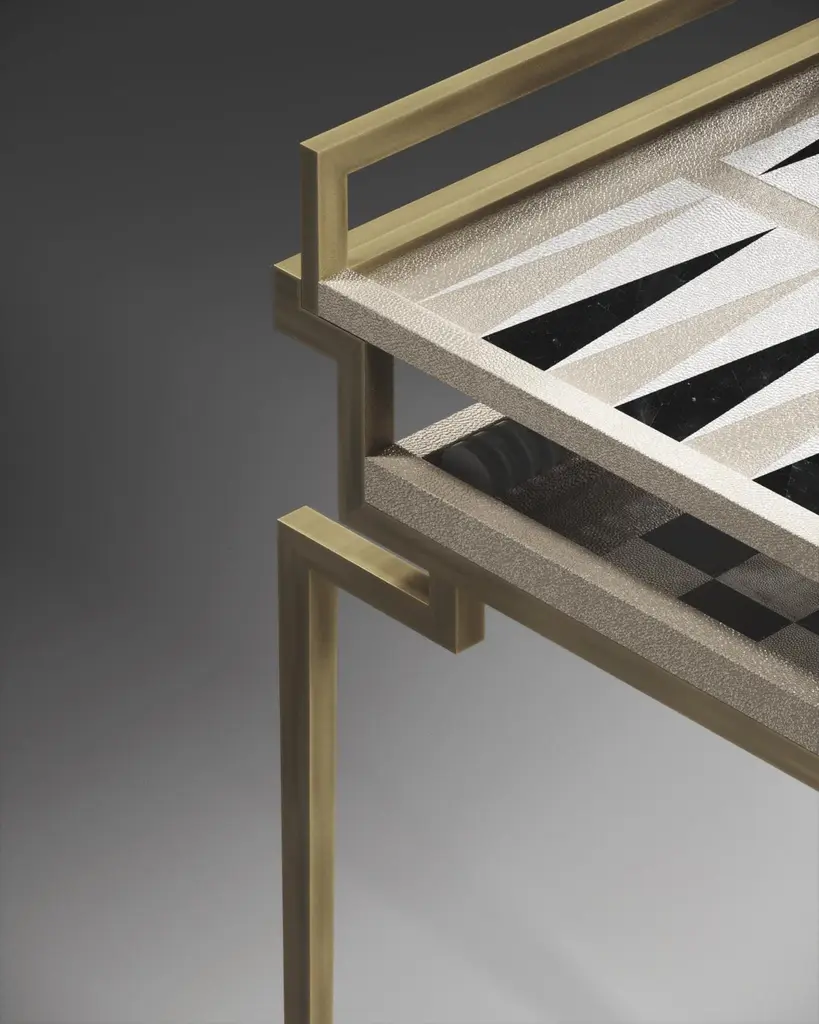 The Paris based label has distinguished themselves since their launch, with their iconic use of shagreen mixed with brass and other exotic materials. All furniture is handcrafted by skilled artisans, ultimately making each piece unique, designed in Paris and produced in the Philippines.The Cecelia game table by R&Y Augousti inlaid in a mixture of cream shagreen, black pen shell and brass is the ultimate luxury piece of furniture. The top tabletop tray is for backgammon and the bottom tabletop tray is for chess. Each tabletop tray is removable to allow versatility to the overall piece. Sold with all game chips and accessories needed for chess and backgammon. See color options for the games trays at end of image slide. Also available in black metal, see images at end of slide. Also available in black metal, see images at end of slide. The dimensions of this piece are 60 x 34 x 71 cmThe shagreen is hand-dyed by artisans and the designer calls this finish 'antique natural' shagreen.All R&Y Augousti pieces are handmade by artisans, ultimately making each piece unique. Custom color/sizing available on request. Wipe clean with soft dry cloth.Acclaimed design duo Ria & Yiouri Augousti have established themselves since the 1990s as pioneers of modern-vintage style through their luxurious Art Deco inspired collections.The Paris based label has distinguished themselves since their launch, with their iconic use of shagreen mixed with brass and other exotic materials. All furniture is handcrafted by skilled artisans, ultimately making each piece unique.All shagreen-covered items should be kept out of direct sunlight, color variants may occur on the stingray and other exotic finishes, but this showcases the Parisian label's commitment to creating authentic luxurious products using natural components.