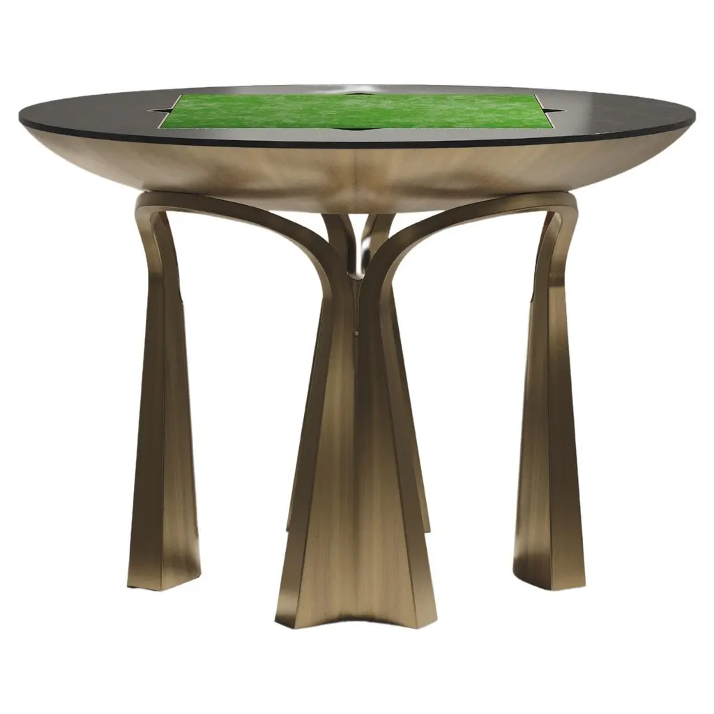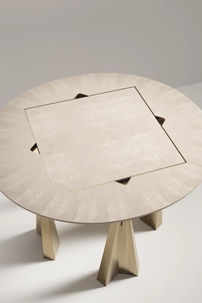 The Paris based label has distinguished themselves since their launch, with their iconic use of shagreen mixed with brass and other exotic materials. All furniture is handcrafted by skilled artisans, ultimately making each piece unique, designed in Paris and produced in the Philippines.The 4 in 1 Arche game table R&Y Augousti is a truly luxurious statement piece for your home. The clean lines of the overall piece in cream shagreen, accentuated by the sculptural and cut out bronze-patina brass base make it versatile for any space. This piece includes a complete game package set with interchangeable boards that stack on top of each other in the centre of the table; one for chess, one for backgammon backgammon, a green velvet bard to play your favourite card games and a plain shagreen board if one were to use it as a beautiful centre piece. The piece also includes a shagreen box lined with a velvet interior to store your chess and backgammon pieces. All the above are stored and stacked in the table with the last board piece being flushed in line with the tabletop. Four triangle grooves are on the side of the board's central location on the tabletop to facilitate changing and removing each board. Available in other finishes, see images at end of slide.The finish of the shagreen is authentic as it is hand-dyed by our artisans. The dimensions of this piece are 110 dia x 75 cmAll R&Y Augousti pieces are handmade by artisans, ultimately making each piece unique. Wipe clean with soft dry cloth.Acclaimed design duo Ria & Yiouri Augousti have established themselves since the 1990s as pioneers of modern-vintage style through their luxurious Art Deco inspired collections.The Paris based label has distinguished themselves since their launch, with their iconic use of shagreen mixed with brass and other exotic materials. All furniture is handcrafted by skilled artisans, ultimately making each piece unique. All shagreen-covered items should be kept out of direct sunlight, color variants may occur on the stingray and other exotic finishes, but this showcases the Parisian label's commitment to creating authentic luxurious products using natural components.