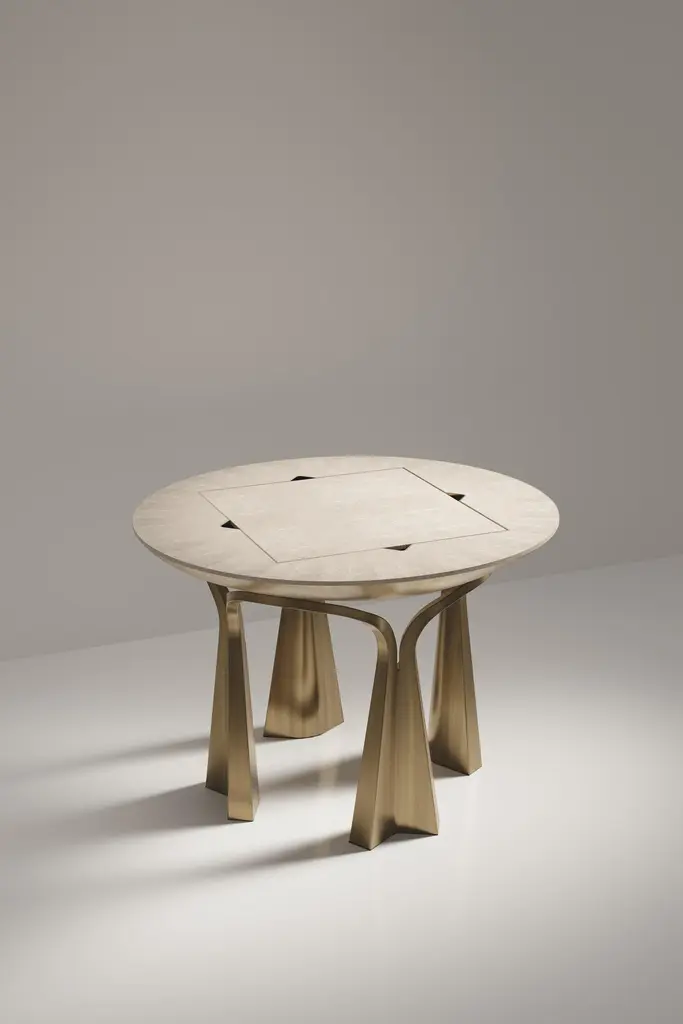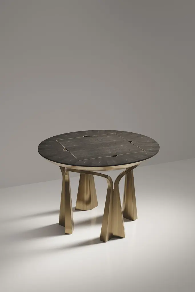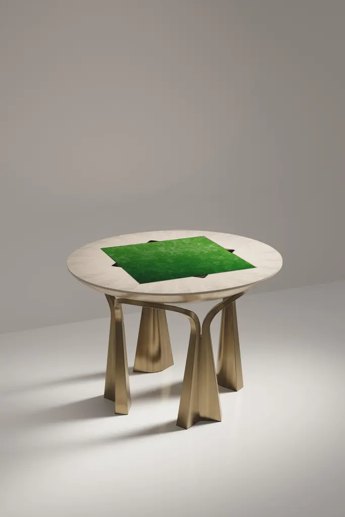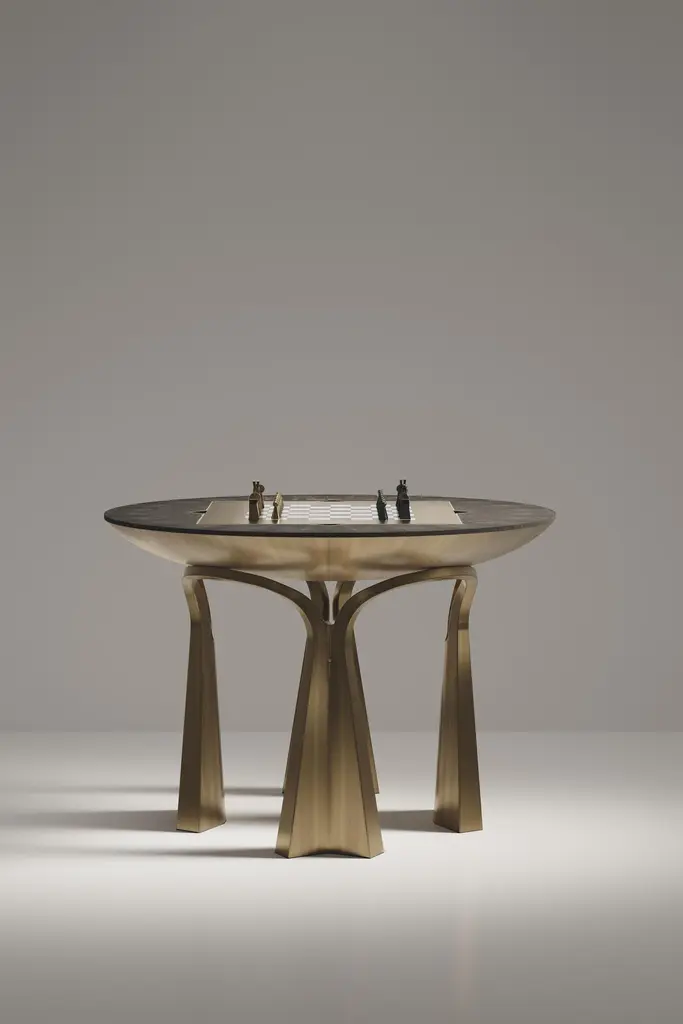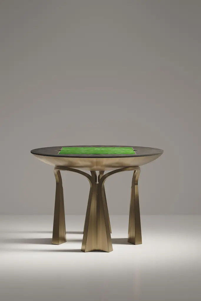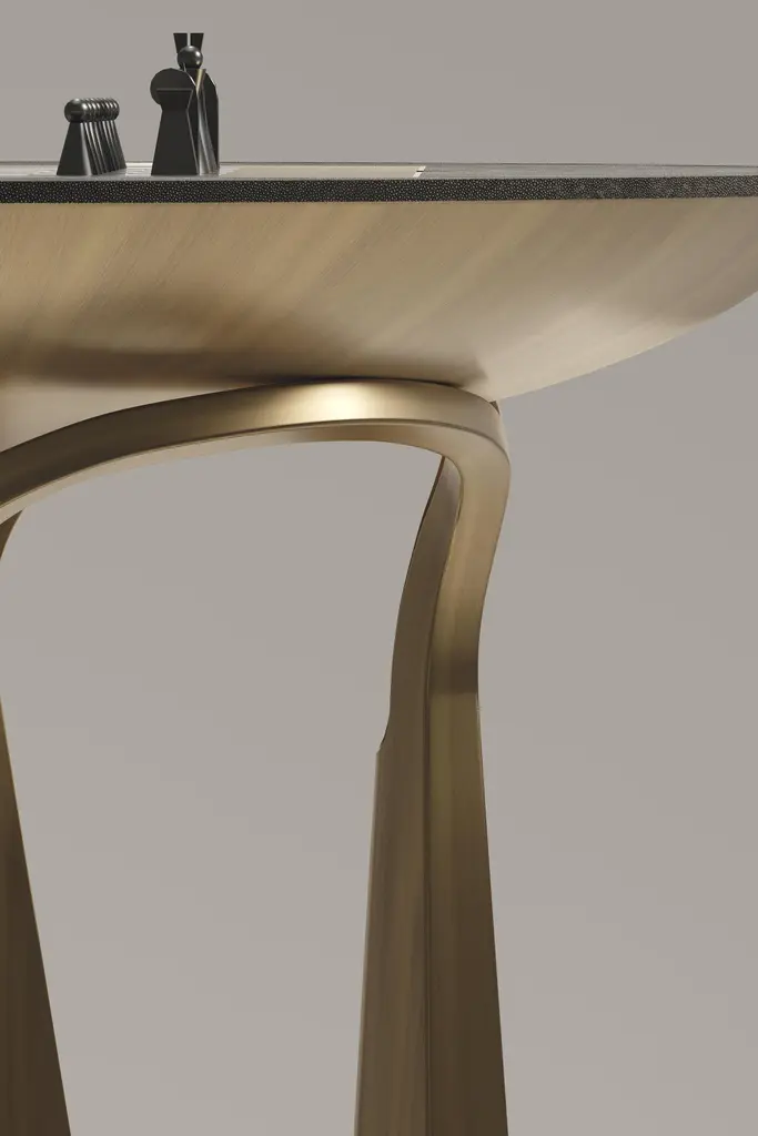 The Paris based label has distinguished themselves since their launch, with their iconic use of shagreen mixed with brass and other exotic materials. All furniture is handcrafted by skilled artisans, ultimately making each piece unique, designed in Paris and produced in the Philippines.The 4 in 1 Arche game table R&Y Augousti is a truly luxurious statement piece for your home. The clean lines of the overall piece in coal black shagreen, accentuated by the sculptural and cut out bronze-patina brass base make it versatile for any space. This piece includes a complete game package set with interchangeable boards that stack on top of each other in the centre of the table; one for chess, one for backgammon backgammon, a green velvet bard to play your favourite card games and a plain shagreen board if one were to use it as a beautiful centre piece. The piece also includes a shagreen box lined with a velvet interior to store your chess and backgammon pieces. All the above are stored and stacked in the table with the last board piece being flushed in line with the tabletop. Four triangle grooves are on the side of the board's central location on the tabletop to facilitate changing and removing each board. Available in other finishes, see images at end of slide.The finish of the shagreen is authentic as it is hand-dyed by our artisans. The dimensions of this piece are 110 dia x 75 cmAll R&Y Augousti pieces are handmade by artisans, ultimately making each piece unique. Wipe clean with soft dry cloth.Acclaimed design duo Ria & Yiouri Augousti have established themselves since the 1990s as pioneers of modern-vintage style through their luxurious Art Deco inspired collections.The Paris based label has distinguished themselves since their launch, with their iconic use of shagreen mixed with brass and other exotic materials. All furniture is handcrafted by skilled artisans, ultimately making each piece unique. All shagreen-covered items should be kept out of direct sunlight, color variants may occur on the stingray and other exotic finishes, but this showcases the Parisian label's commitment to creating authentic luxurious products using natural components.