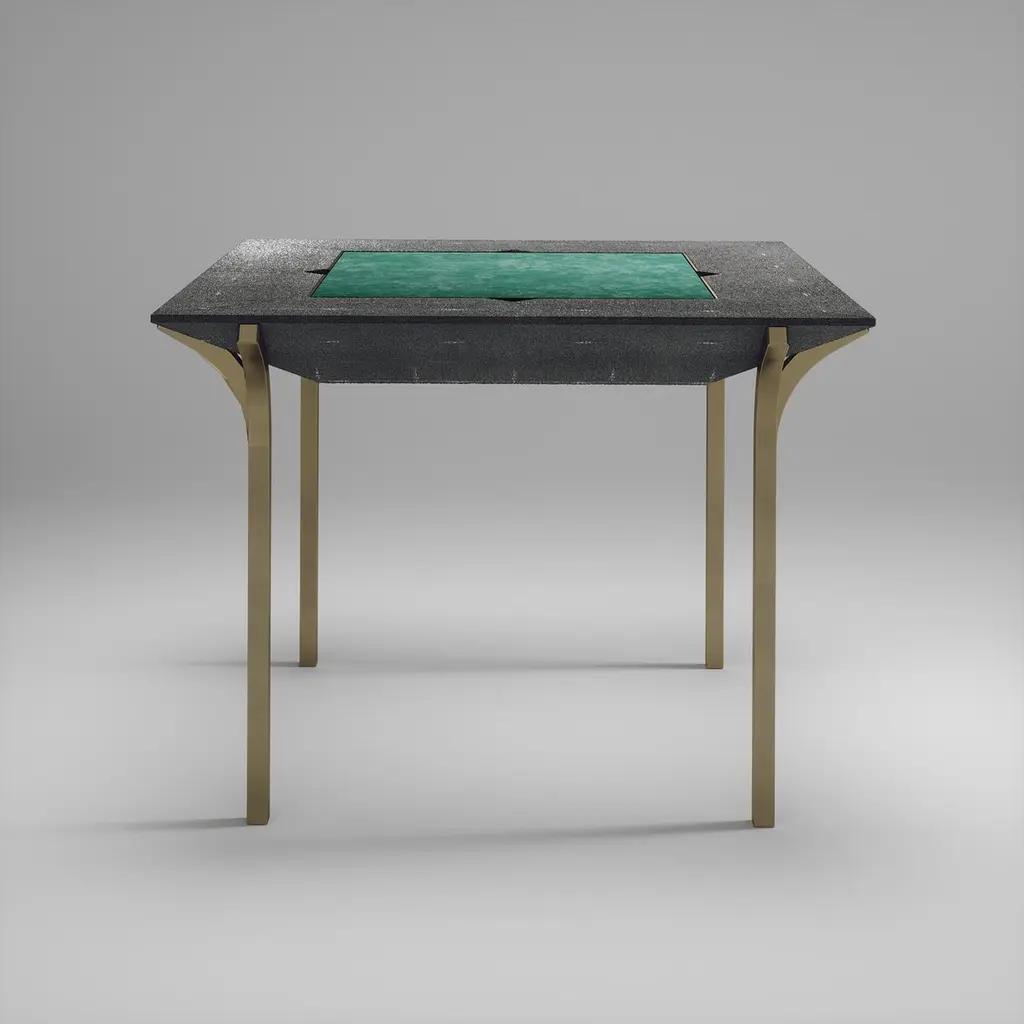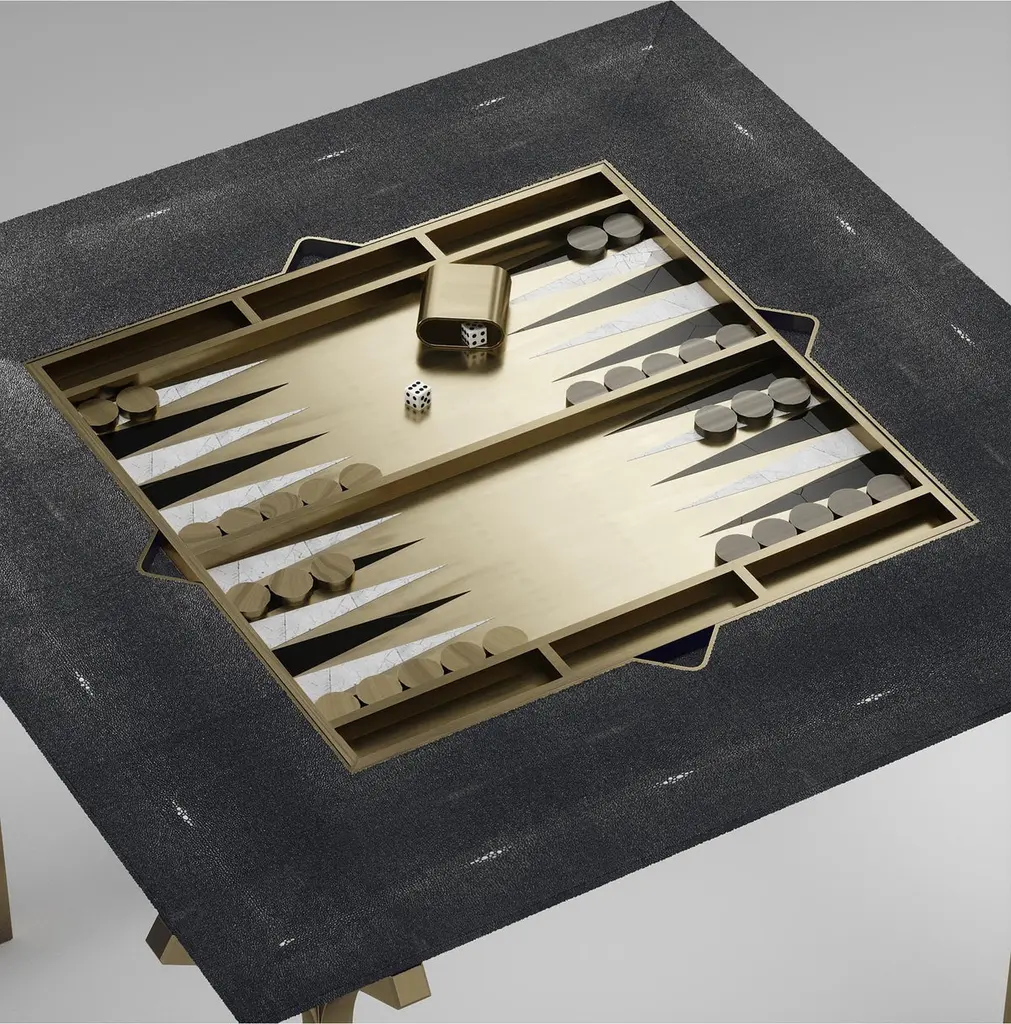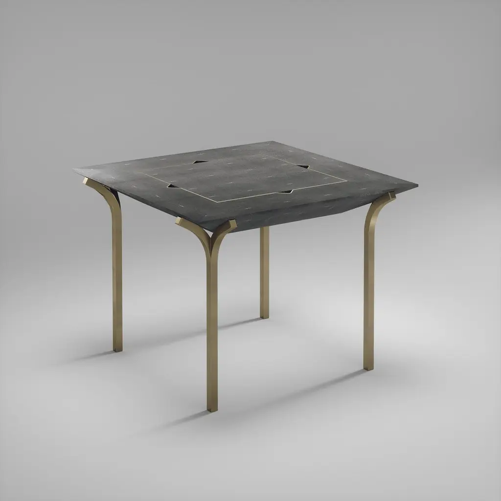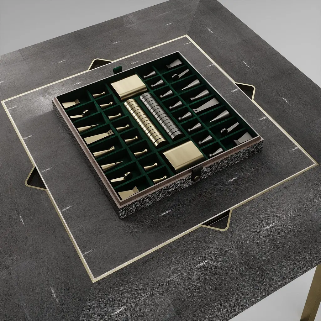 The Paris based label has distinguished themselves since their launch, with their iconic use of shagreen mixed with brass and other exotic materials. All furniture is handcrafted by skilled artisans, ultimately making each piece unique, designed in Paris and produced in the Philippines.The 4 in 1 Marcel Game table R&Y Augousti is a truly luxurious statement piece for your home. The clean lines of the overall piece in coal black shagreen, accentuated by the sculptural and sleek chrome finish polished stainless steel legs make it versatile for any space. This piece includes a complete game package set with interchangeable boards that stack on top of each other in the centre of the table; one for chess, one for backgammon, a green velvet bard to play your favourite card games and a plain shagreen board if one were to use it as a beautiful centre piece. The piece also includes a shagreen box lined with a velvet interior to store your chess and backgammon pieces. All the above are stored and stacked in the table with the last board piece being flushed in line with the tabletop. Four triangle grooves are on the side of the board's central location on the tabletop to facilitate changing and removing each board. Available in other finishes and as a part of a game table series, see images at end of slide.The finish of the shagreen is authentic as it is hand-dyed by our artisans. The dimensions of this piece are 100 x 100 x 75 cmAll R&Y Augousti pieces are handmade by artisans, ultimately making each piece unique. Wipe clean with soft dry cloth.Acclaimed design duo Ria & Yiouri Augousti have established themselves since the 1990s as pioneers of modern-vintage style through their luxurious Art Deco inspired collections.The Paris based label has distinguished themselves since their launch, with their iconic use of shagreen mixed with brass and other exotic materials. All furniture is handcrafted by skilled artisans, ultimately making each piece unique. All shagreen-covered items should be kept out of direct sunlight, color variants may occur on the stingray and other exotic finishes, but this showcases the Parisian label's commitment to creating authentic luxurious products using natural components.