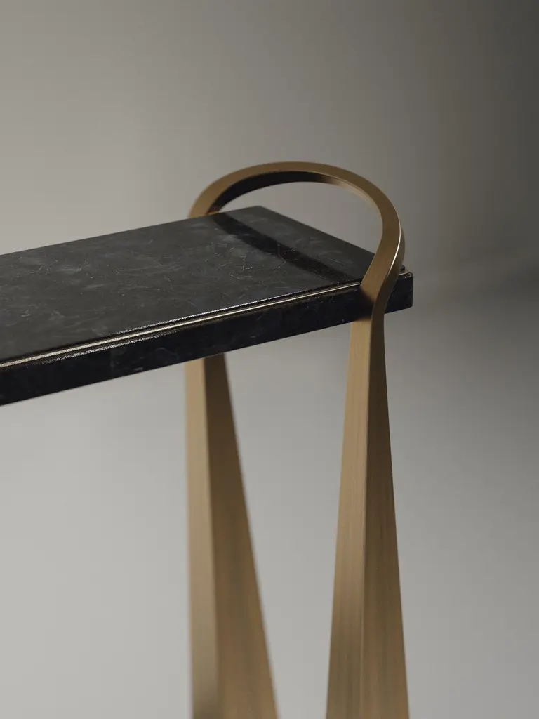 The Paris based label has distinguished themselves since their launch, with their iconic use of shagreen mixed with brass and other exotic materials. All furniture is handcrafted by skilled artisans, ultimately making each piece unique, designed in Paris and produced in the Philippines.The Arche Console table by R&Y Augousti is a stunning piece, a statement in any space. The black shagreen inlaid top is nestled in between a pair of bronze-patina brass sculptural cutout "arched" legs. This design also exists on a side table, breakfast table and game table version, see images at end of slide. The dimensions of this piece are 155.8 x 43 x 98.3 cmAll R&Y Augousti pieces are handmade by artisans, ultimately making each piece unique.Custom color/sizing available on request.Wipe clean with soft dry cloth. Acclaimed design duo Ria & Yiouri Augousti have established themselves since the 1990’s as pioneers of modern-vintage style through their luxurious art-deco inspired collections.The Paris based label has distinguished themselves since their launch, with their iconic use of shagreen mixed with brass and other exotic materials. All furniture is handcrafted by skilled artisans, ultimately making each piece unique. All shagreen-covered items should be kept out of direct sunlight, color variants may occur on the stingray and other exotic finishes, but this showcases the Parisian label's commitment to creating authentic luxurious products using natural components.