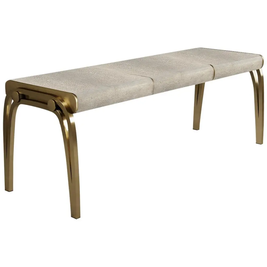 The Paris based label has distinguished themselves since their launch, with their iconic use of shagreen mixed with brass and other exotic materials. All furniture is handcrafted by skilled artisans, ultimately making each piece unique, designed in Paris and produced in the Philippines.The Arche Console table by R&Y Augousti is a stunning piece, a statement in any space. The cream shagreen inlaid top is nestled in between a pair of bronze-patina brass sculptural cutout "arched" legs. This design also exists on a side table, breakfast table and game table version, see images at end of slide. The dimensions of this piece are 155.8 x 43 x 98.3 cmAll R&Y Augousti pieces are handmade by artisans, ultimately making each piece unique.Custom color/sizing available on request.Wipe clean with soft dry cloth. Acclaimed design duo Ria & Yiouri Augousti have established themselves since the 1990’s as pioneers of modern-vintage style through their luxurious art-deco inspired collections.The Paris based label has distinguished themselves since their launch, with their iconic use of shagreen mixed with brass and other exotic materials. All furniture is handcrafted by skilled artisans, ultimately making each piece unique. All shagreen-covered items should be kept out of direct sunlight, color variants may occur on the stingray and other exotic finishes, but this showcases the Parisian label's commitment to creating authentic luxurious products using natural components.